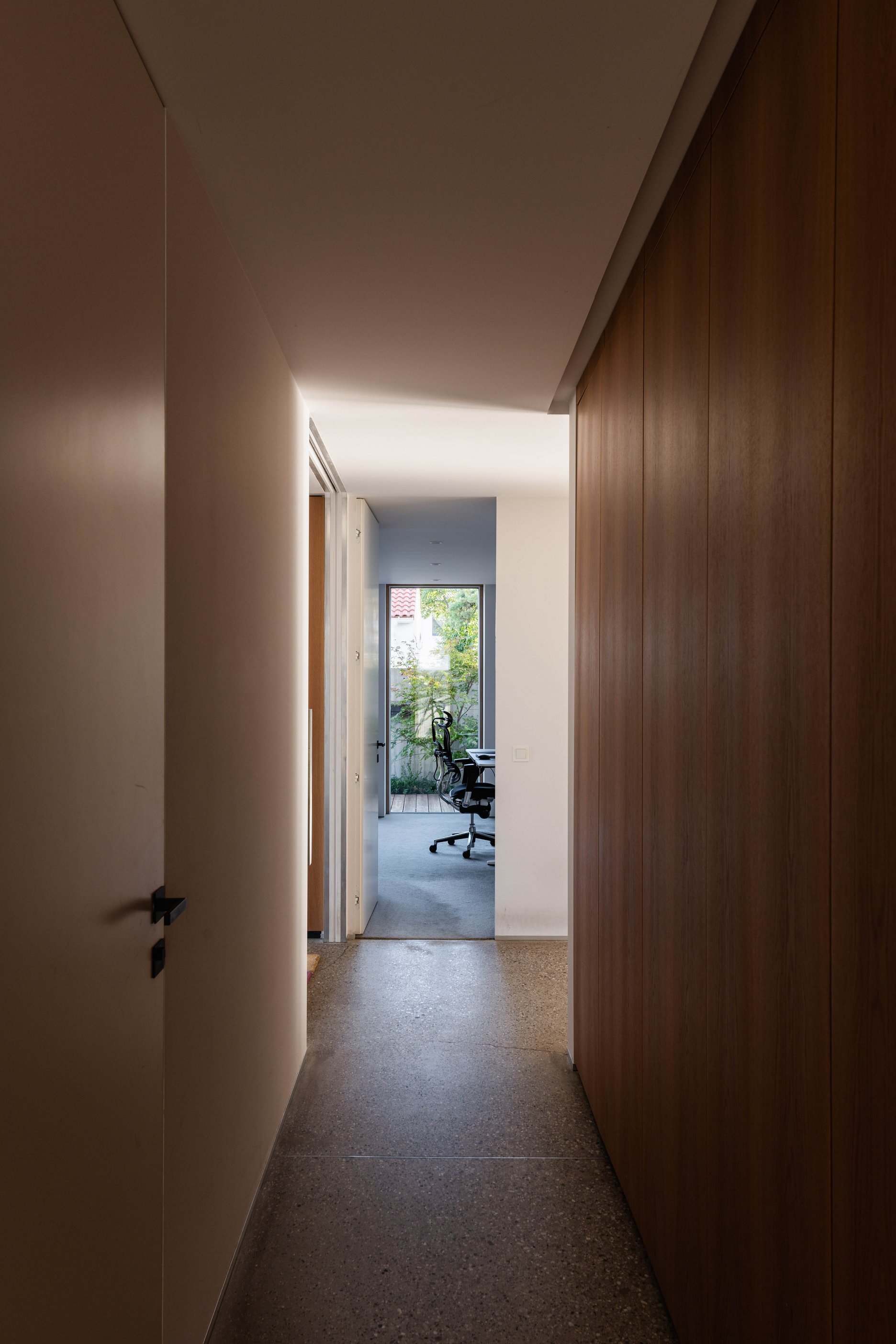 Hlavný obytný priestor so záhradou bezbariérovo prepájajú posuvné segmenty rozsiahleho zasklenia. Od momentu prekročenia prahu tak možno vnímať spojenie so zeleňou, bez rušivých aspektov bývania v klasickej radovej zástavbe.