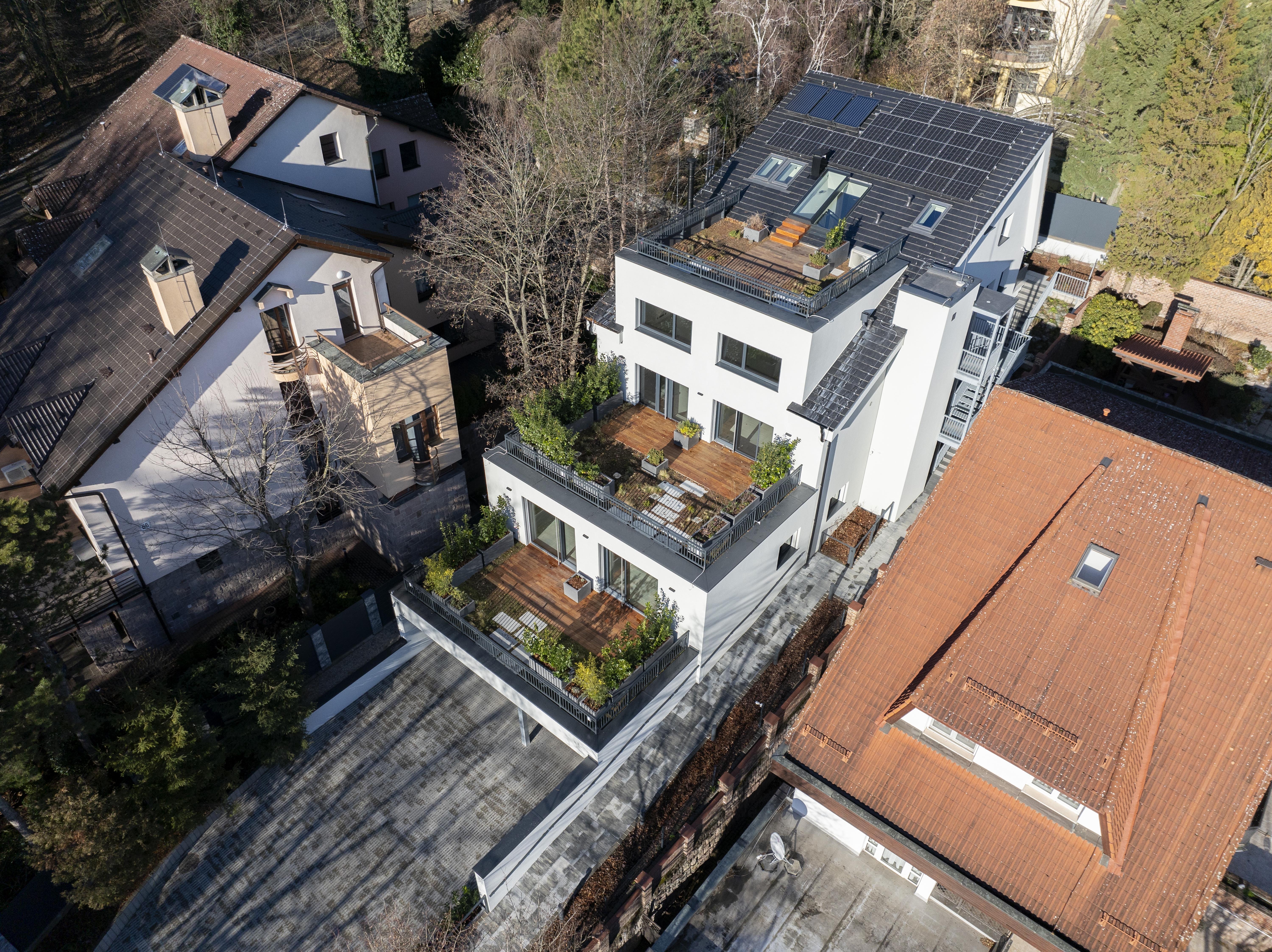 Dažďová voda sa zachytáva v retenčnej nádrži a slúži na automatické zavlažovanie zelene na pozemku aj terasách. Všetky terasy majú extenzívne zelené vrstvy doplnené vegetáciou v kvetináčoch. Riešenie znižuje prehrievanie konštrukcií a zadržiava zrážkovú vodu priamo na pozemku.