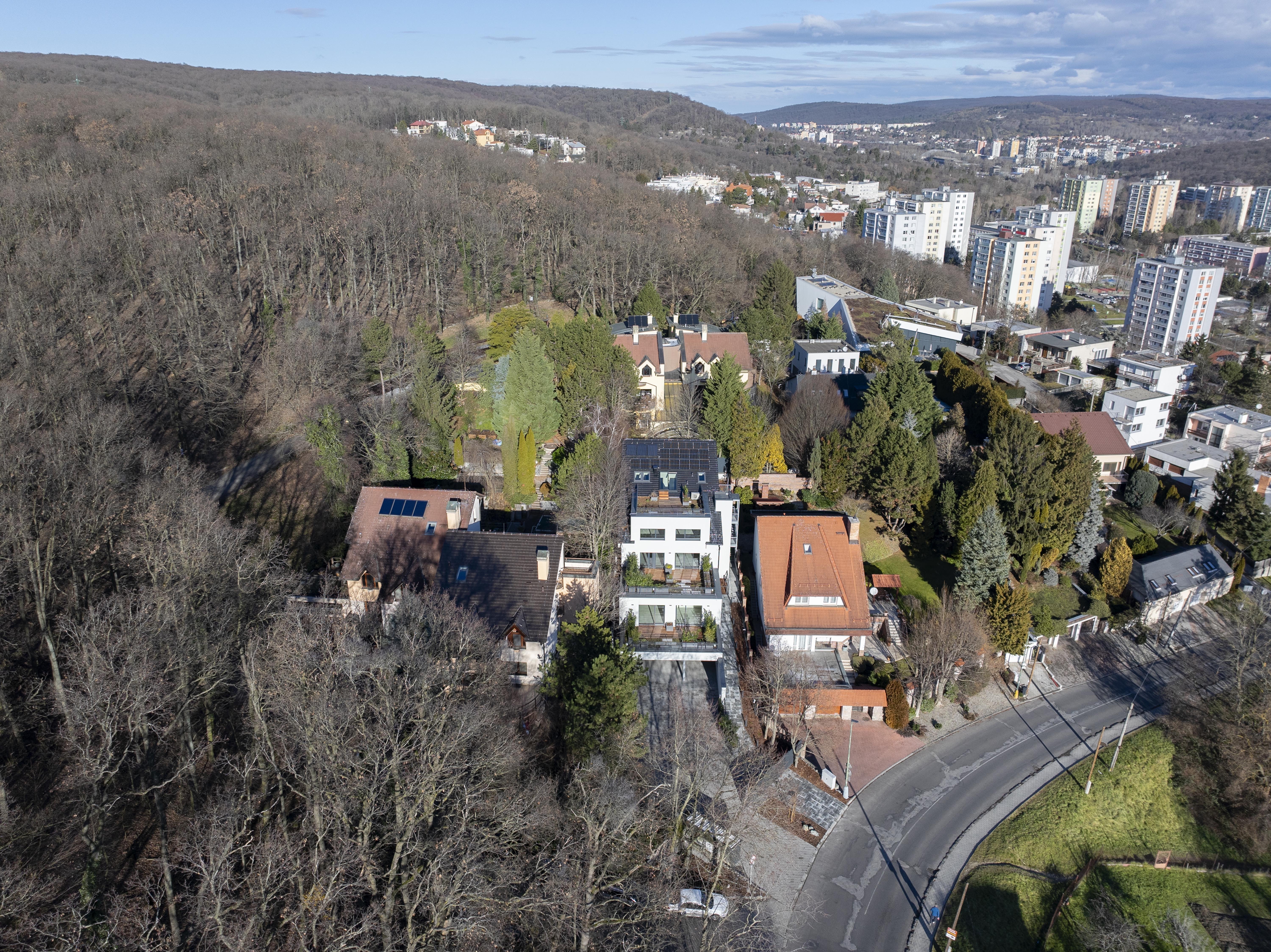 Dom sa nachádza v zástavbe rodinných domov v dotyku s Jezuitským lesom. Výrazne svahovitý pozemok je orientovaný v osi sever–juh. Klienti požadovali tri samostatné byty a výrazné zníženie bariér. Keďže územie je v územnom pláne vedené ako stabilizované, návrh sa viackrát upravoval v koordinácii s magistrátom a mestskou časťou tak, aby rešpektoval limity aj charakter lokality.