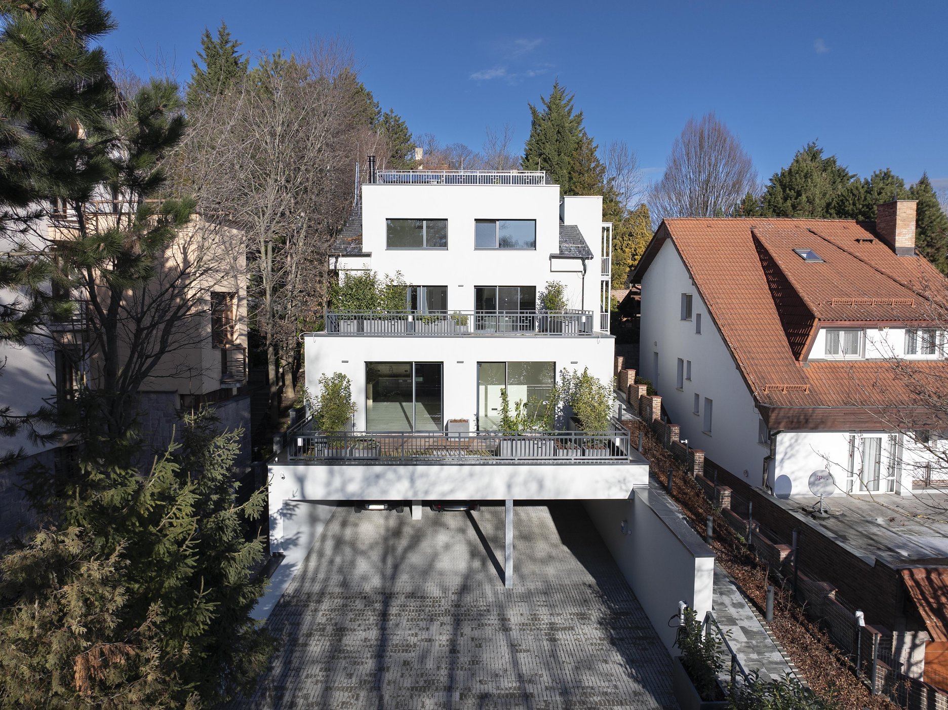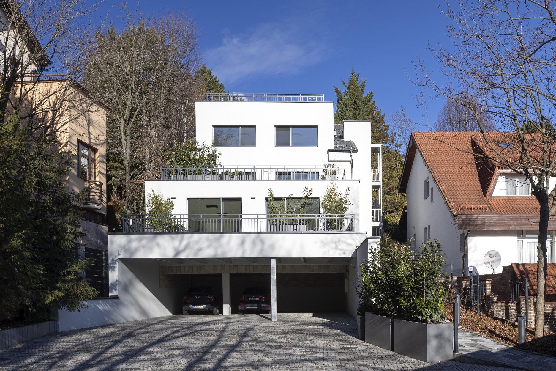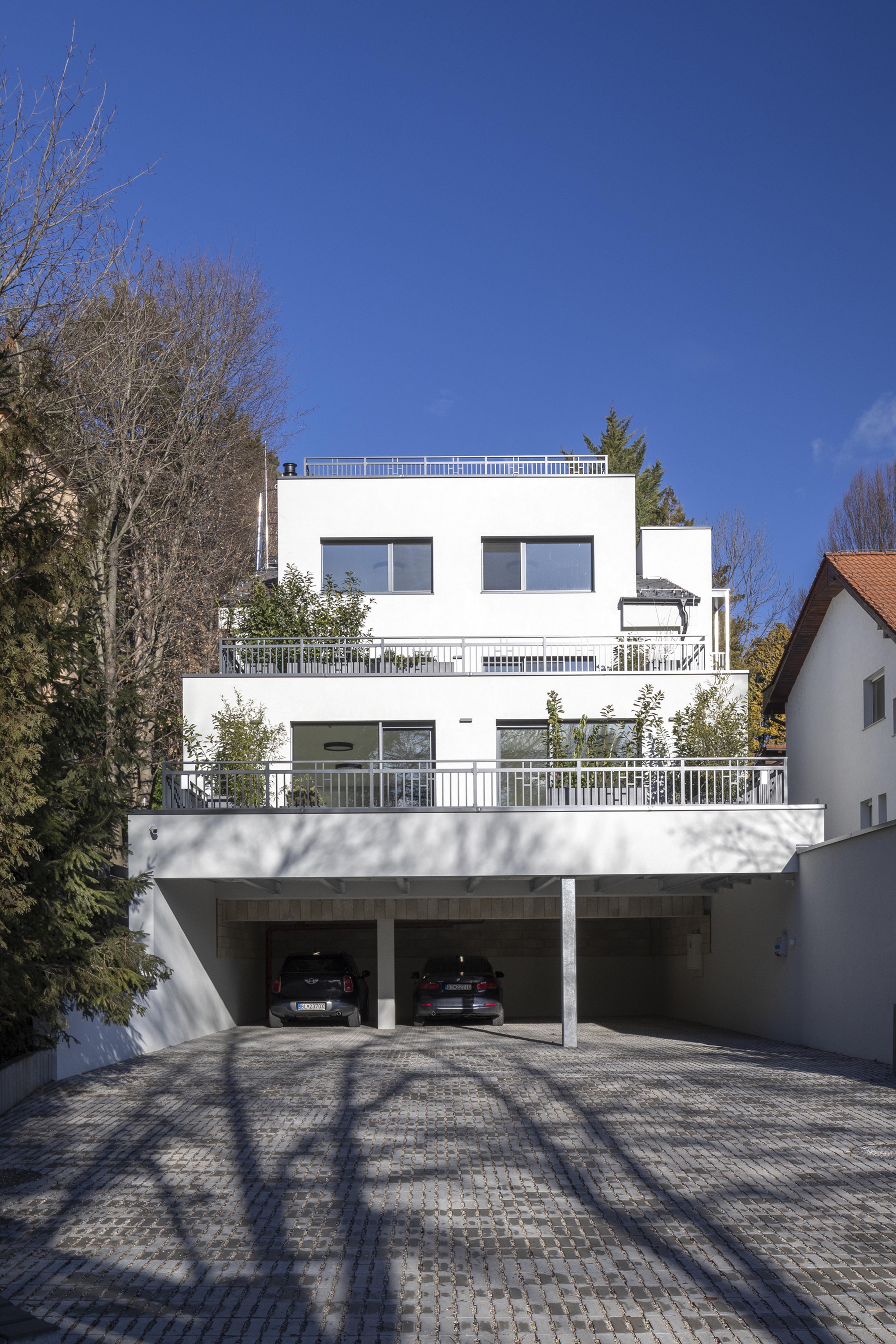 Parkovanie bolo vyriešené kombináciou podzemných a terénnych stojísk: pod objektom pribudlo podzemné podlažie s komfortnými garážovými miestami; ďalšie parkovanie je pred domom na spevnených plochách z drenážnej dlažby.