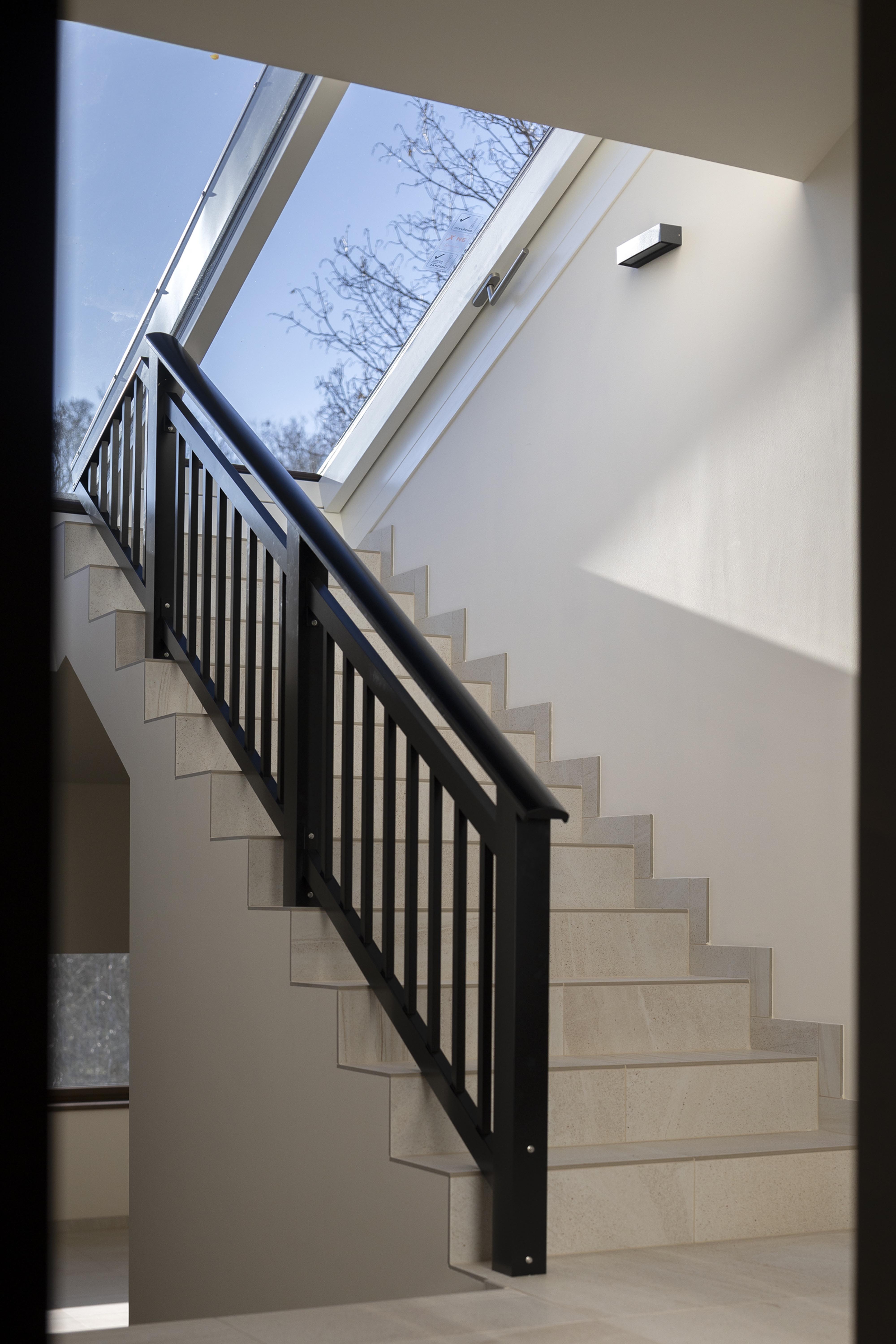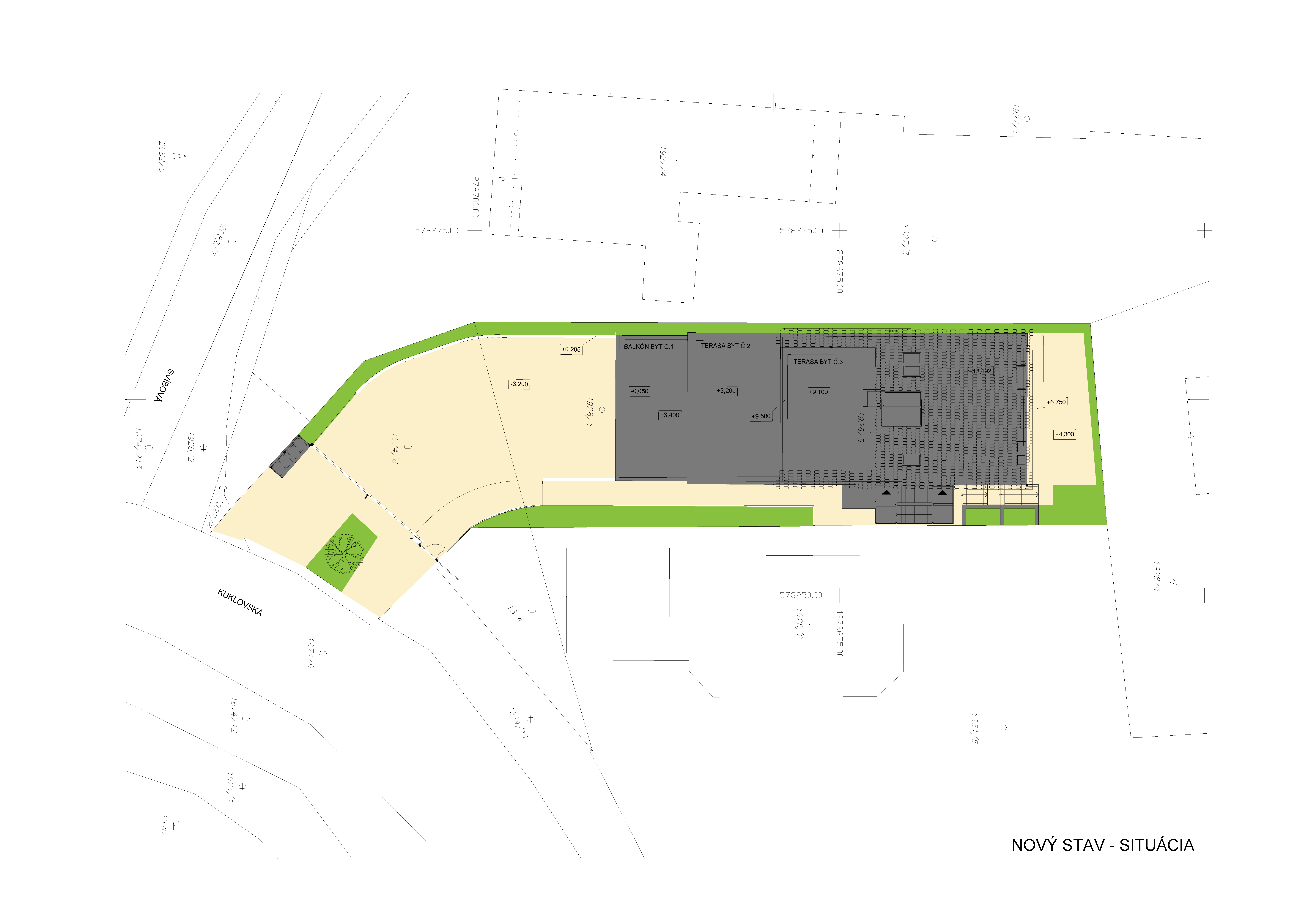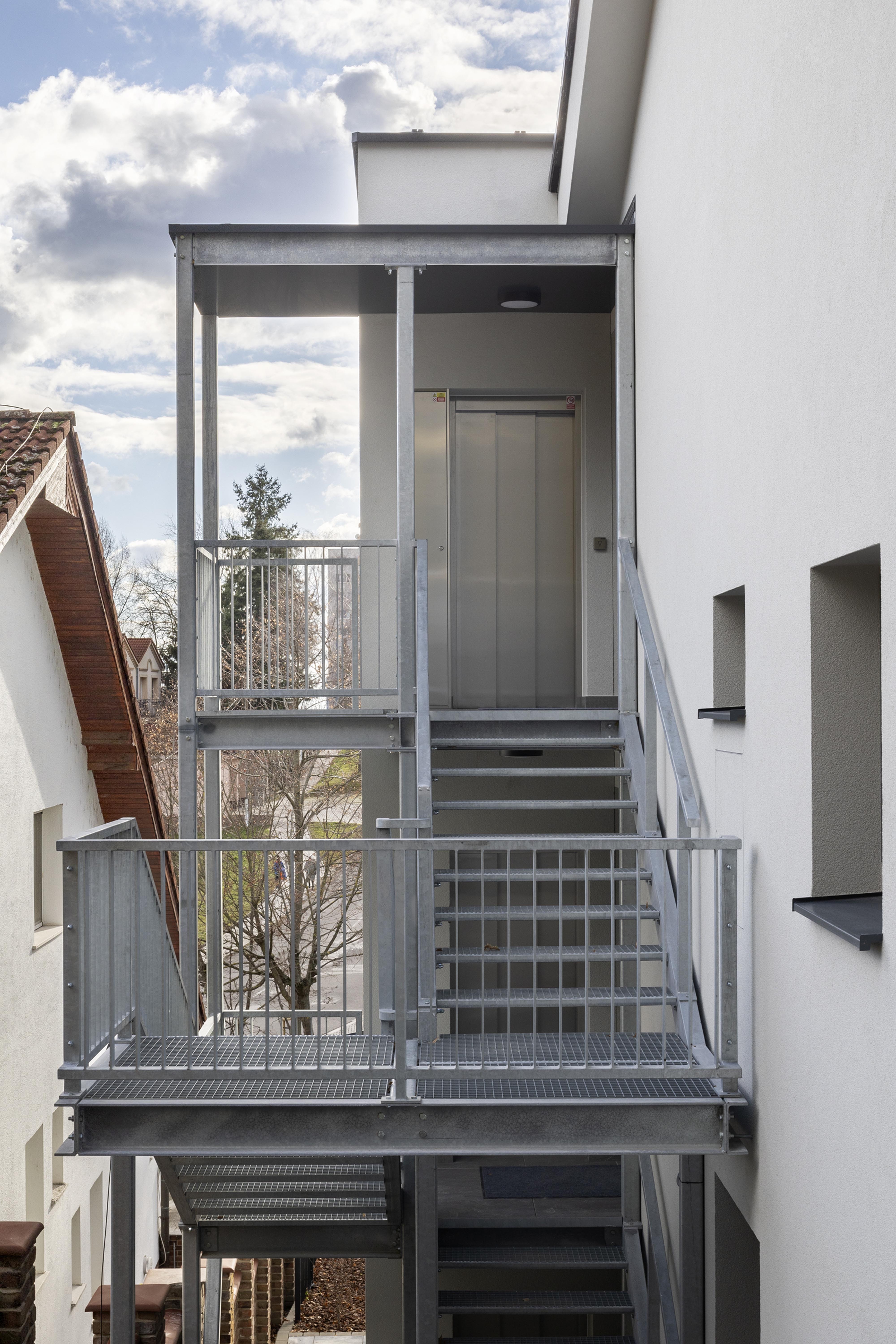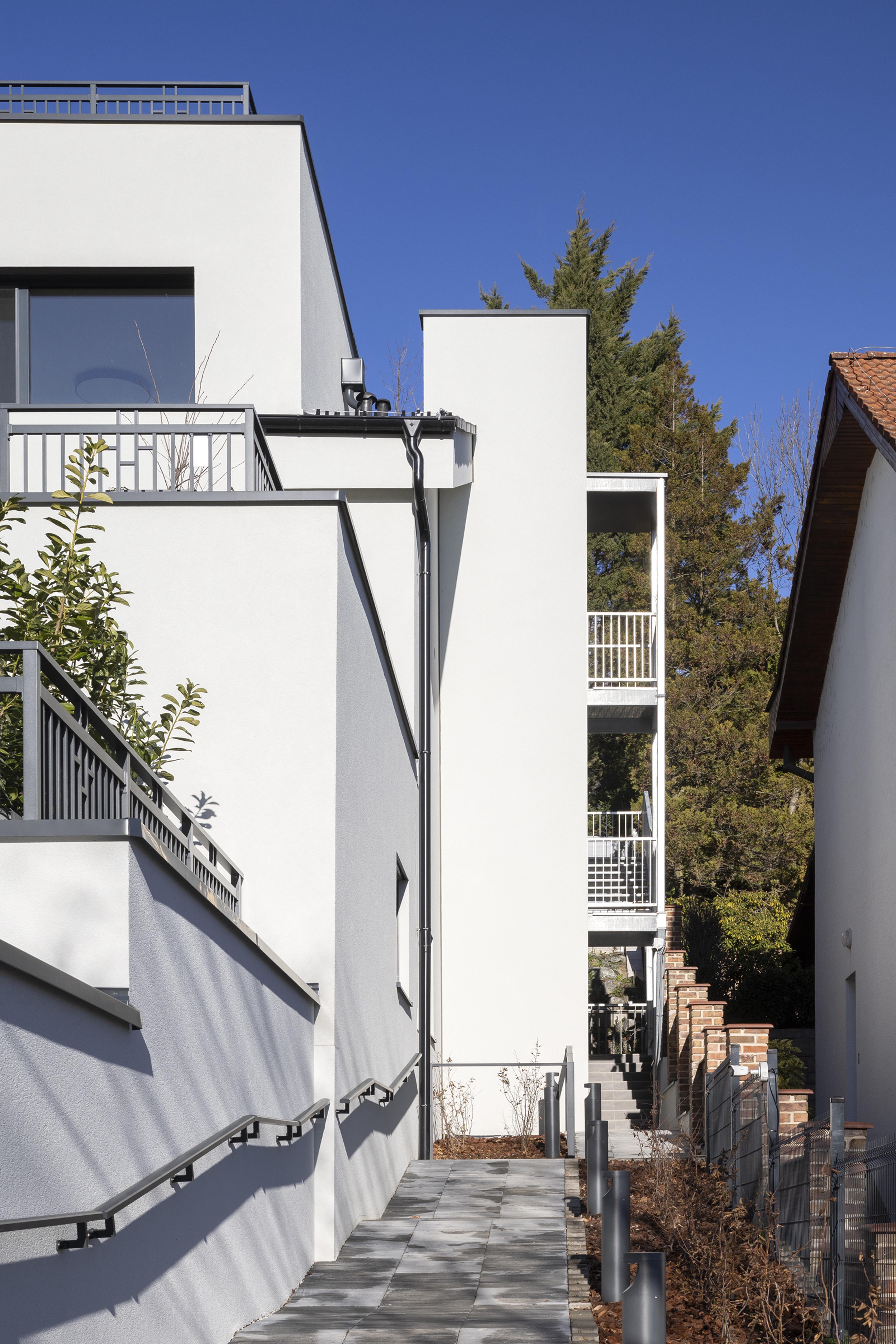 Nové exteriérové schodisko s výťahom je umiestnené na východnej fasáde, so vstupmi do bytov situovanými v strede dispozícií. Prístup k vertikálnej komunikácii je zo spodnej časti pozemku po bezbariérovej vyhrievanej rampe.