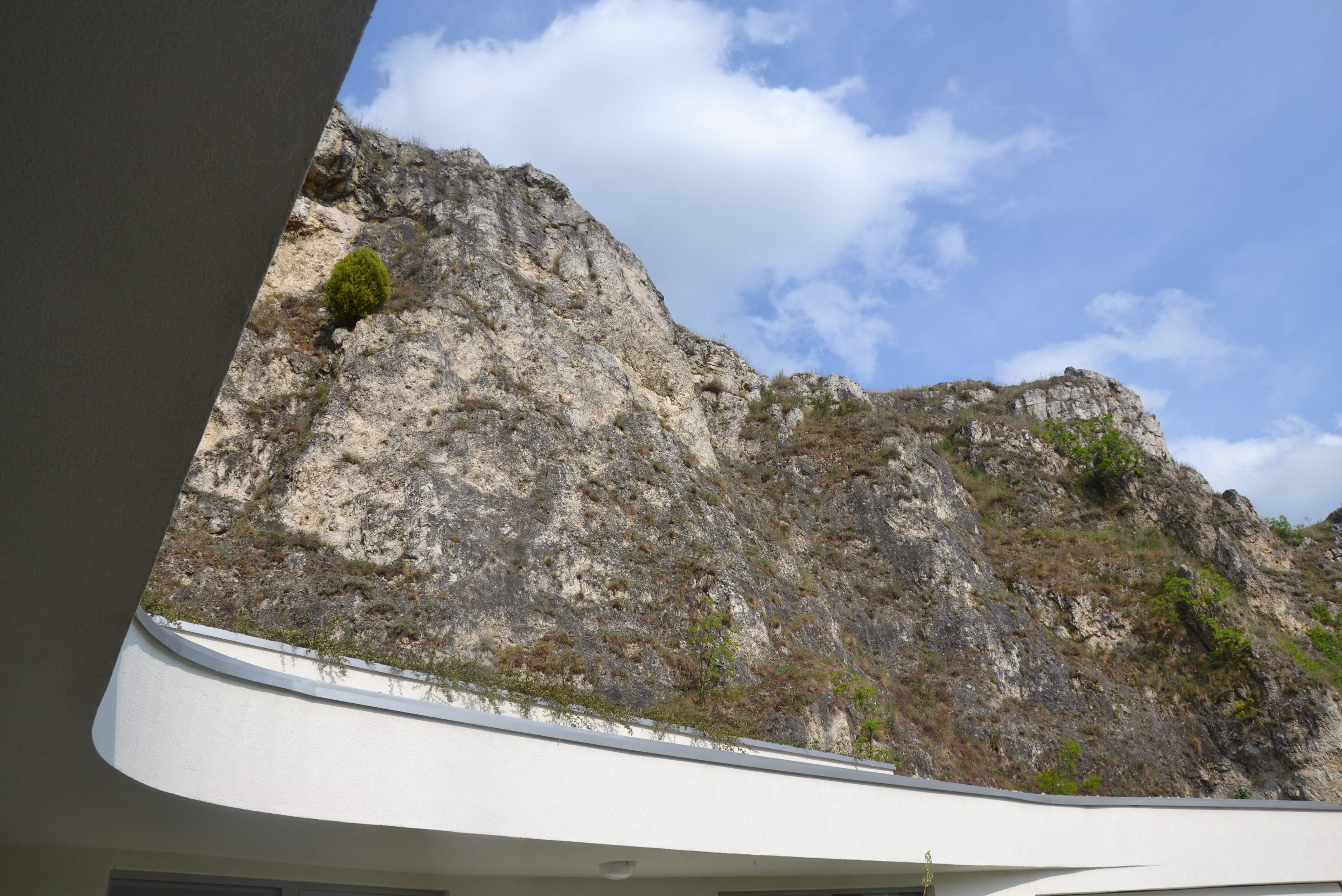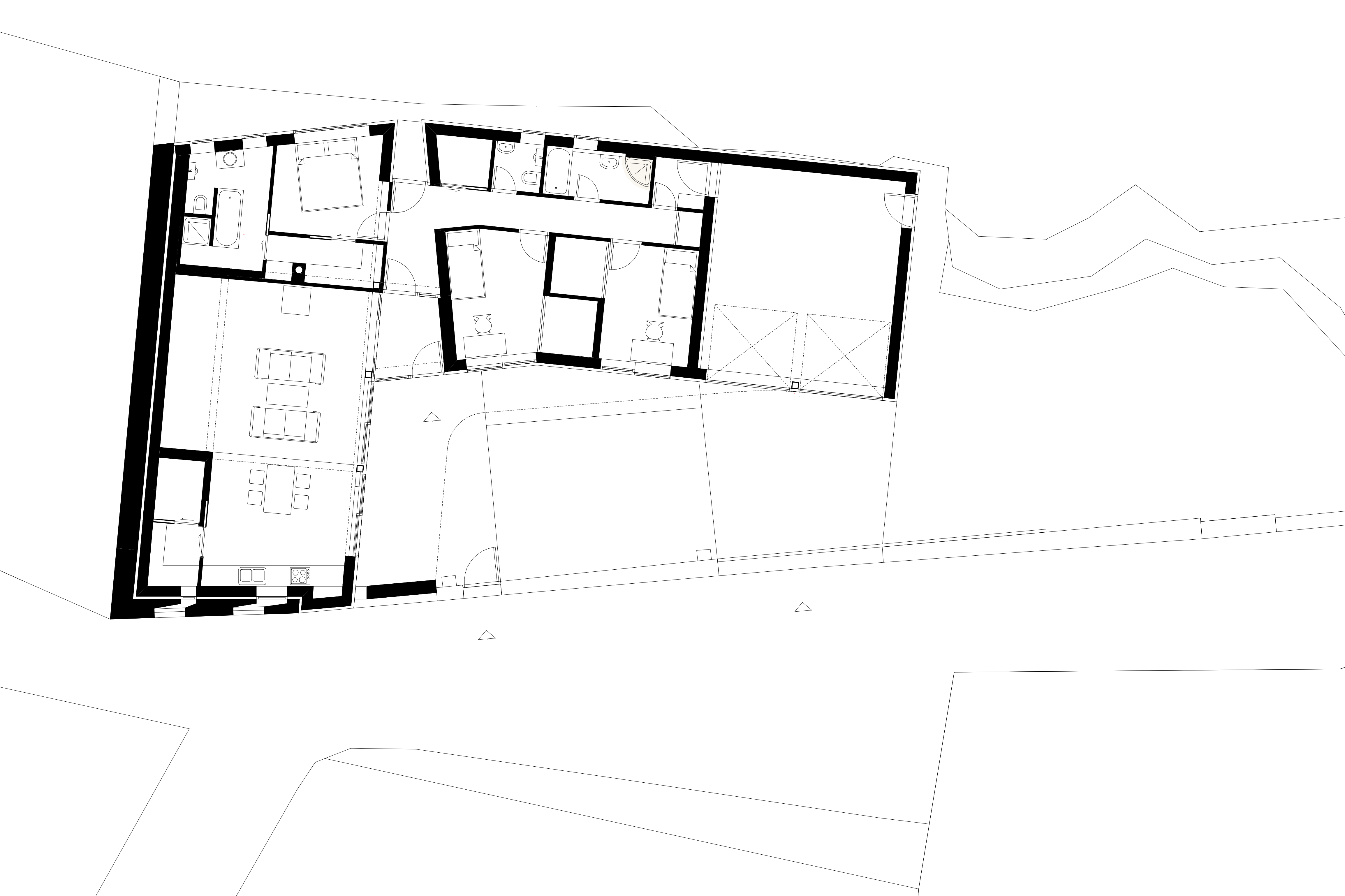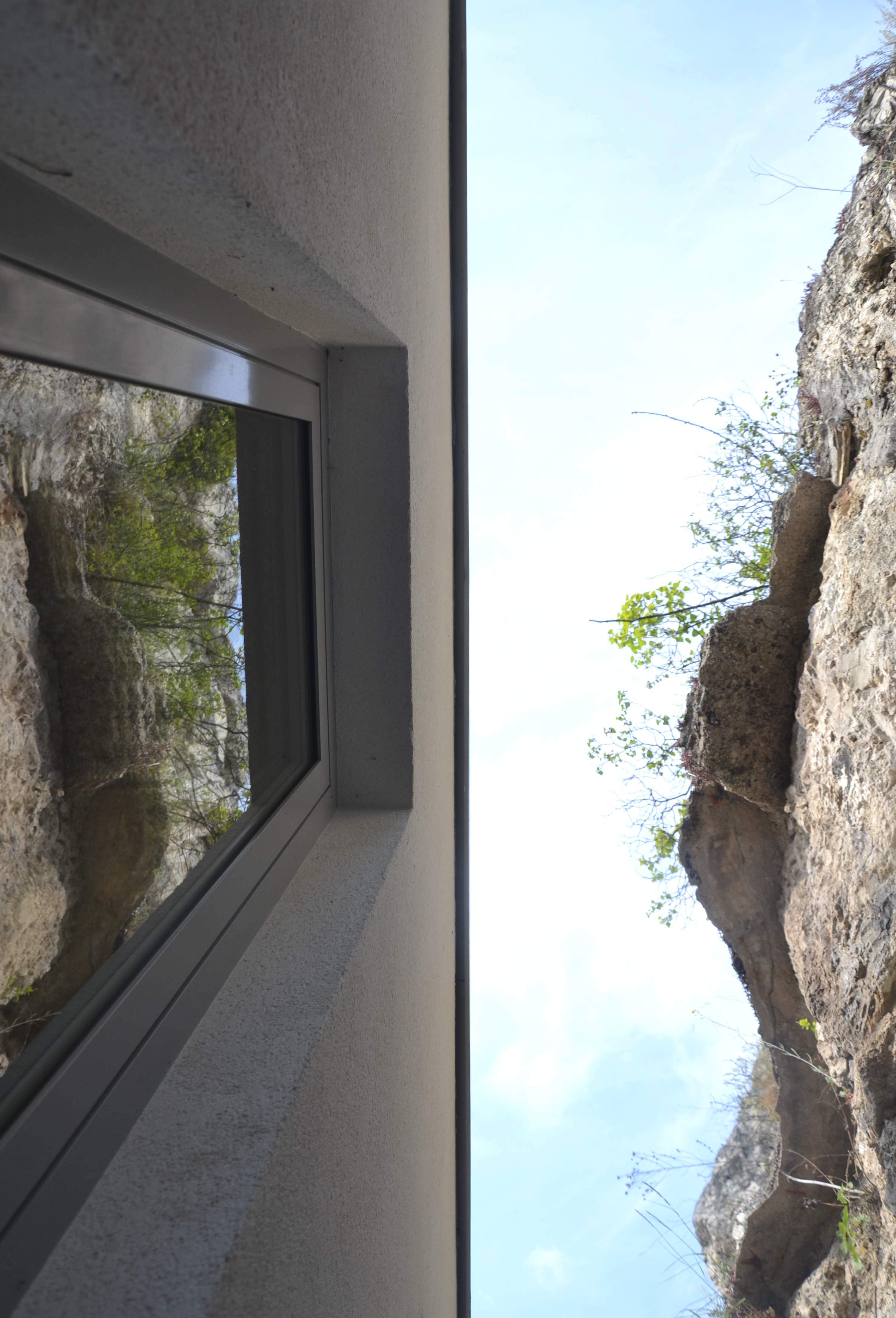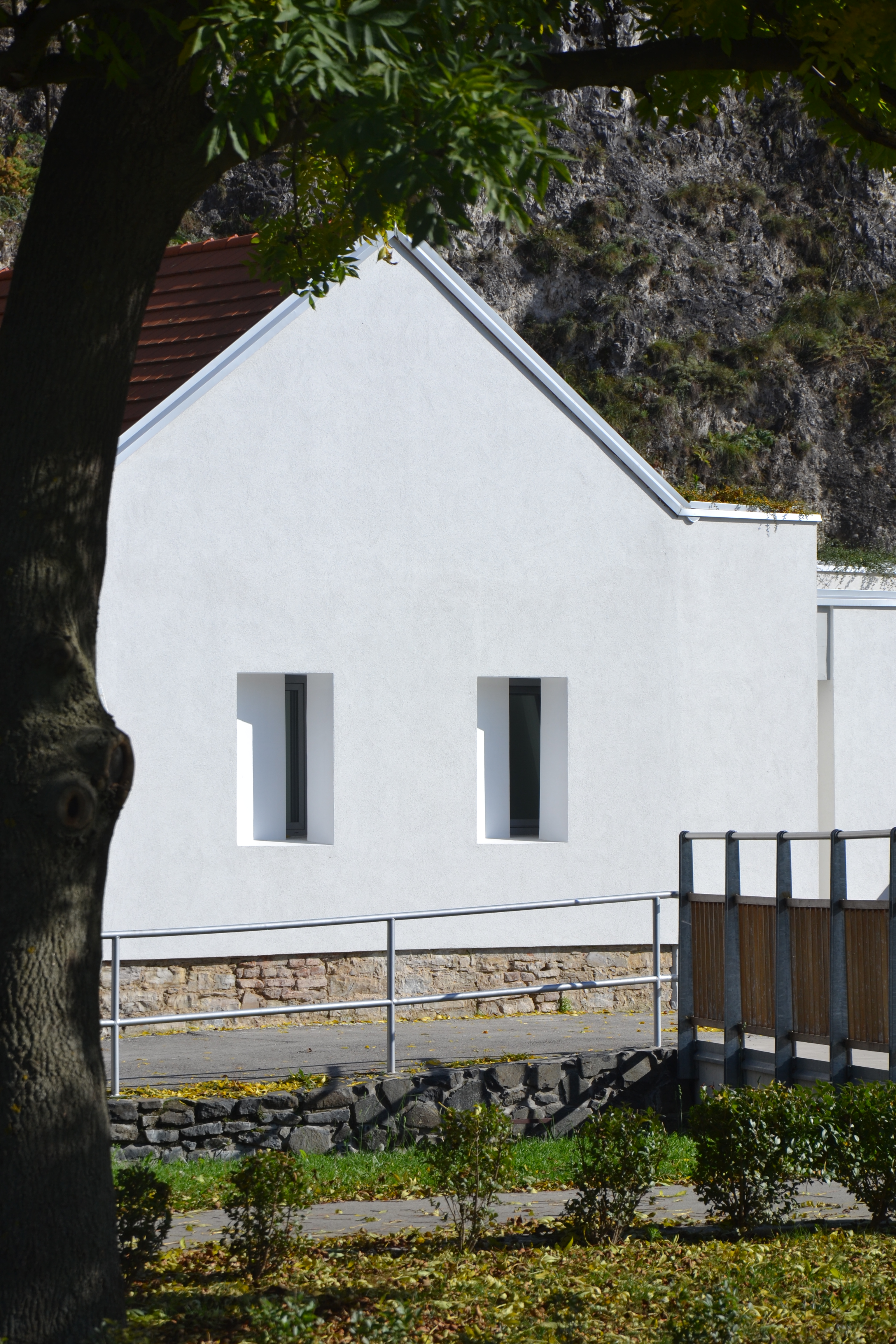 V historickej časti budovy so štítom a šikmou strechou, ktorá je kolmá na ulicu, sa nachádza obytná časť s kuchyňou, jedálenským kútom a spálňou s príslušenstvom. Kolmo na túto časť je pristavaný nový trakt s detskou izbou a príslušenstvom, takisto aj dvojgaráž s plochou strechou. Medzi domom a skalou vznikli terasy, čo umožnilo prirodzené presvetlenie miestností orientovaných týmto smerom.