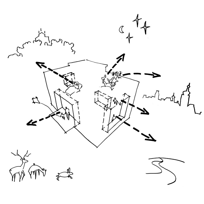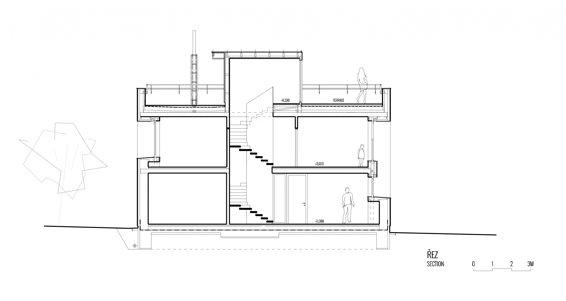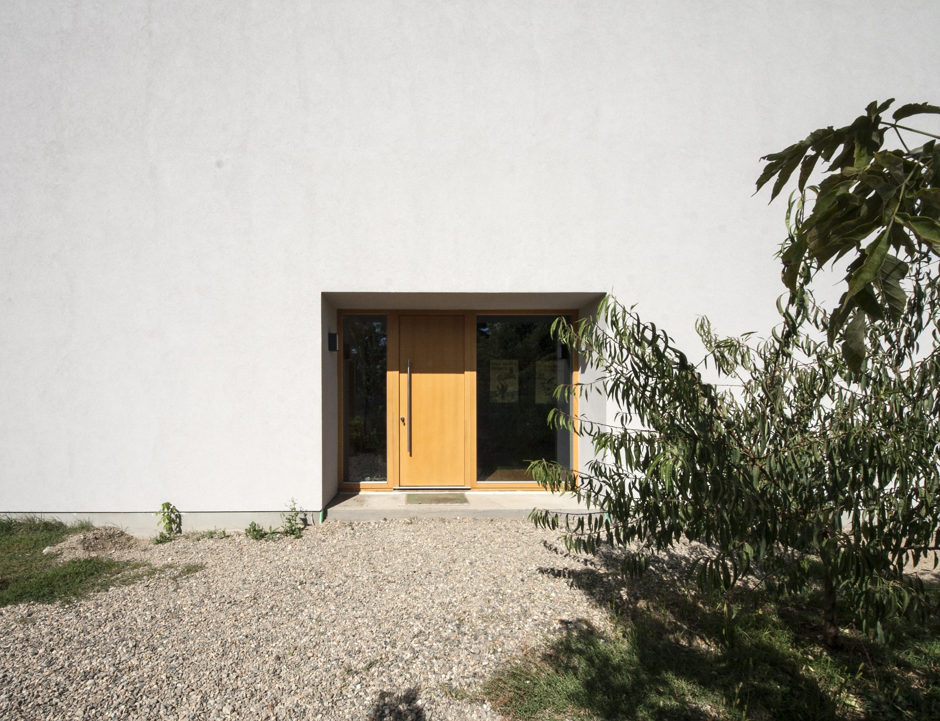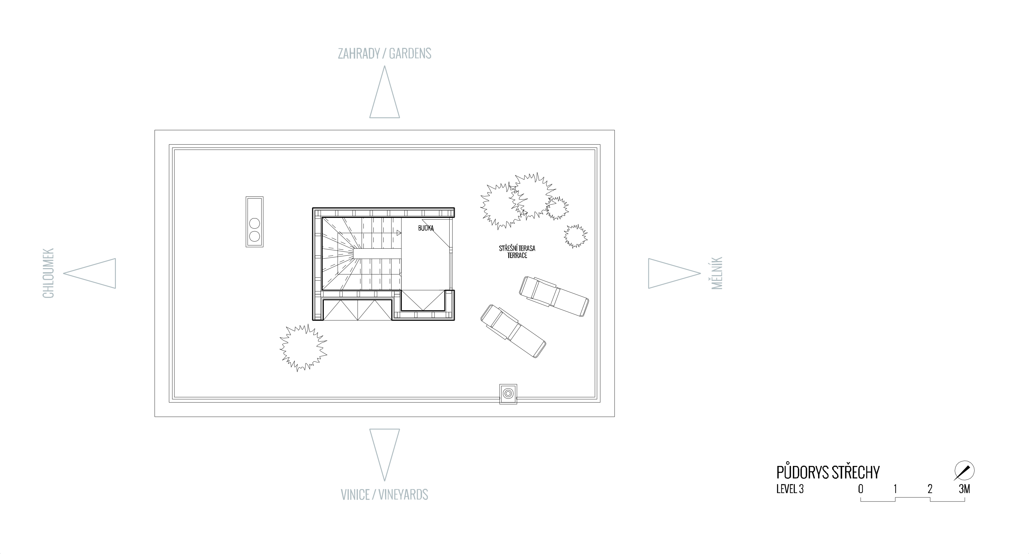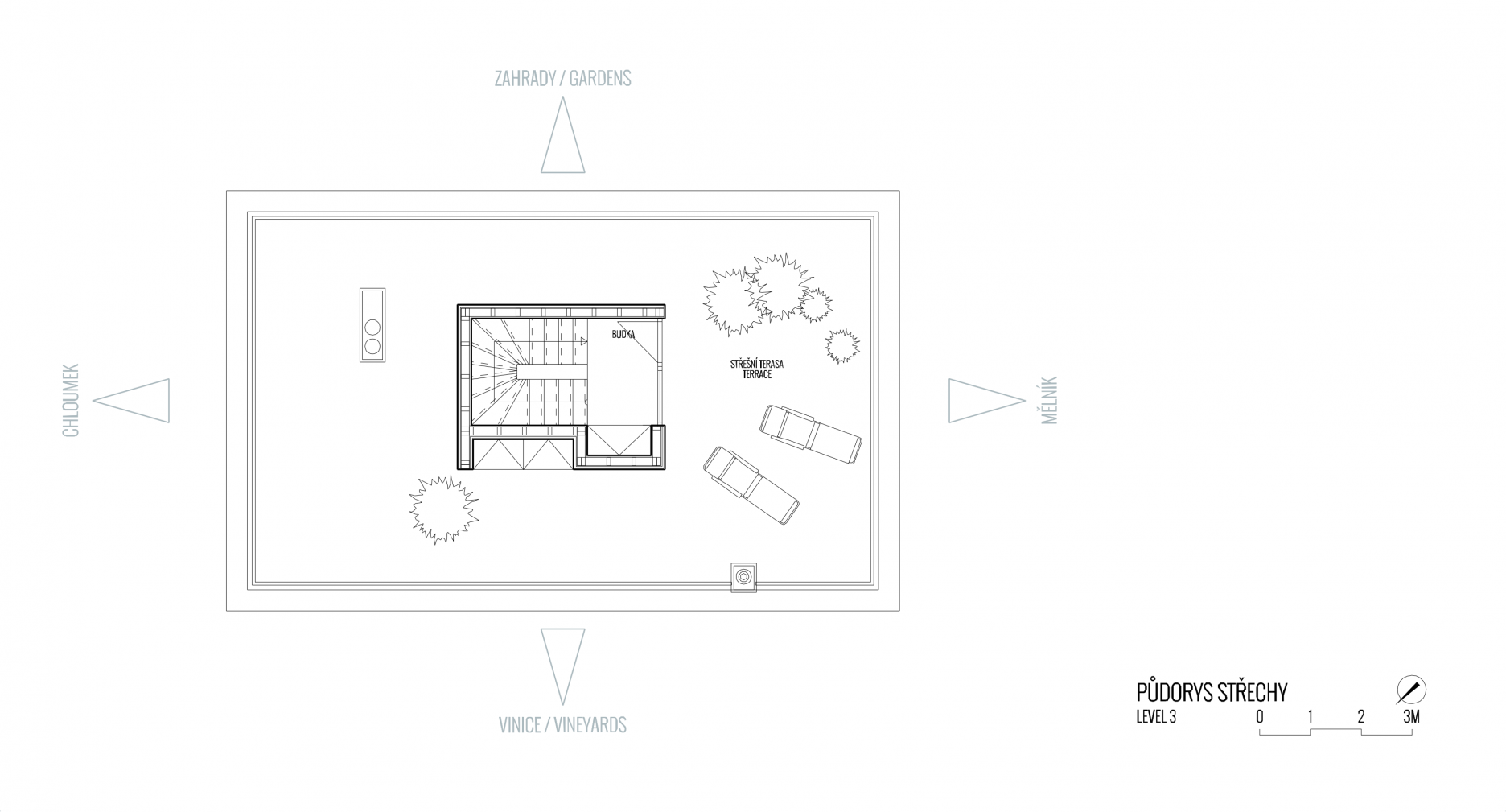 Umiestnenie domu v strede neveľkej parcely na okraji mesta Mělník akcentuje prepojenie domu s výhľadmi do krajiny. V každej zo štyroch fasád je zapustený jeden otvor rámujúci špecifický, pre každú stranu jedinečný výhľad - na vinicu, panorámu mesta, barokovú kaplnku a siluetu krajiny. Veľkosť a proporcia okenných otvorov je určená predovšetkým vzťahom medzi interiérom a charakterom jednotlivých výhľadov.
