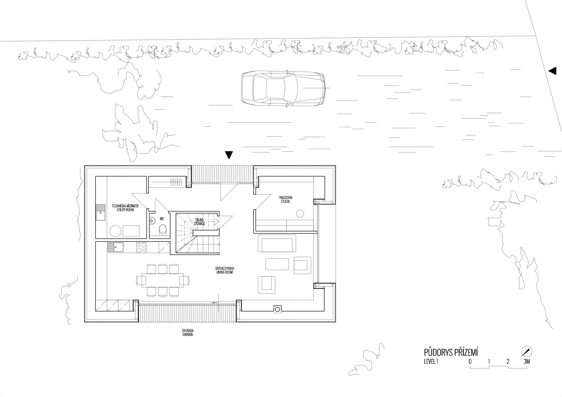 Najväčším priestorom na prízemí je obývacia izba s kuchyňou. Malá pracovňa a technická miestnosť sú prístupné z predsiene.