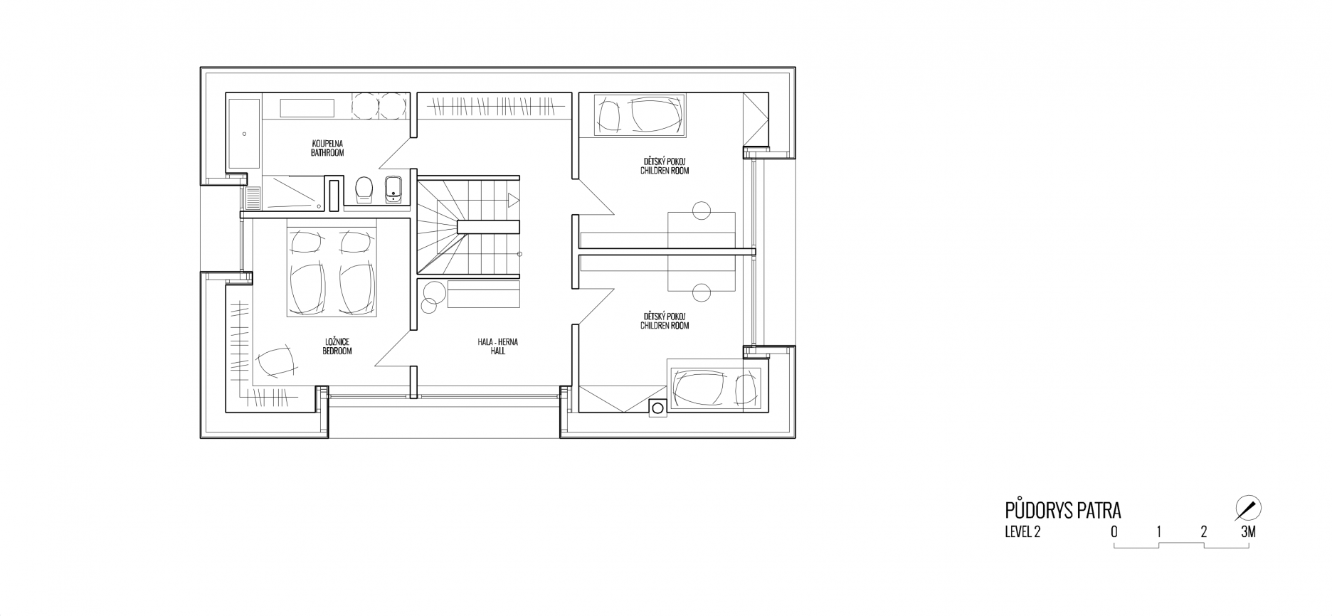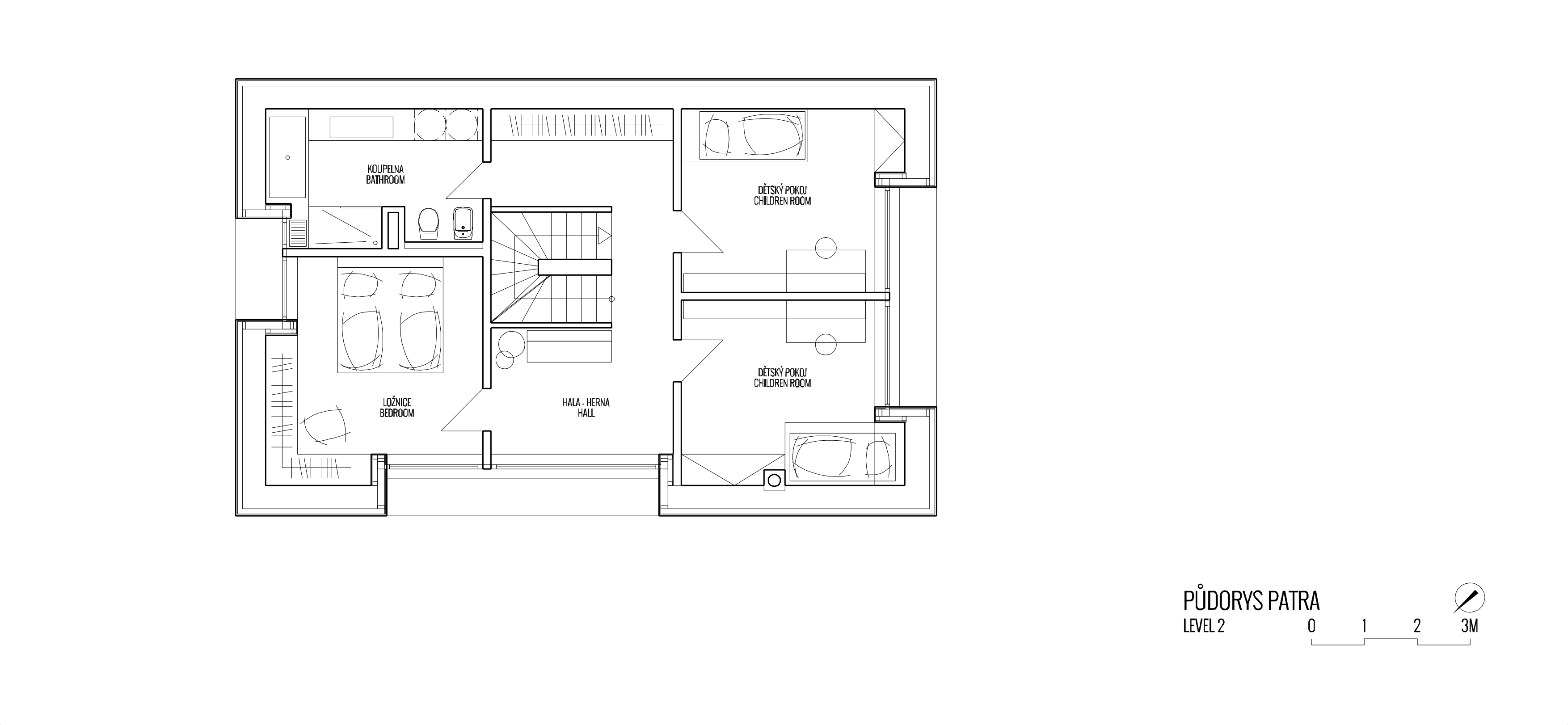 Na poschodí tvorí hala so schodiskom ústredný priestor spálňovej časti. Miestnosť pred kúpeľňou slúži ako šatník, zvyšná časť haly je herňou pre deti. Tri izby sú situované v rohoch dispozície.