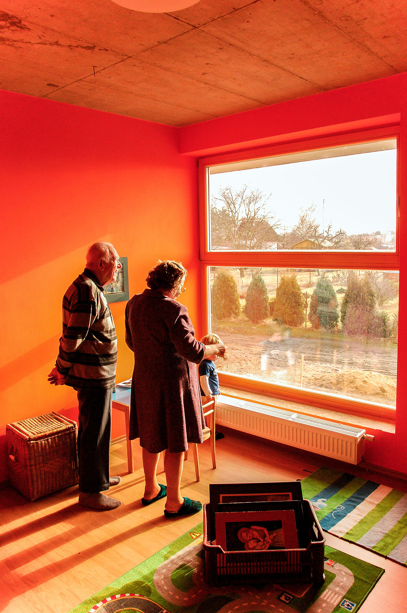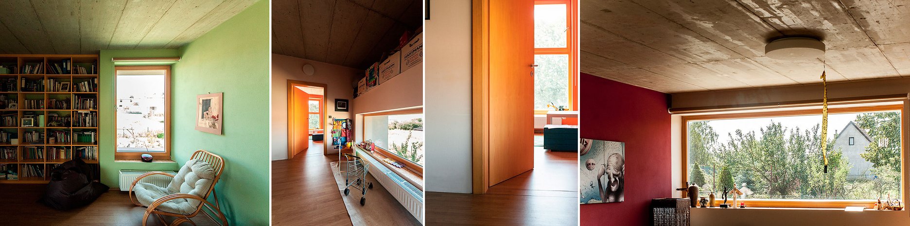 Jednogeneračný rodinný dom s pôdorysnými rozmermi 13,3 × 8,3 m má dve obytné podlažia. Na prízemí domu sú denné miestnosti, na poschodí nočná časť so spálňami. Nízky parapet v detských izbách a herni nebráni vo výhľadoch ani tým najmenším obyvateľom. Drevené schodisko prechádza stredom domu až do strešnej nadstavby s terasou, ktorá ponúka v letných mesiacoh ďalší pobytový priestor. Zapustenie okien chráni miestnosti pred ostrým slnečným svetlom a nepriazňou počasia. Hĺbka zapustenia tvorí v interiéri pri stenách okolo okien 60 cm hlboké niky určené pre vstavaný nábytok. To poskytuje v miestnostiach dostatok priestoru pre úložné skrine a knižnice, ktoré nezasahujú do čistého obdĺžnikového pôdorysu.