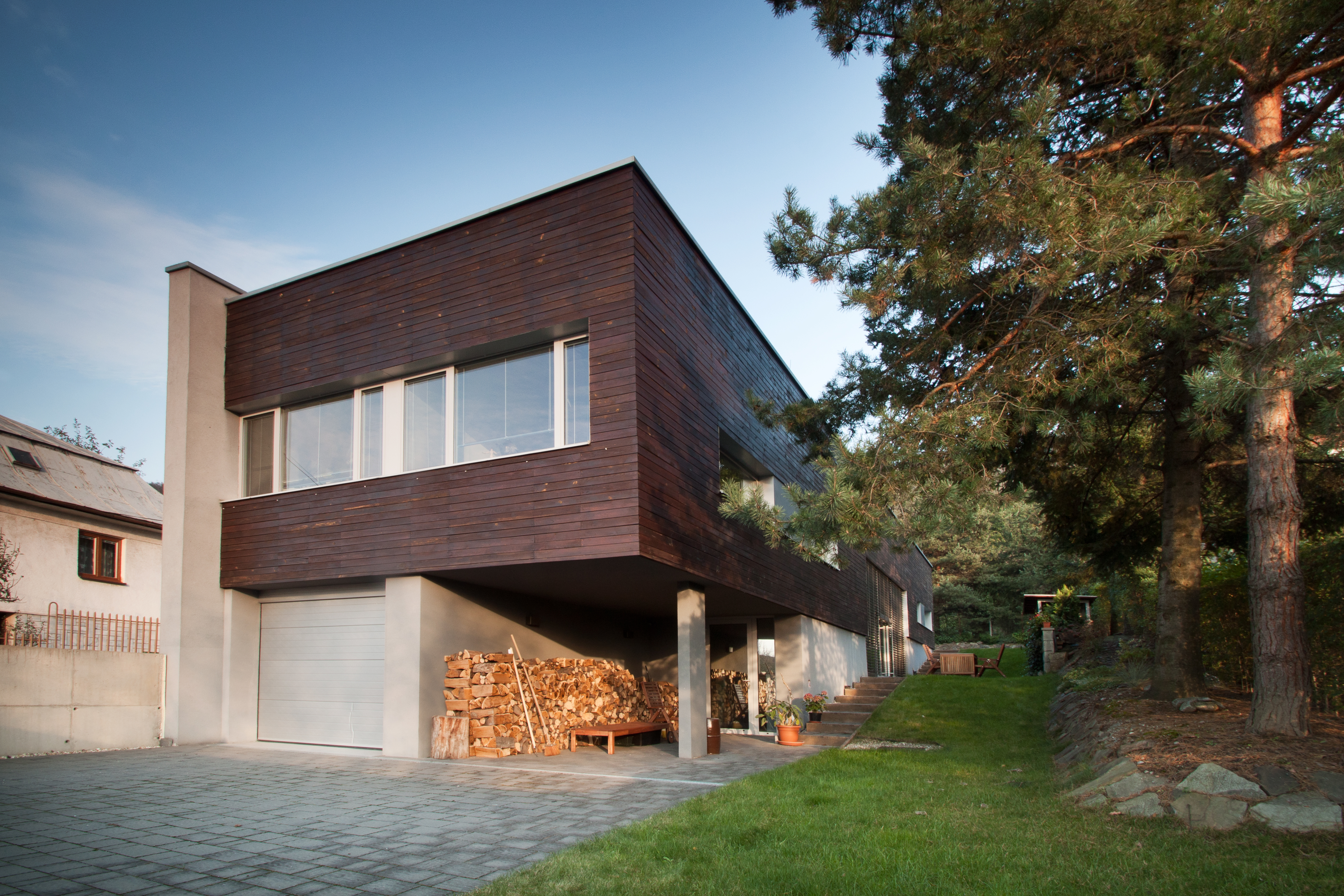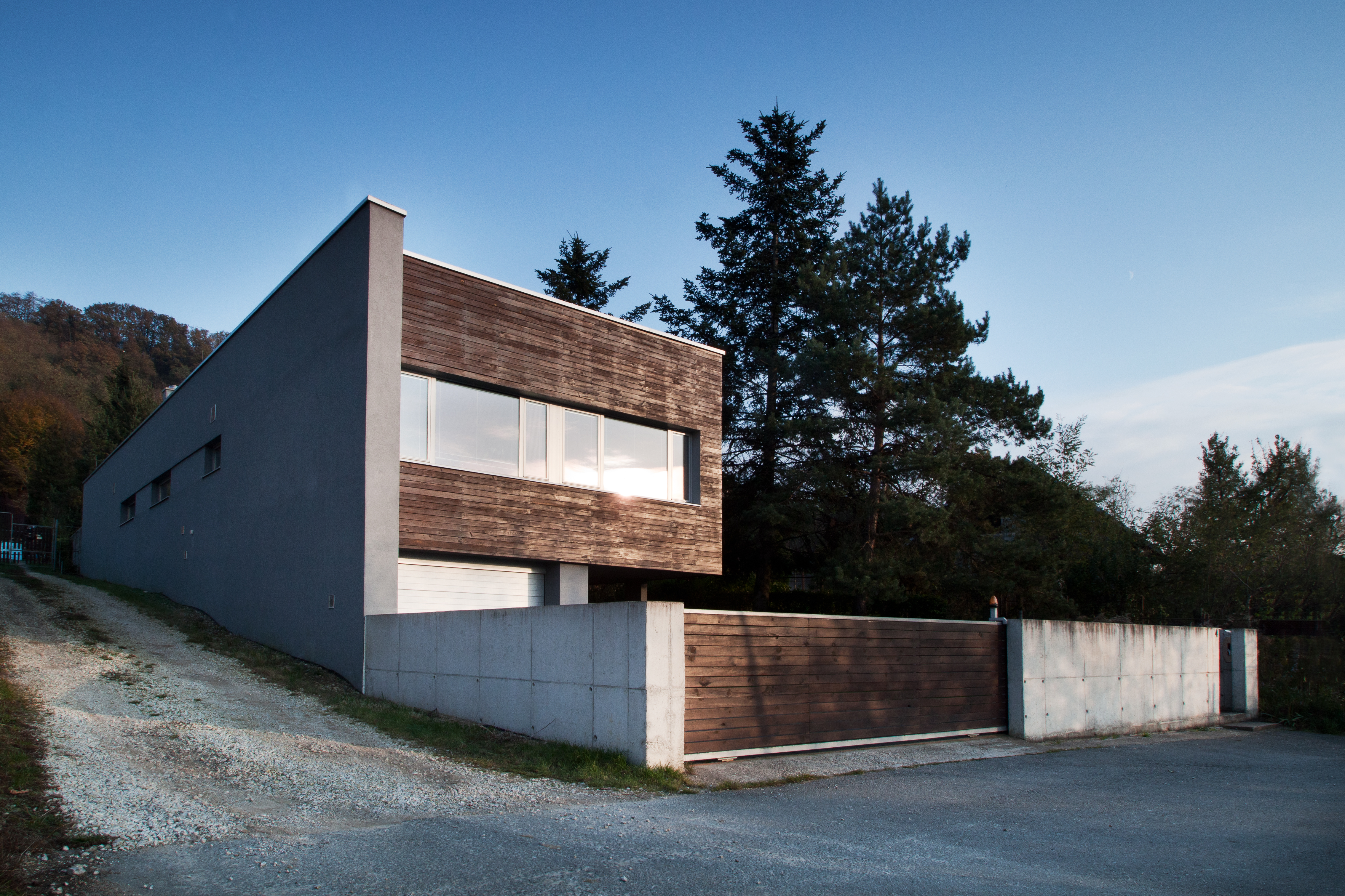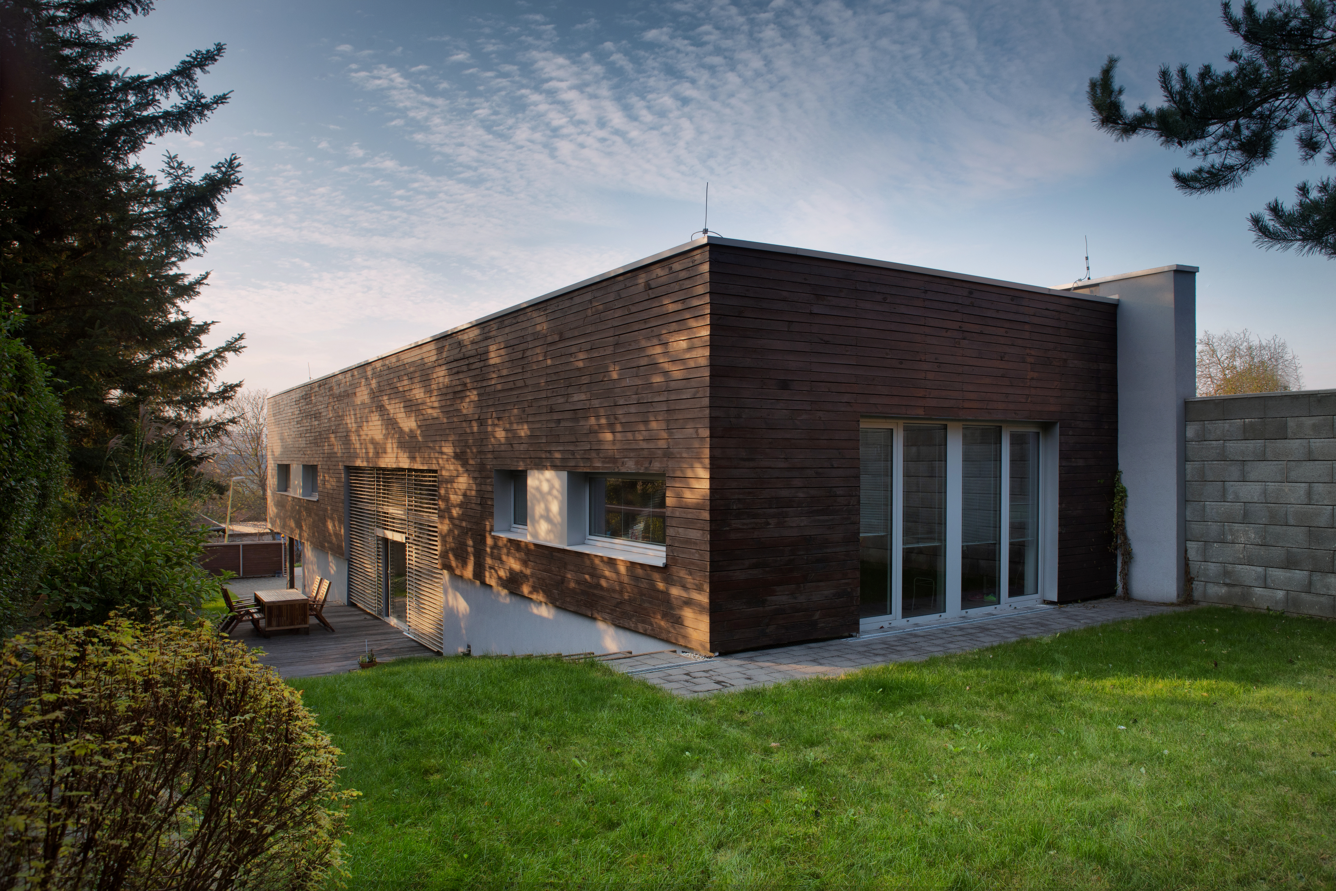 Dom je nadštandardne zateplený a opláštený drevenou prevetrávanou fasádou s latovaním z mäkkého dreva. Na úrovni oplotenia je drevo nahradené pohľadovým betónom.