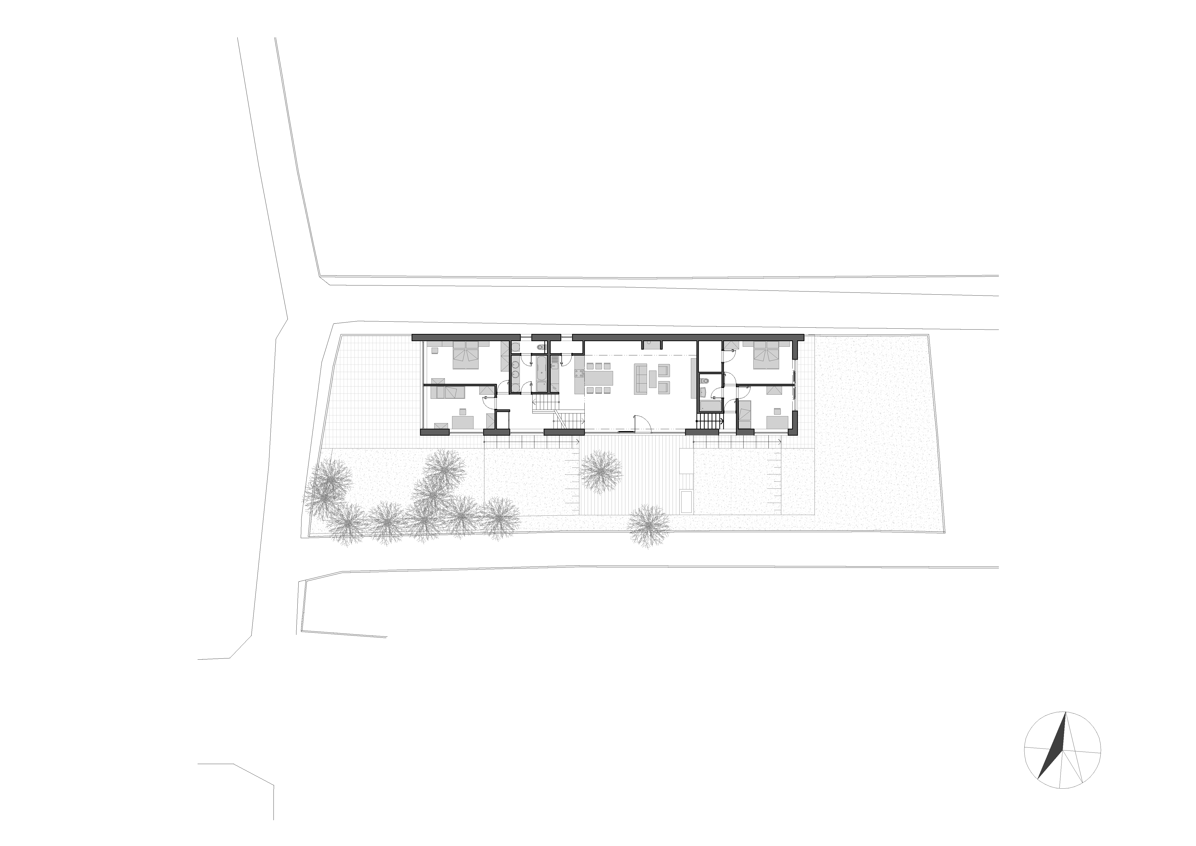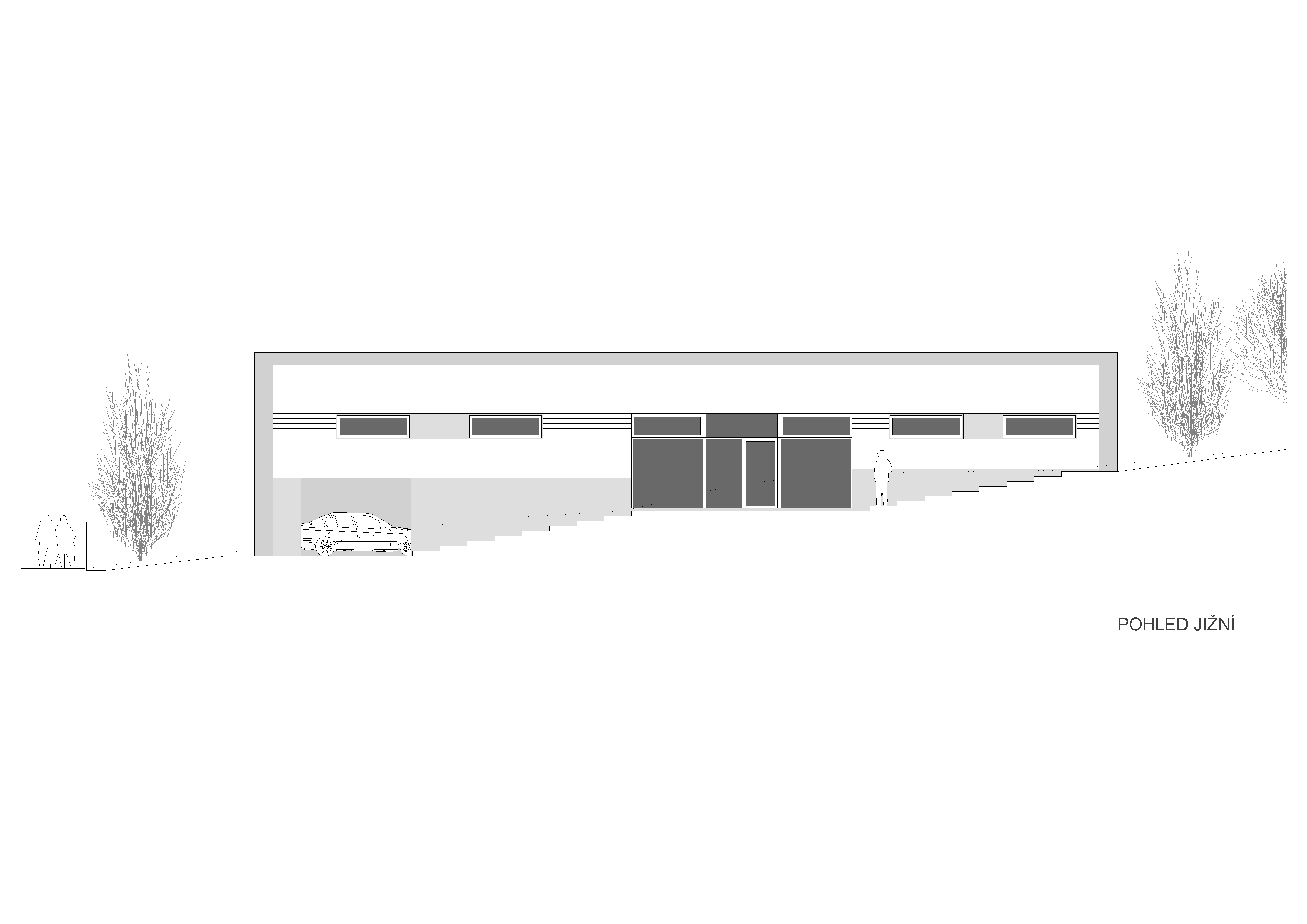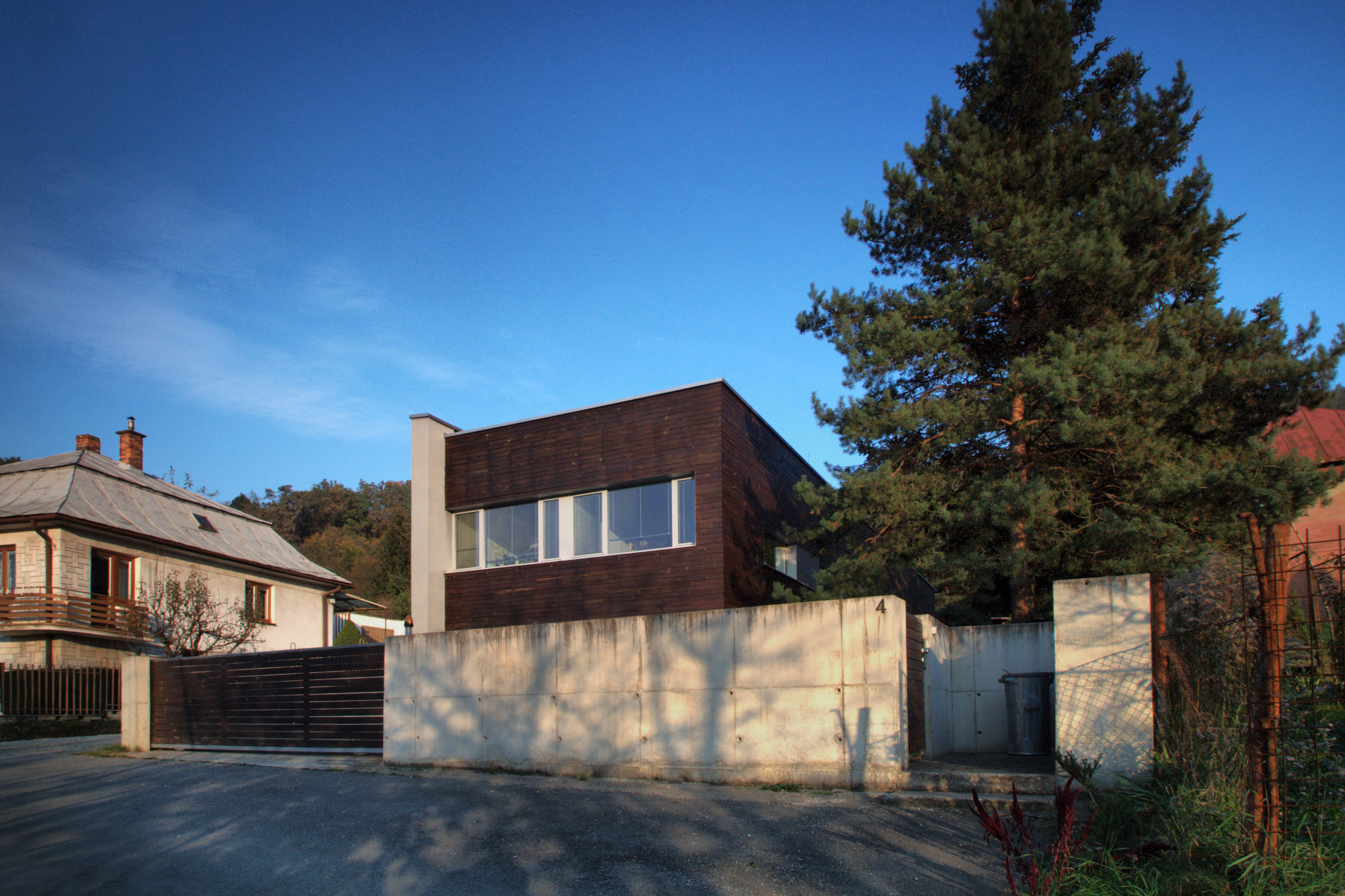 Objekt je umiestnený na hranici parcely, čím vytvára prirodzenú bariéru a oplotenie. Navonok jednoduchý objem - kváder, kopíruje svažitý terén pozemku svojím členitým vnútorným usporiadaním.
