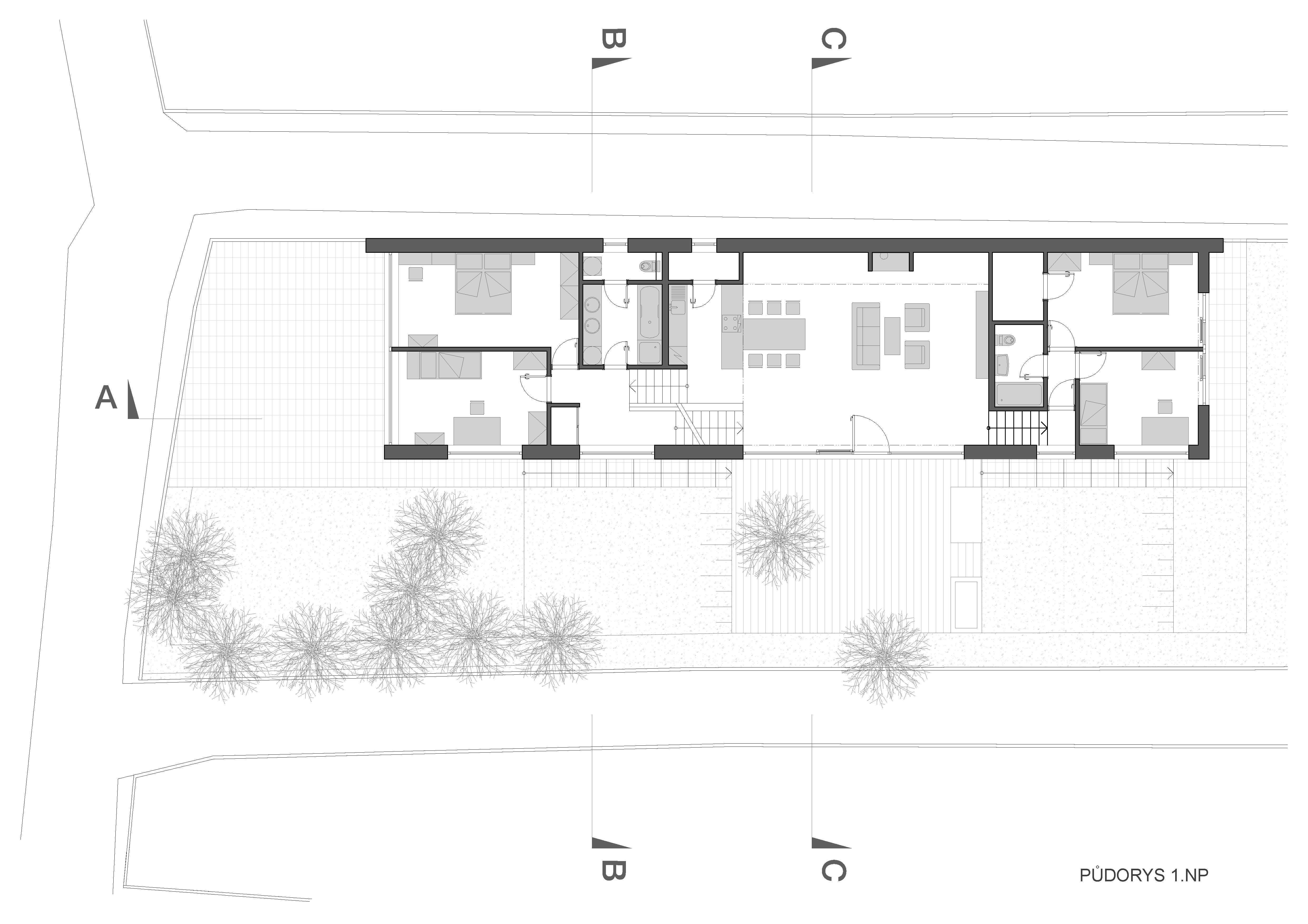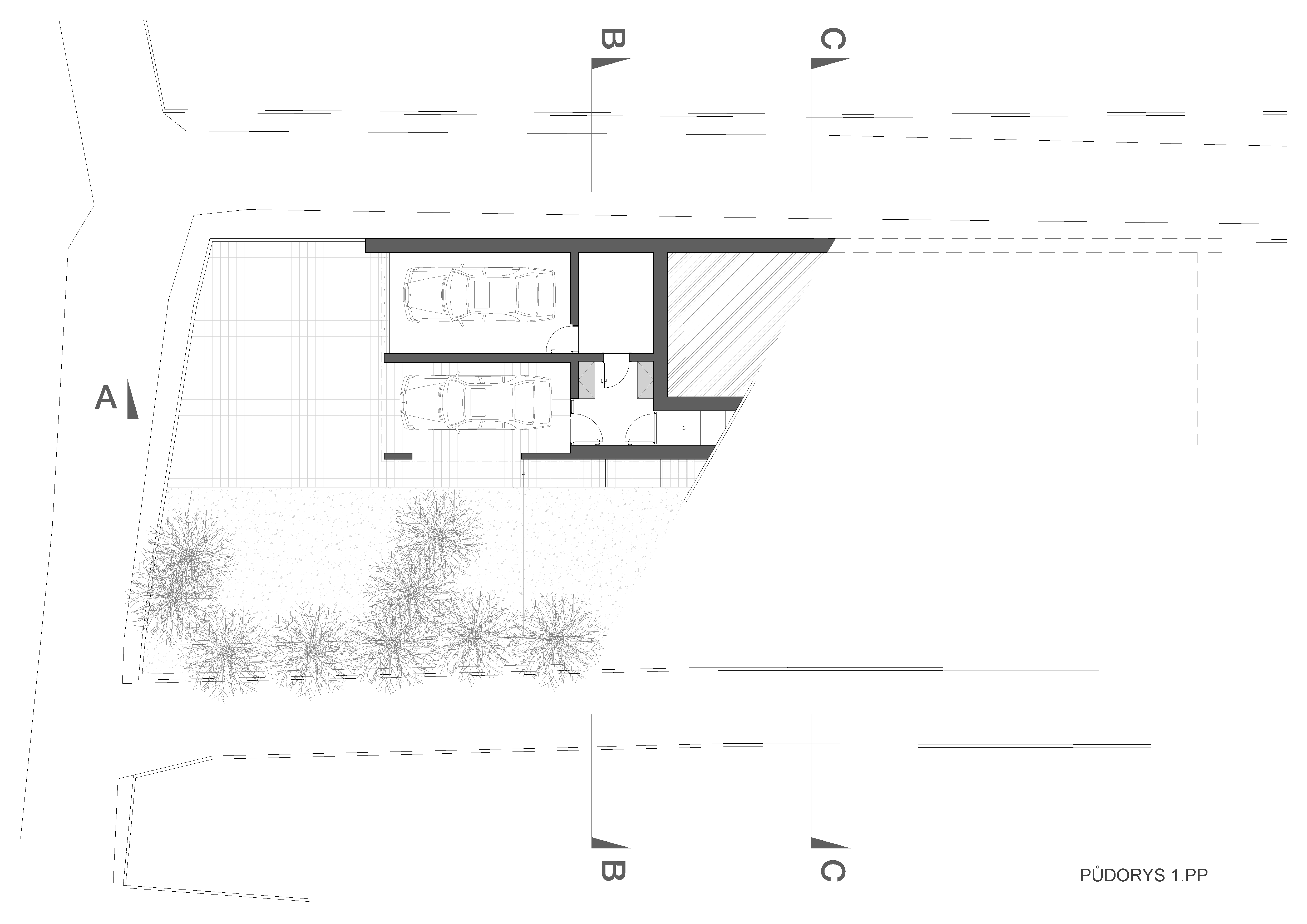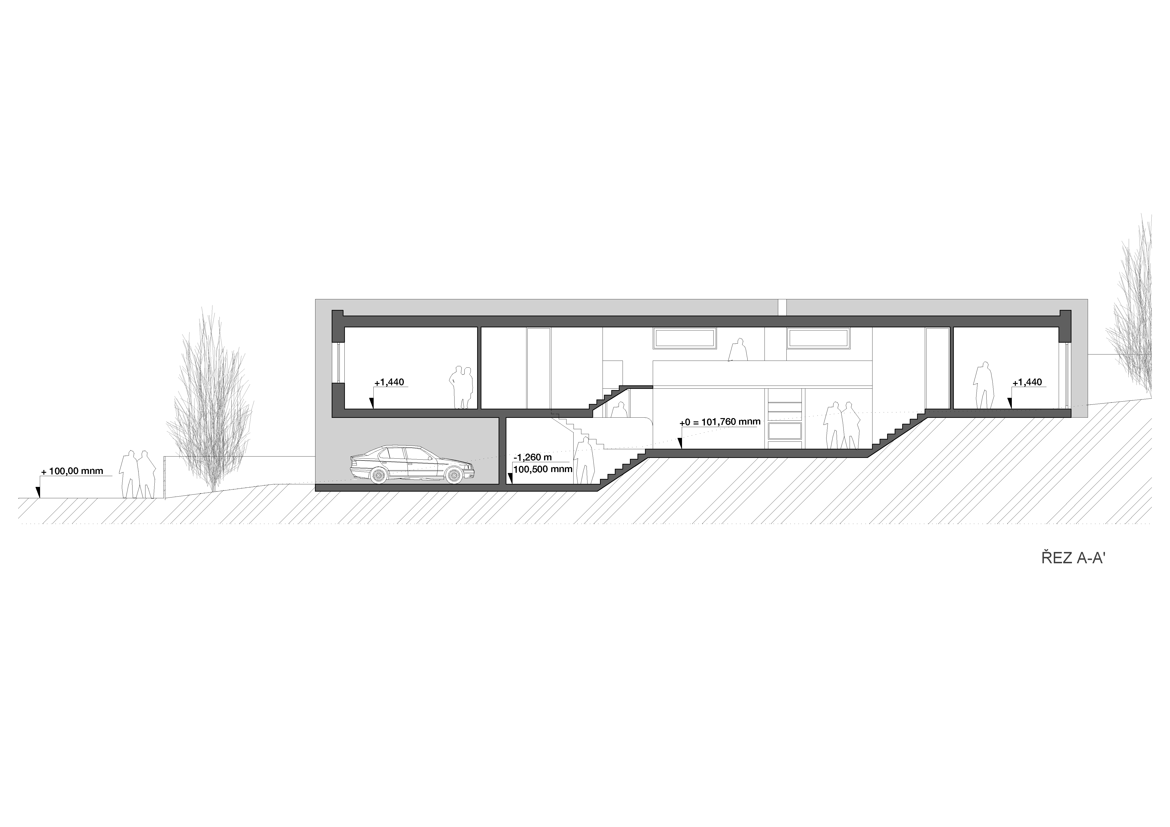 Objekt je umiestnený na hranici parcely, čím vytvára prirodzenú bariéru a oplotenie. Navonok jednoduchý objem - kváder, kopíruje svažitý terén pozemku svojím členitým vnútorným usporiadaním.