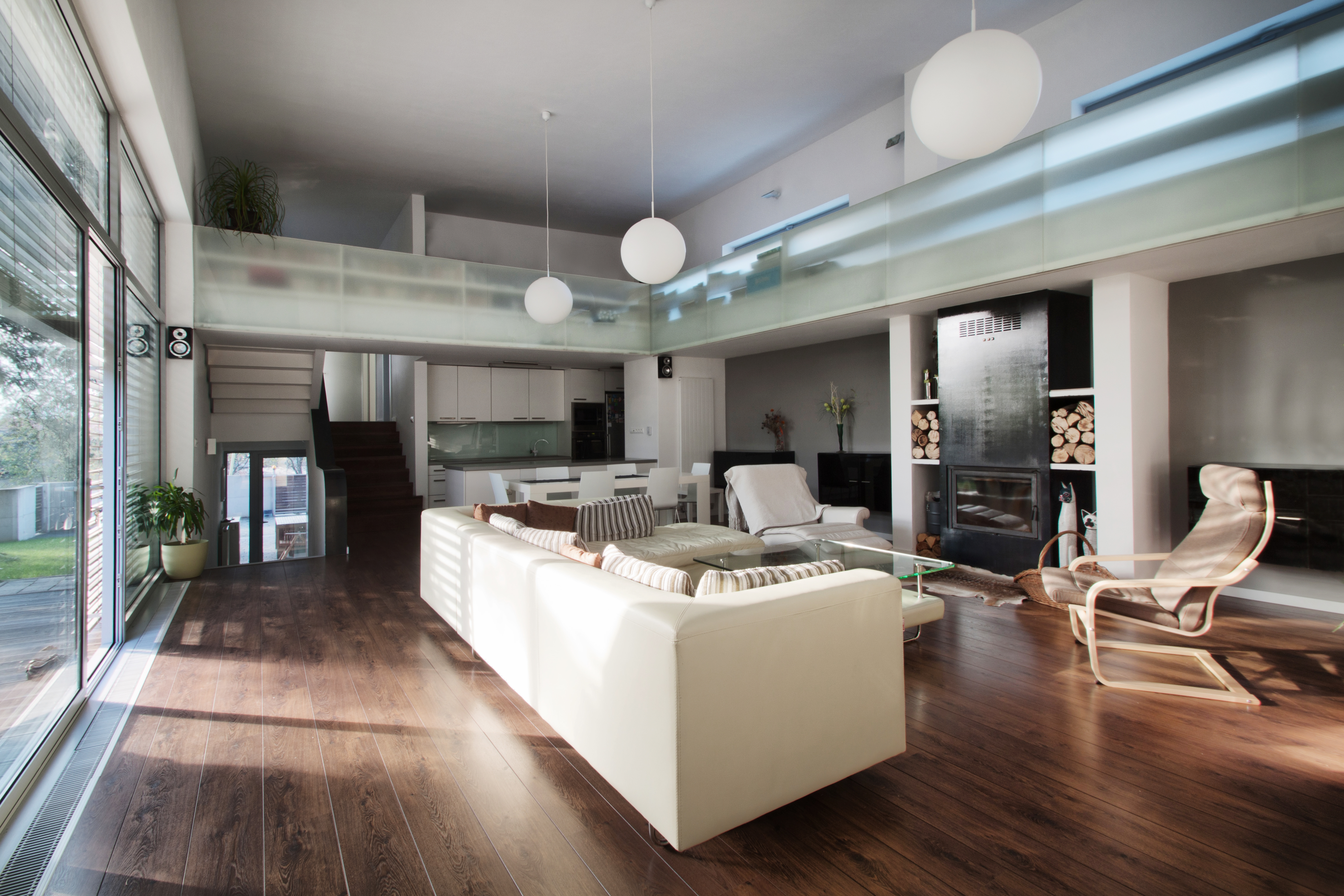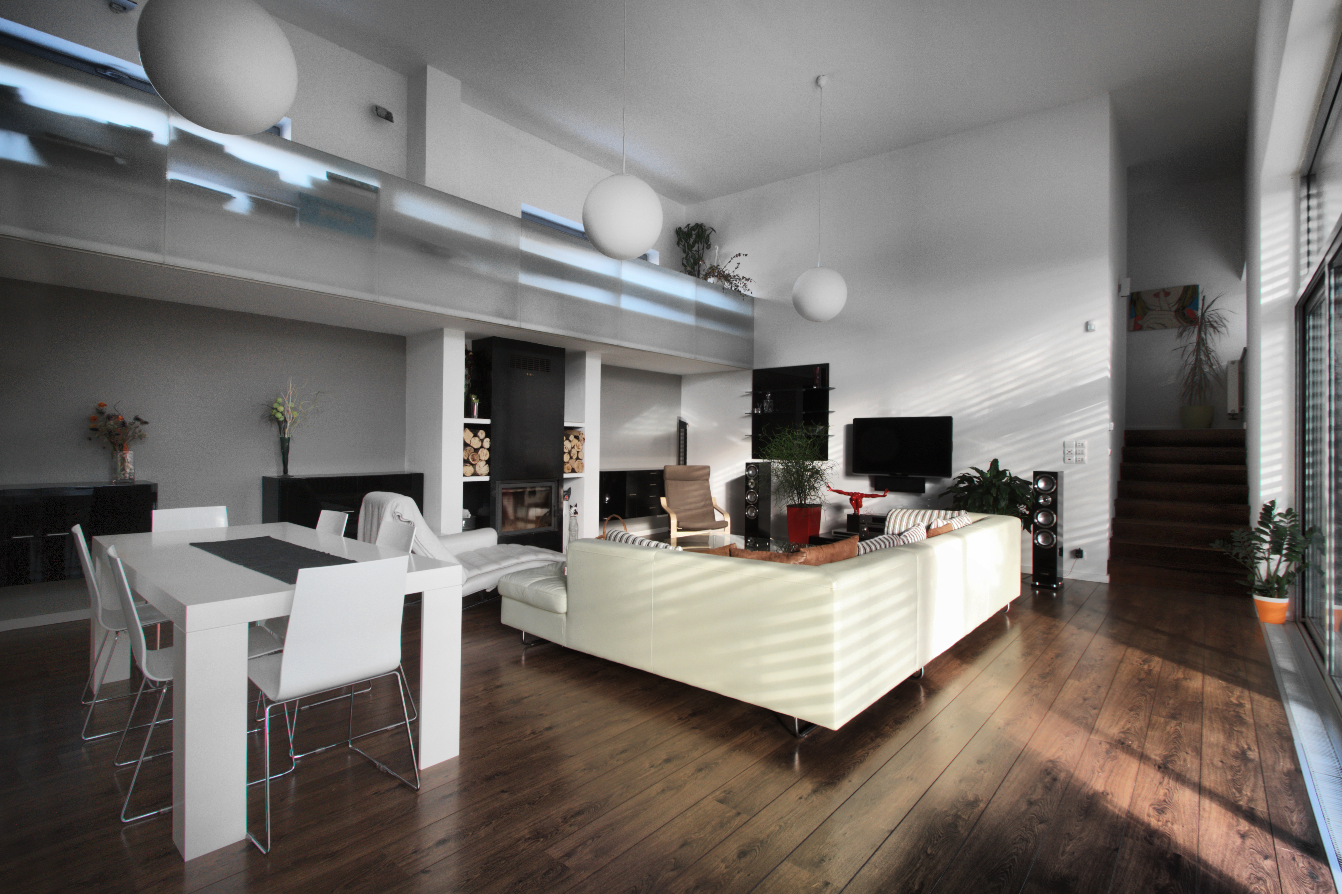 Dvojpodlažná obytná hala udržuje stabilnú klímu domu aj v parných letných mesiacoch. V zime dokáže centrálny krb dobre vykúriť spálne, ktoré sú umiestnené o pol poschodia vyššie.
