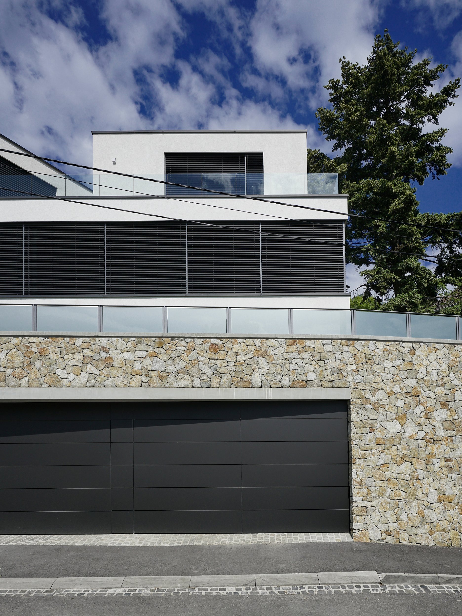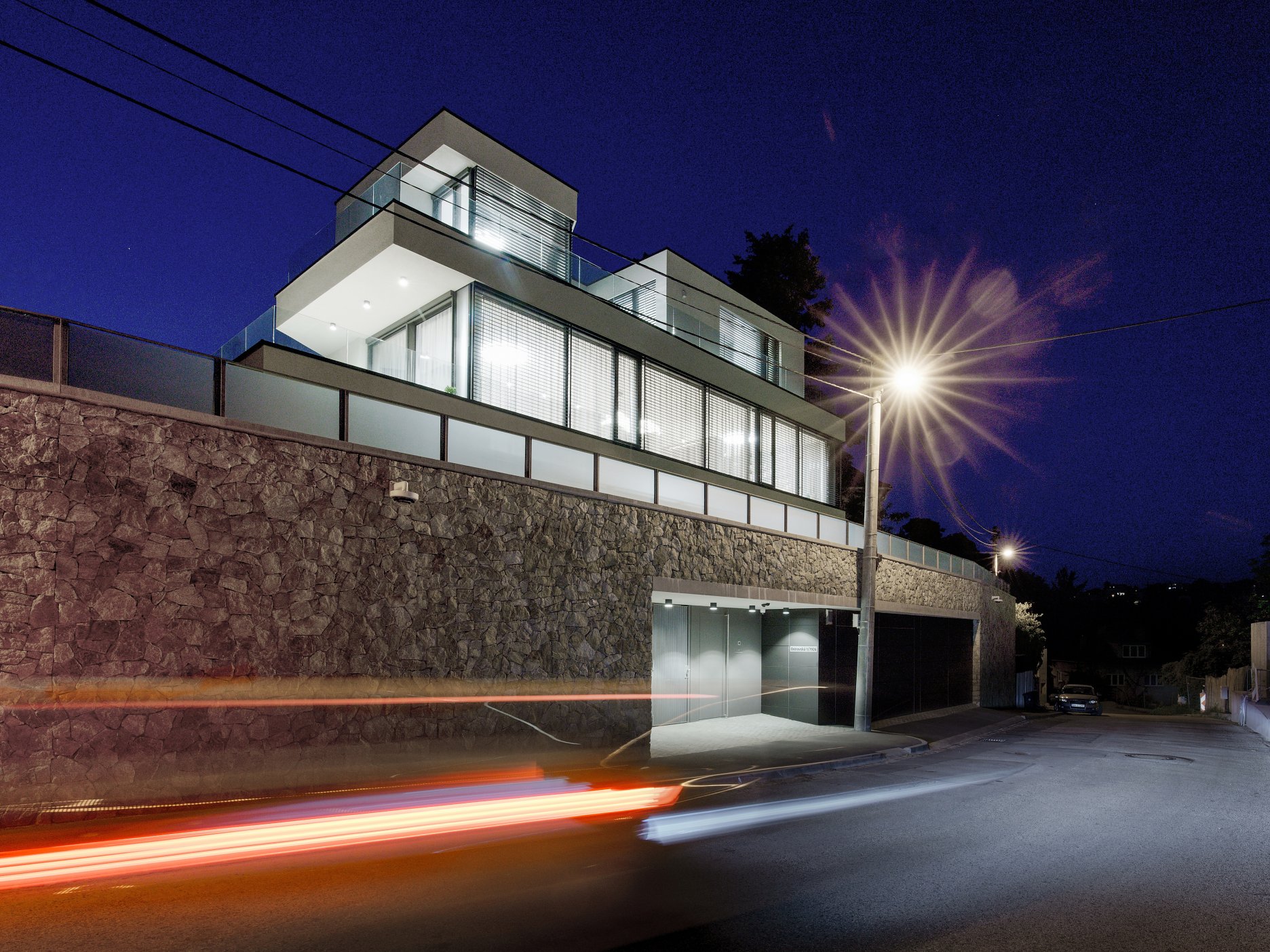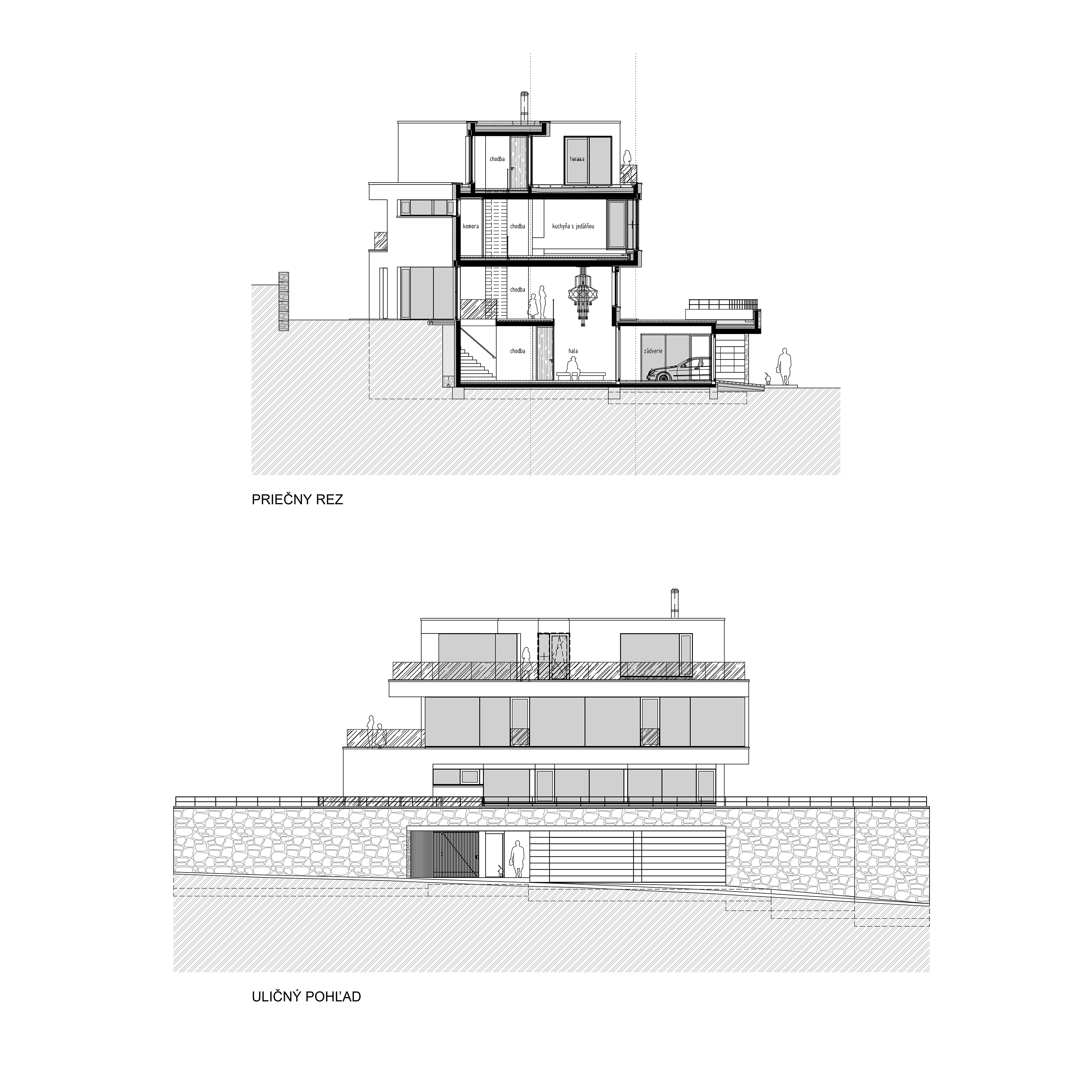 Inšpiráciou pri navrhovaní rodinného domu, ktorého architektúra je založená na kontraste plných objemov a rozmerných presklených plôch, bol odkaz funkcionalistických víl z minulého storočia. Nápadnú horizontalitu stavby zvýrazňuje presklenie obytného poschodia, orientované k pohľadom na mesto. Spomínaná horizontalita je narušená usporiadaním ustúpeného podlažia. Za novým múrom, ktorý vyrástol na mieste pôvodnej opornej konštrukcie, vzniklo nové patio. Terén, svahovaný na úroveň suterénu, zabezpečuje dostatočné presvetlenie vstupných priestorov.