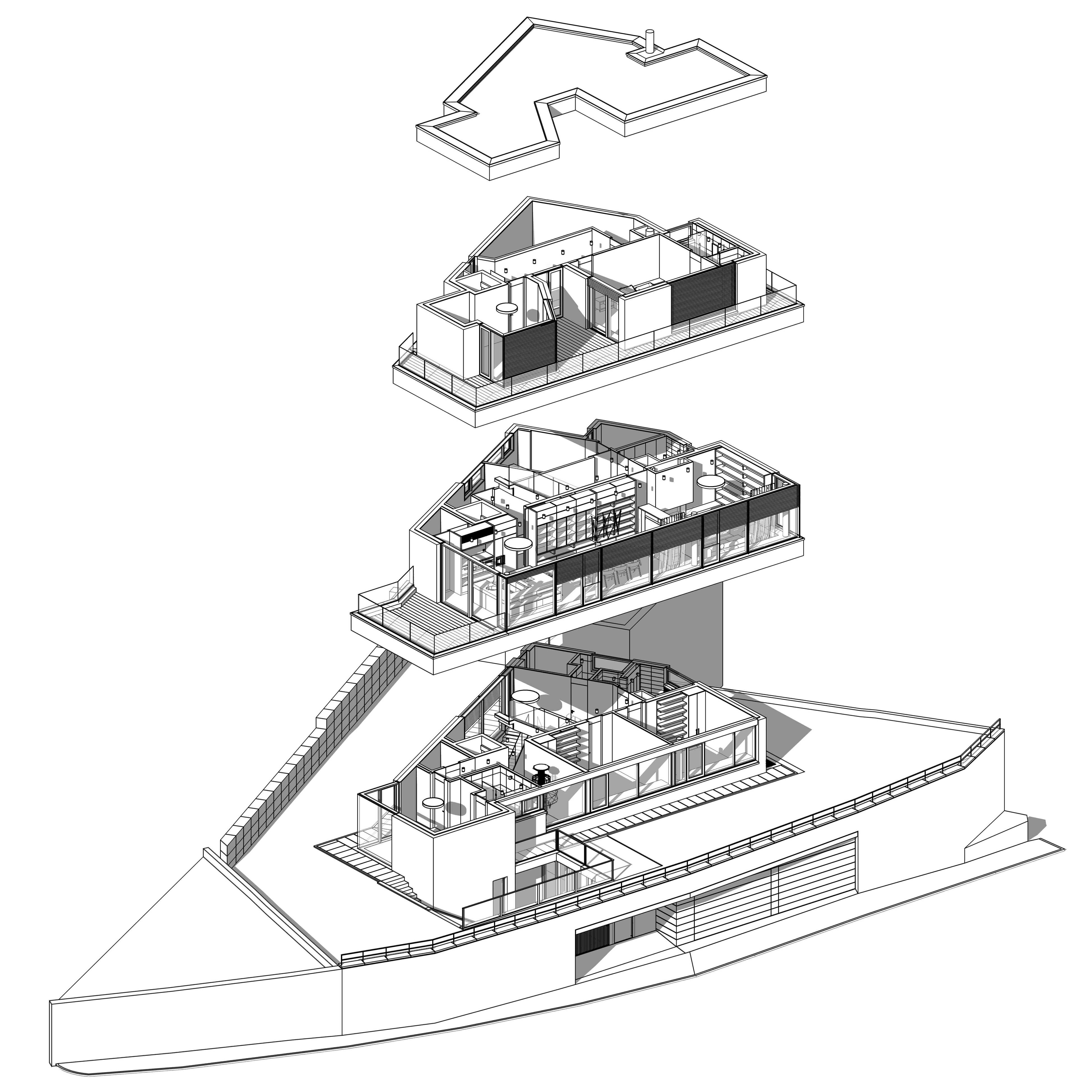 Štvoricu podlaží prepája vo vertikálnom smere okrem schodísk aj osobný výťah. V suteréne sú situované podzemné garáže, vstupná hala, šatník a technické zázemie so skladmi.