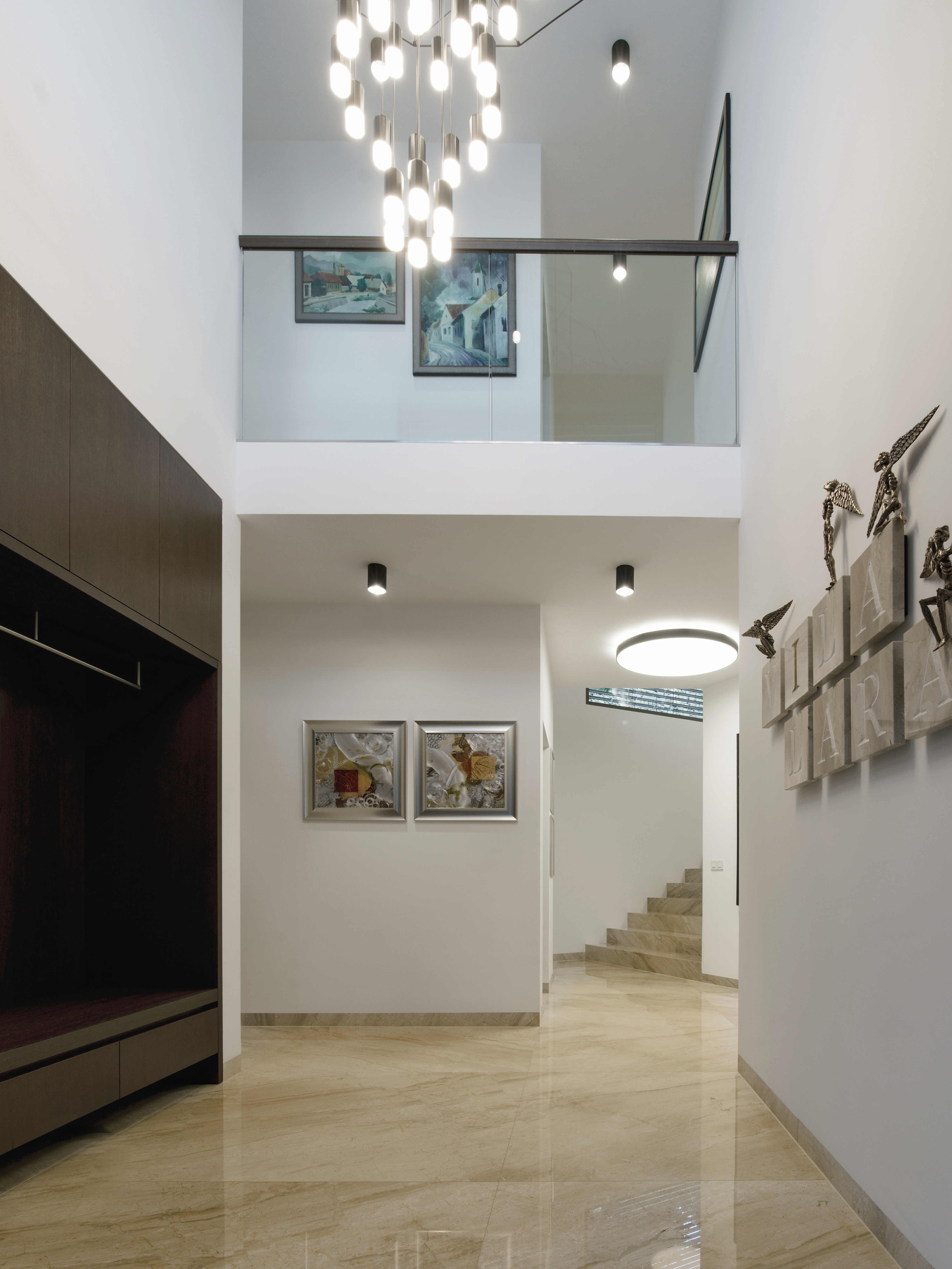 Do domu vstupujeme cez zádverie orientované do patia. Vstupná dvojpodlažná hala je prostredníctvom galérie prepojená s prízemím.