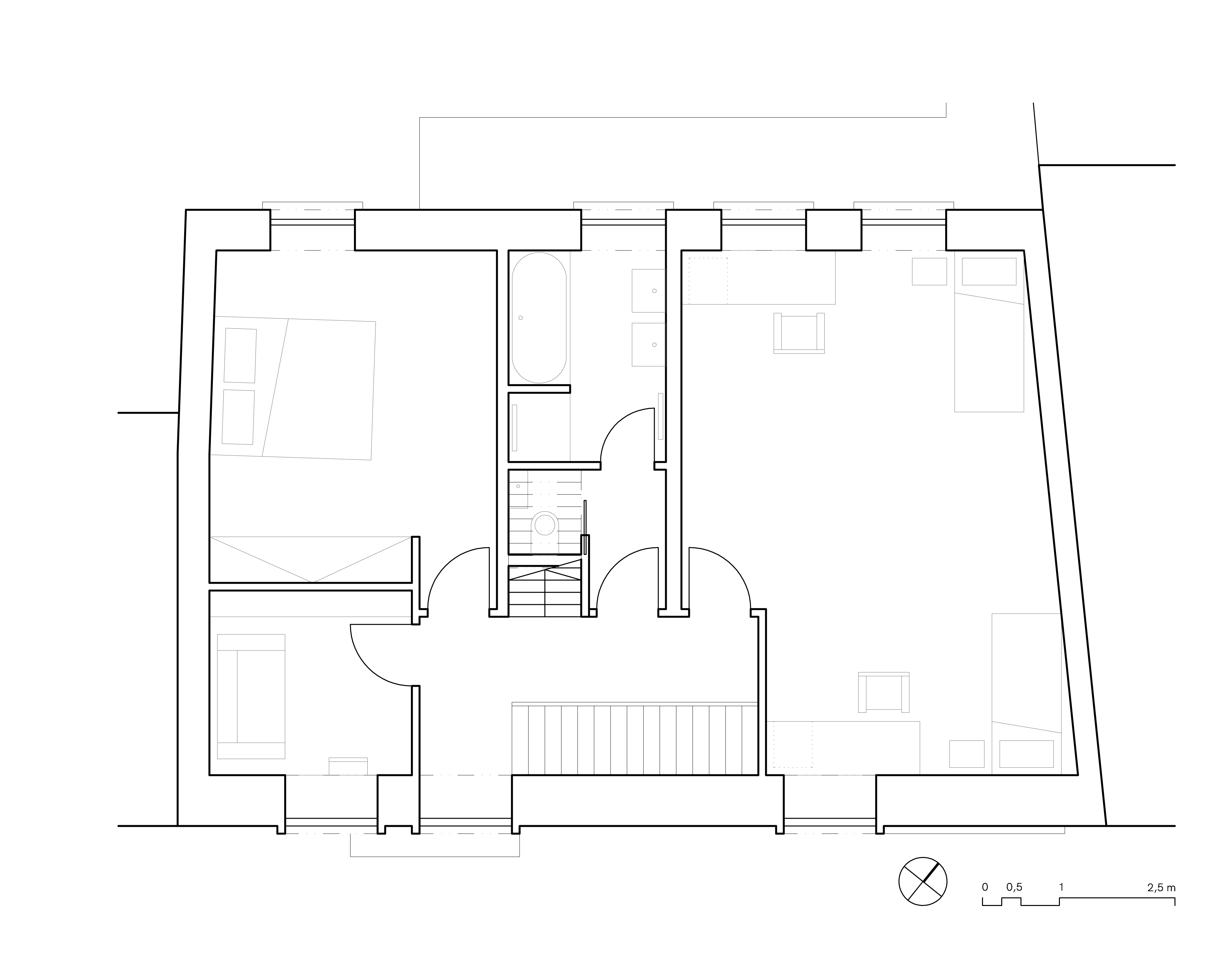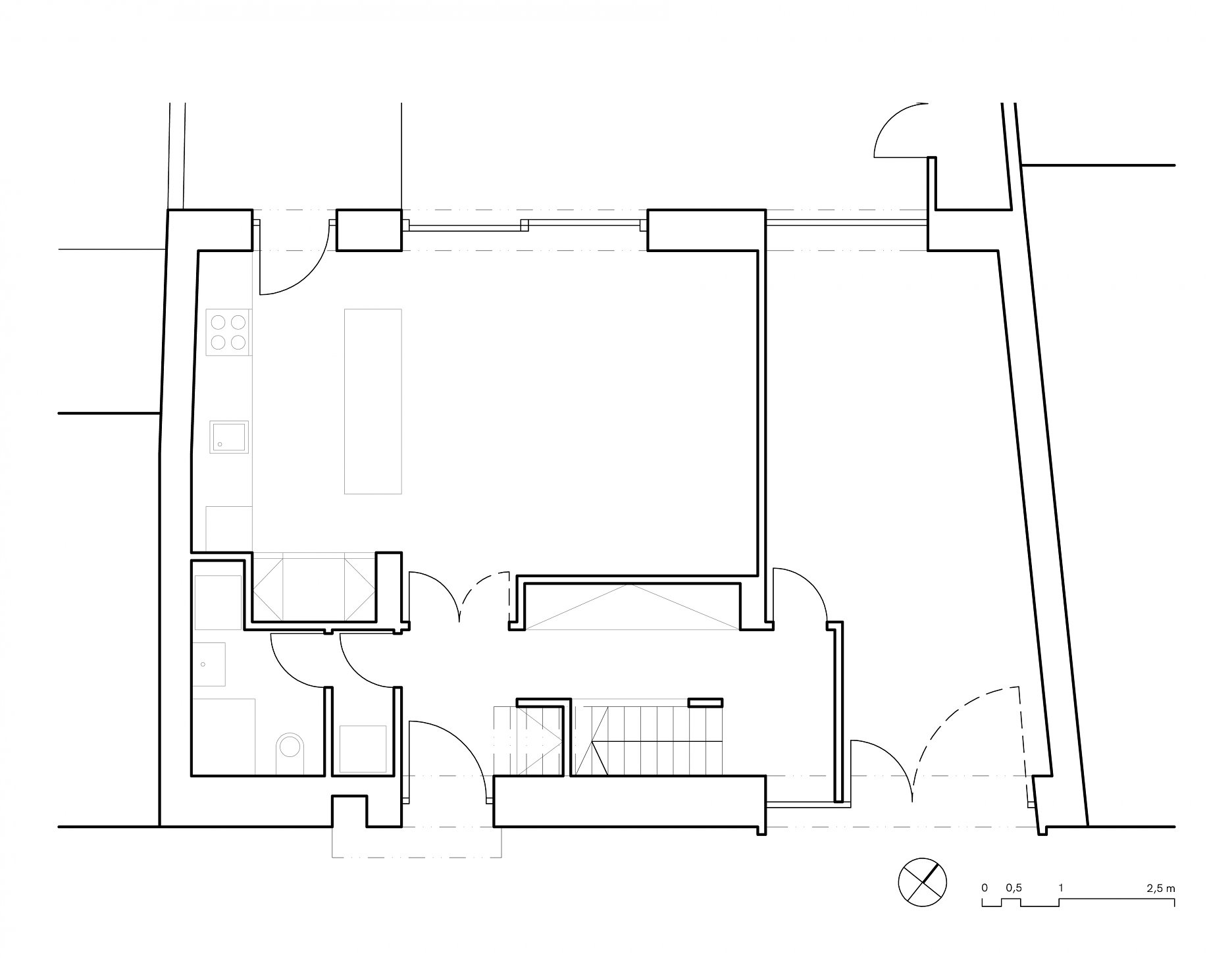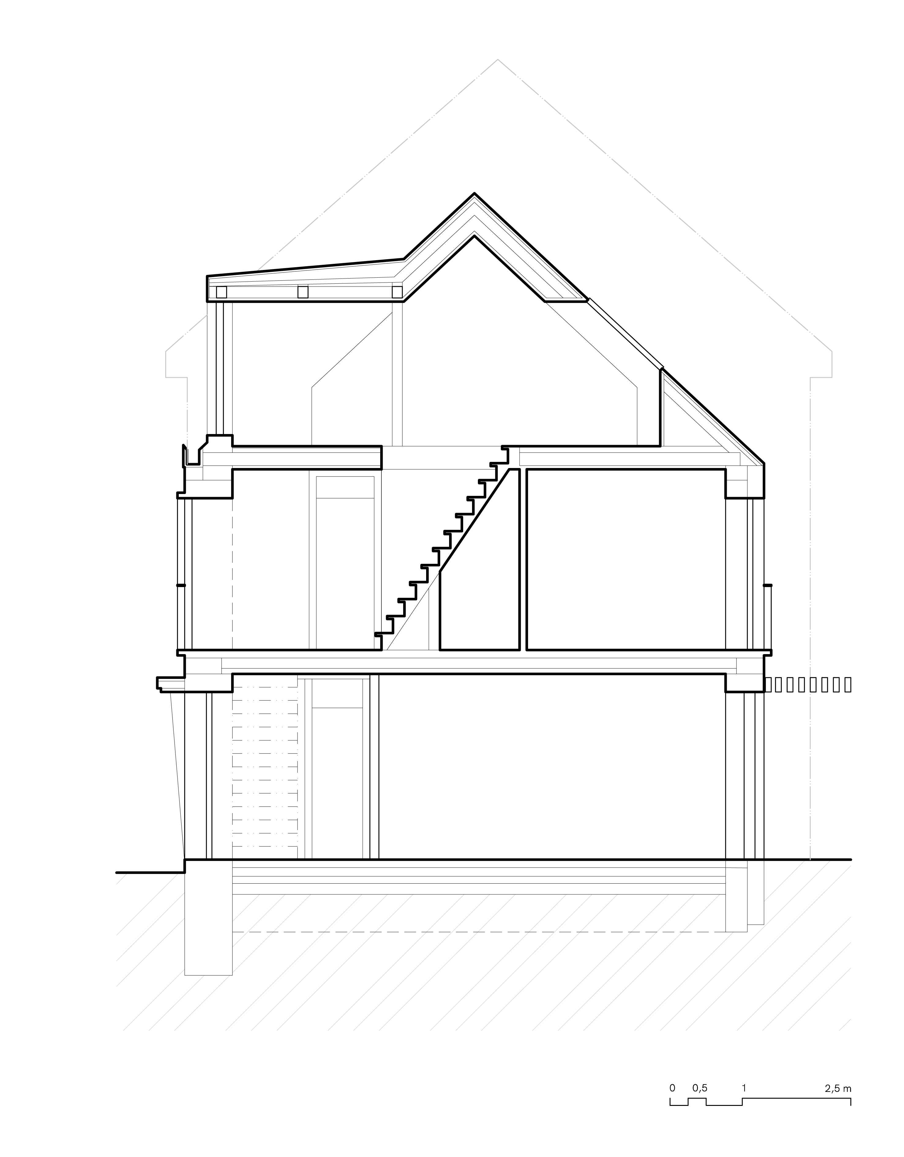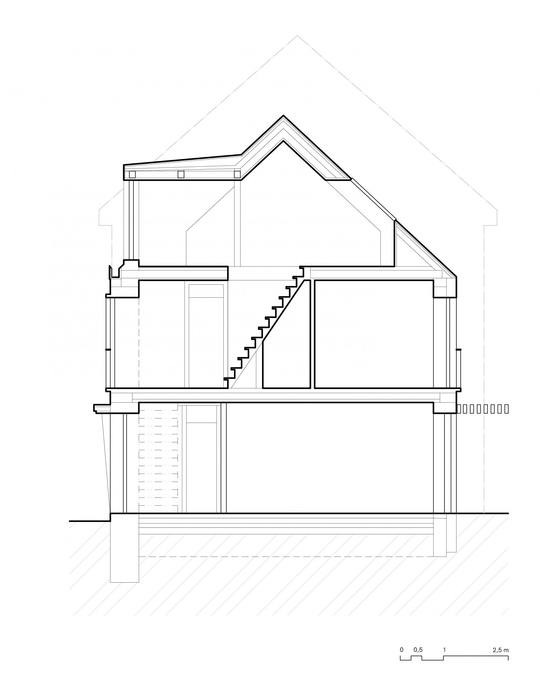 Rodinný dom je trojpodlažný. Prízemie sa prostredníctvom obytnej spoločenskej časti otvára severozápadným smerom do záhrady, technické zázemie tvorí časť od ulice. Na poschodí sú spálne a izby orientované na obe svetové strany a ponúkajú rôzne varianty výhľadov, denného osvetlenia či intimity. Podkrovie je poňaté ako jeden otvorený priestor s oddeleným šatníkom.