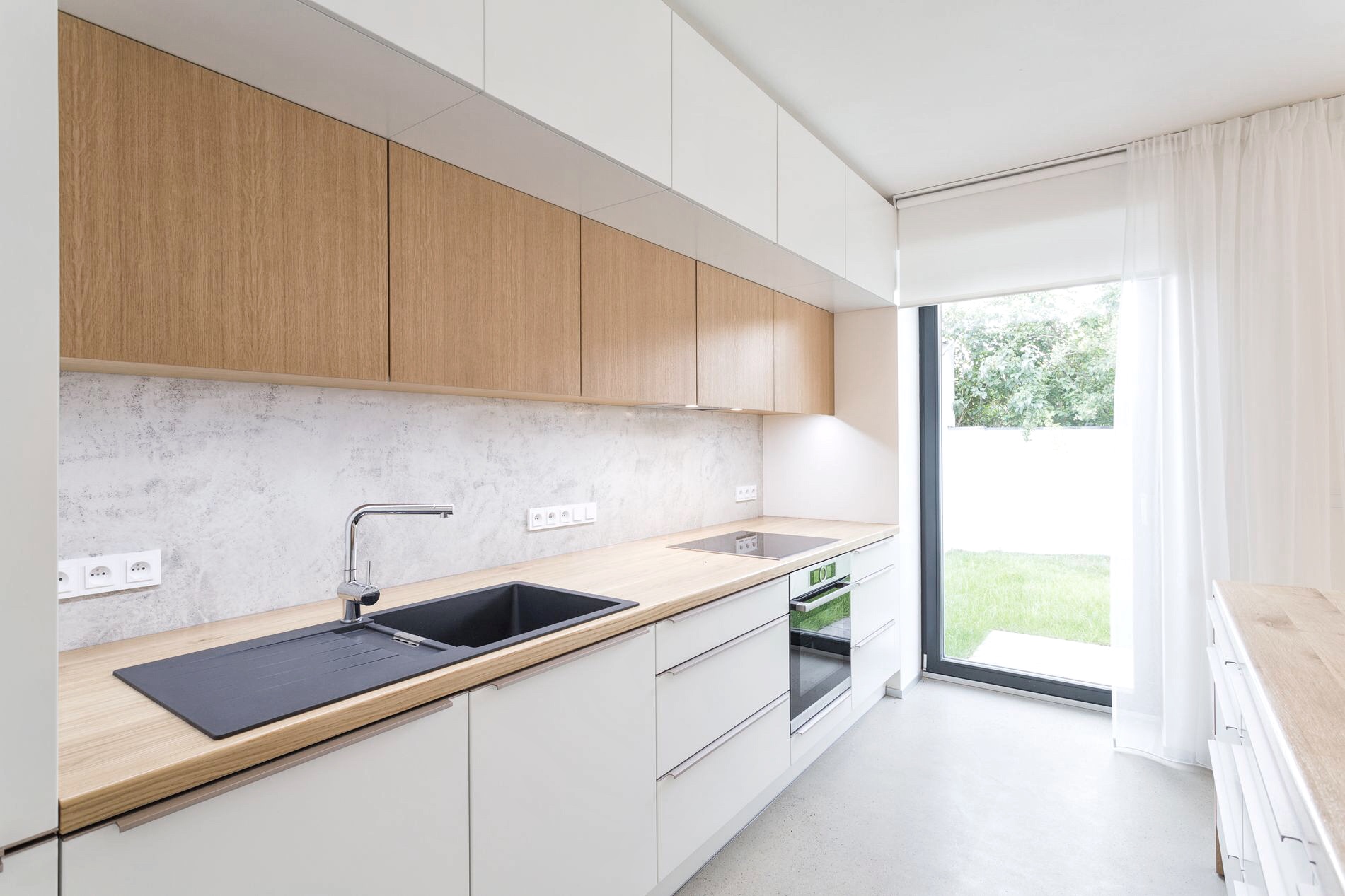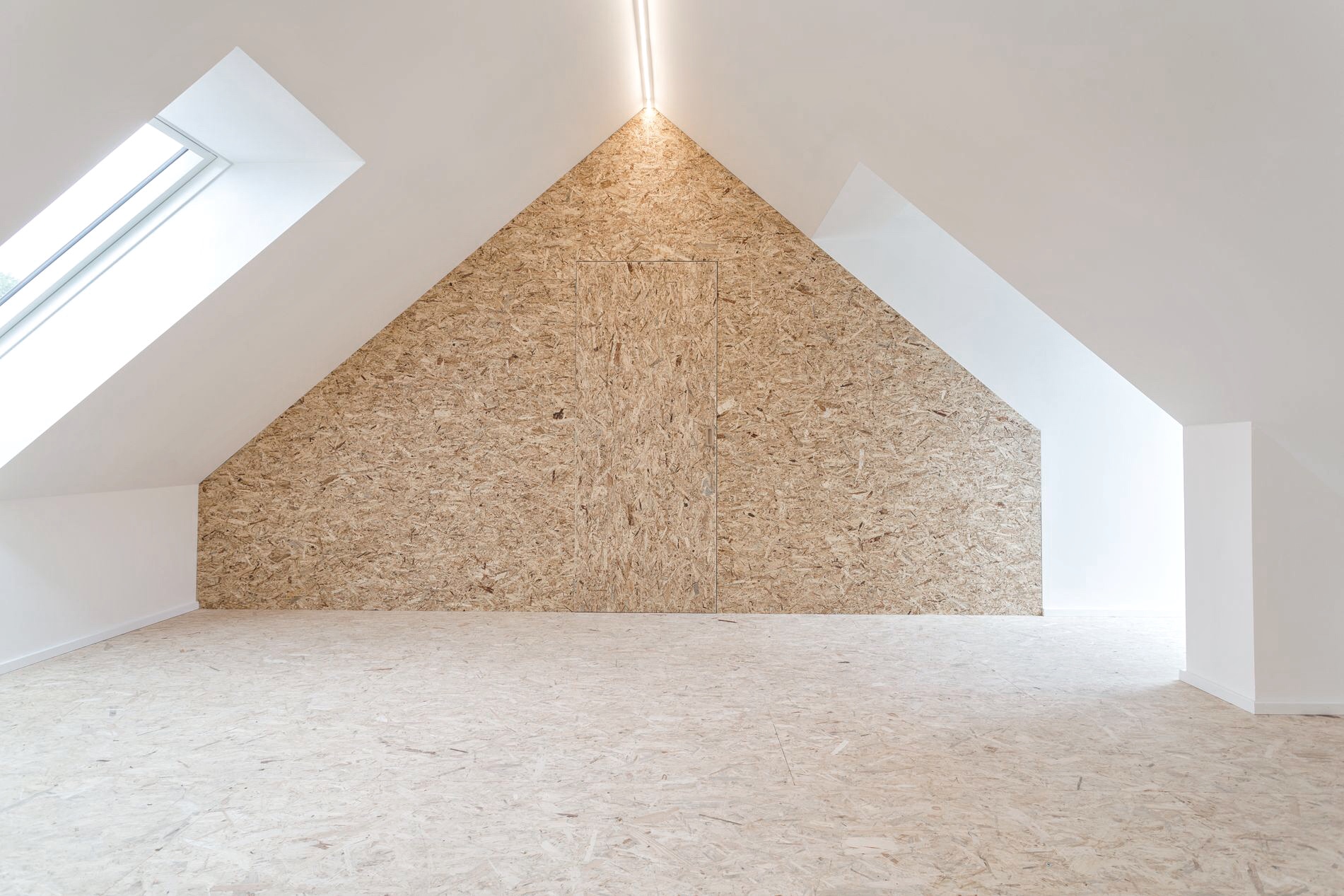 Návrh pracuje s jednoduchými geometrickými tvarmi priestorov, stavebných prvkov i vybavenia. Používa len niekoľko základných farieb (biela a šedá) a materiálov (dubové drevo, OSB, nerezová oceľ, leštený betón), ktoré sú použité v celom dome. Voľba farieb a materiálov pomáha celkovej svetlosti a otvorenosti priestoru.