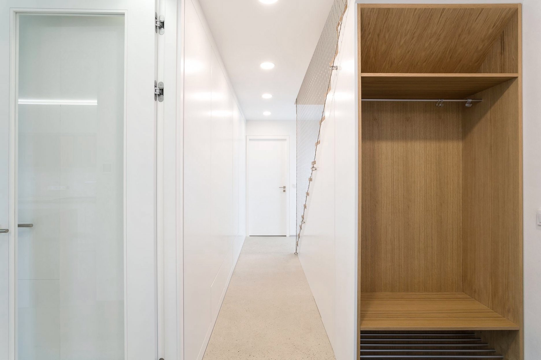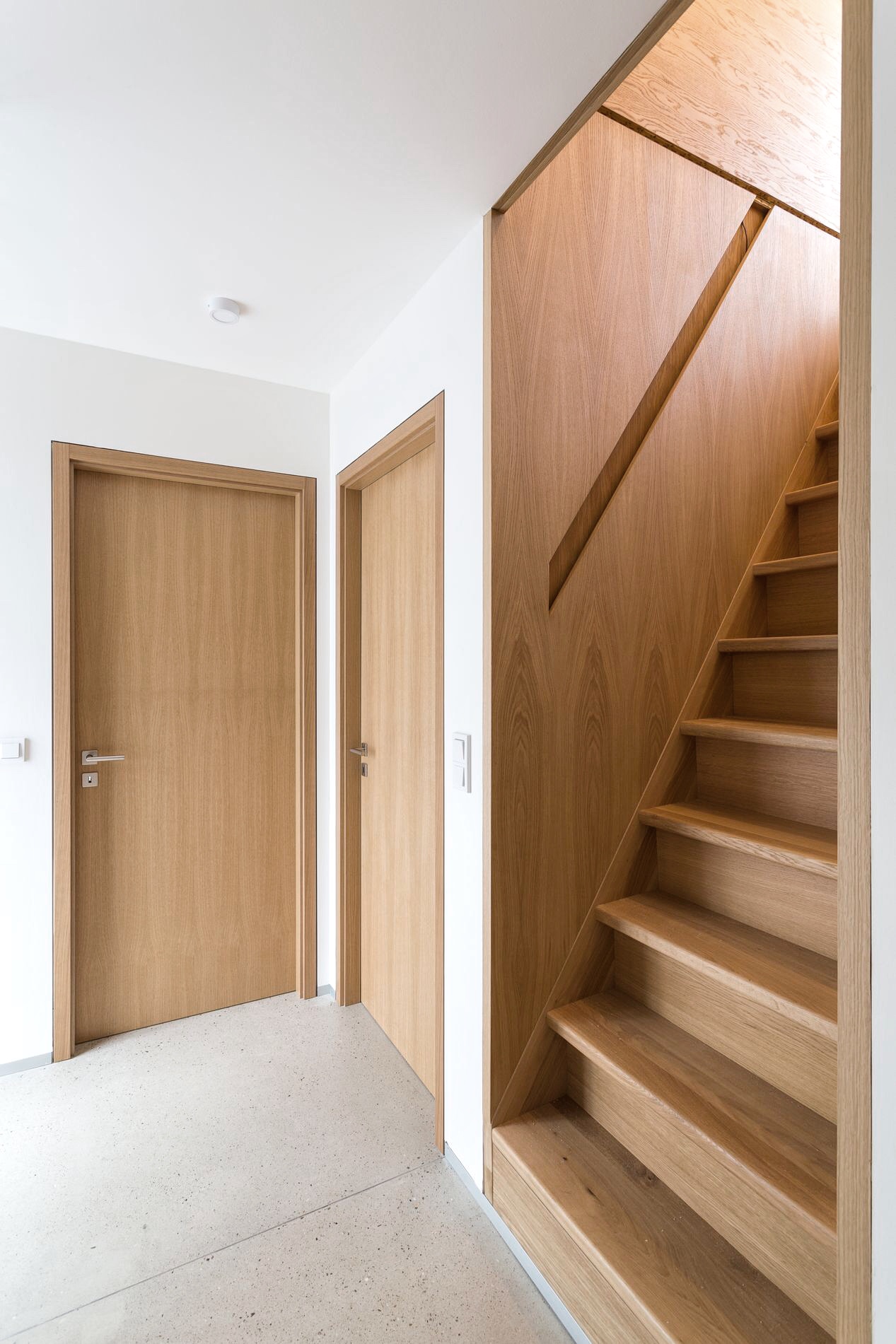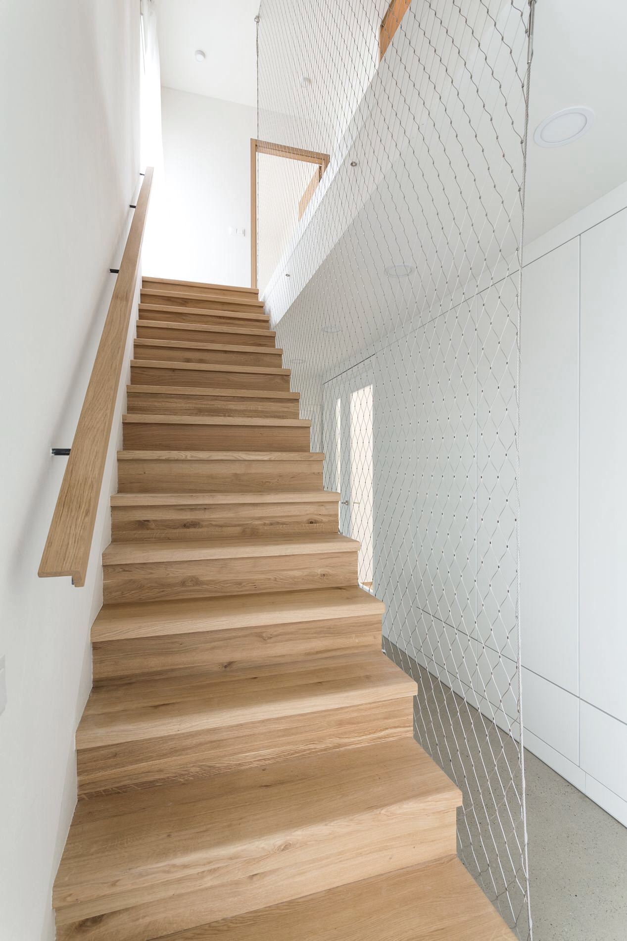 Každému najmenšiemu detailu bola venovaná pozornosť. Zárubne lícujú s povrchmi stien i vstavaného nábytku, hrany povrchov podláh nadväzujú na dverné či okenné otvory, svietidlá i ďalšie elektromontážne prvky sú osovo komponované, revízne otvory sú skryté v obkladoch. Interiér domu je na prvý pohľad striedmy a jednoduchý, v skutočnosti však komplexný a vzájomne previazaný celok.