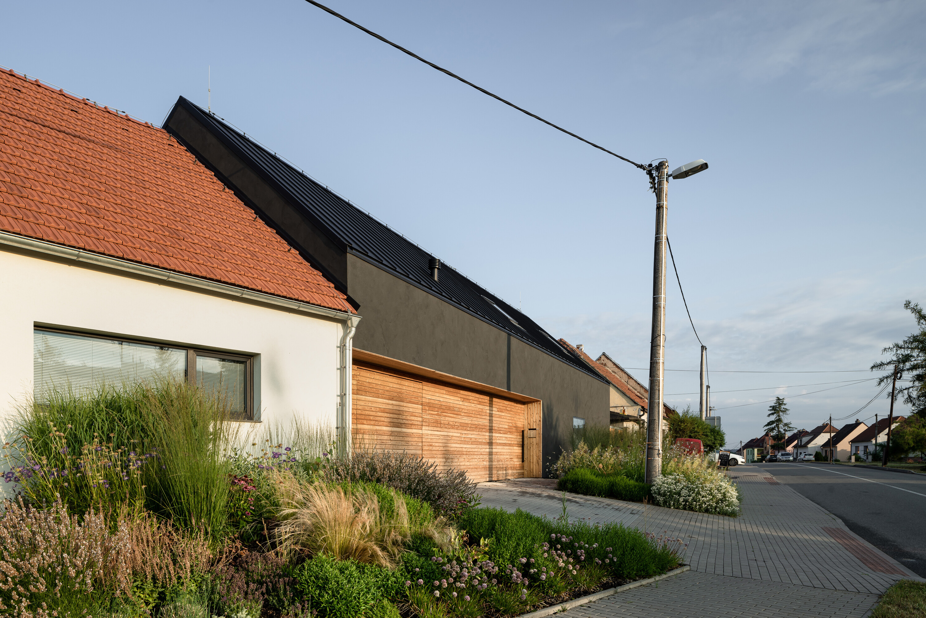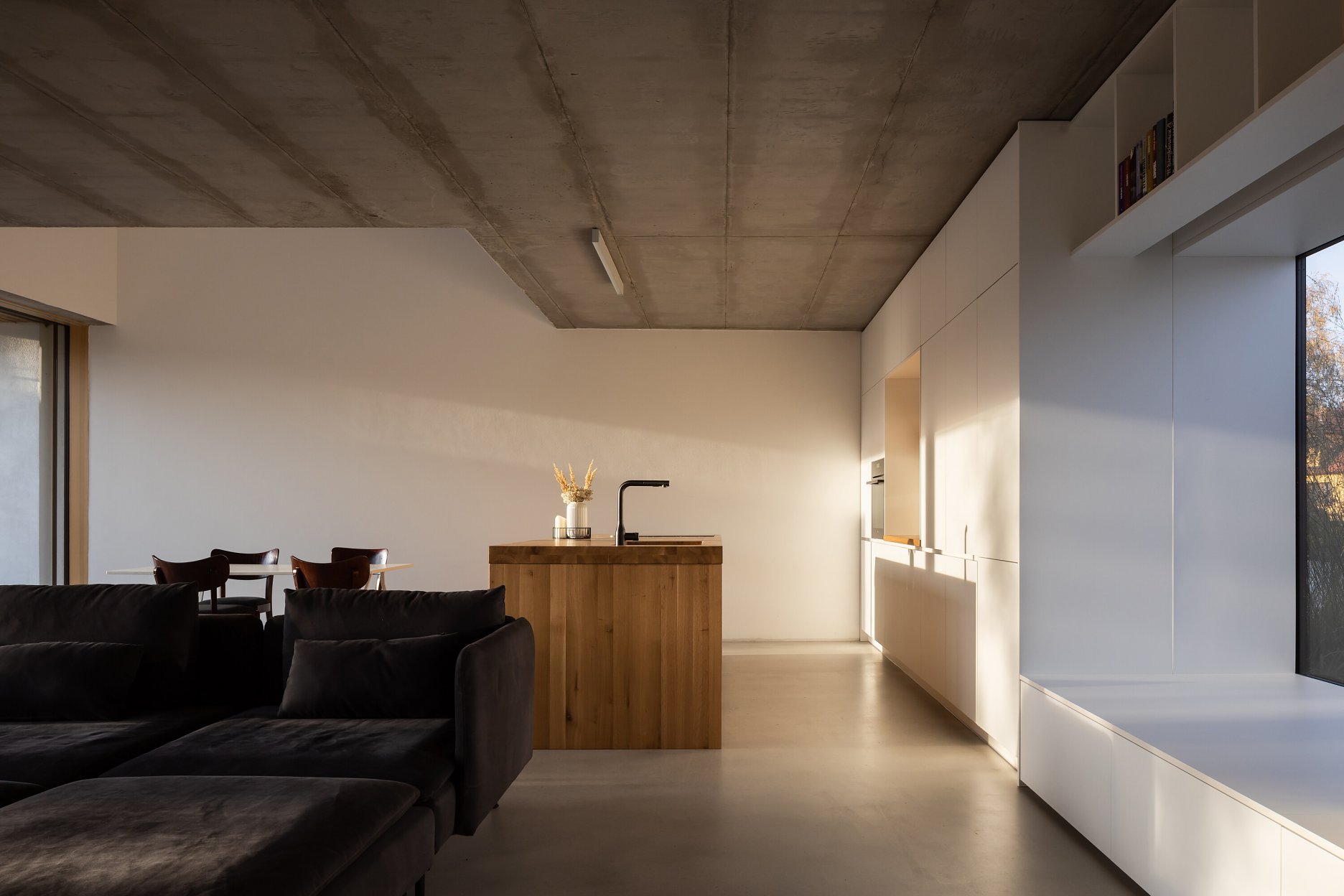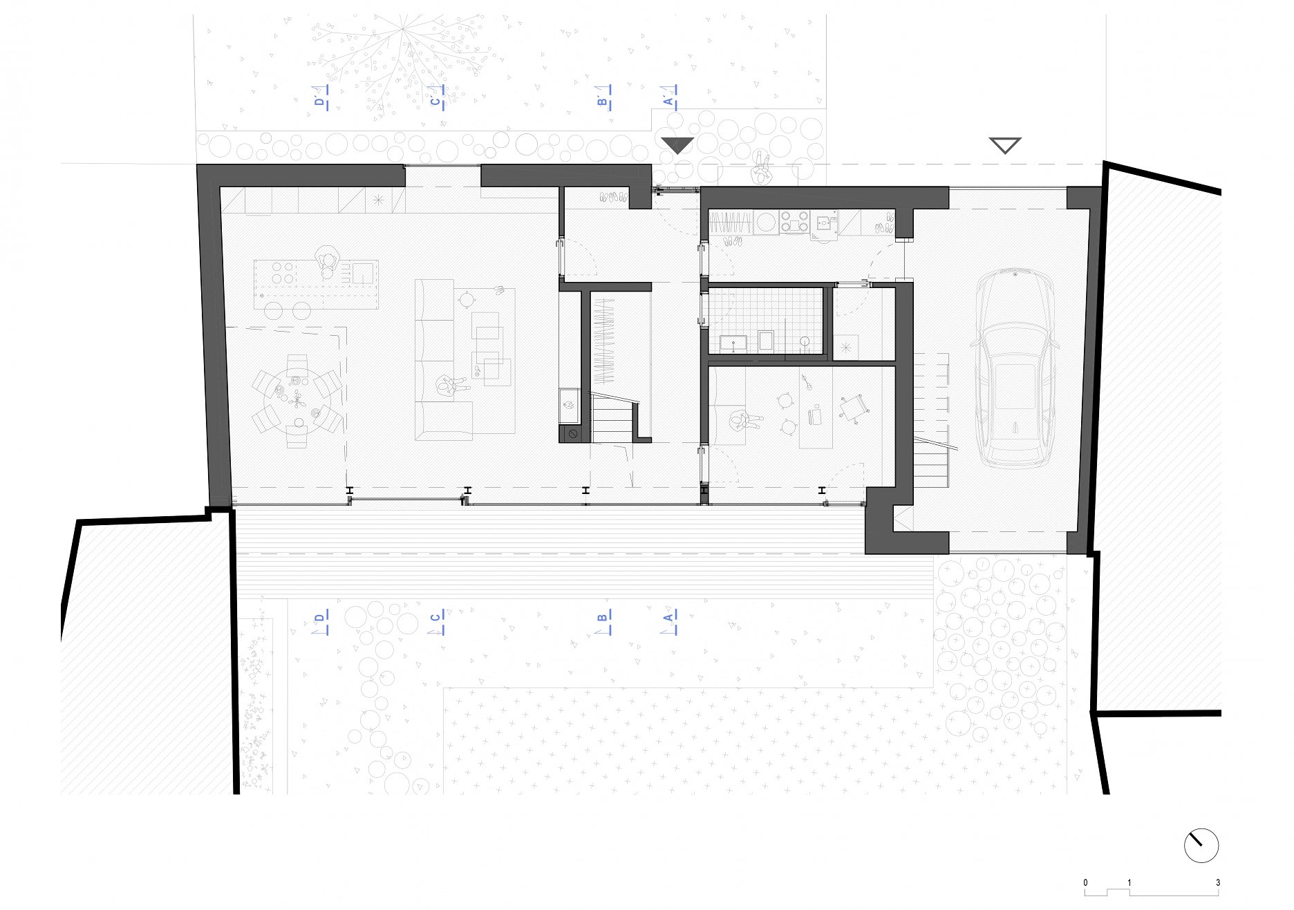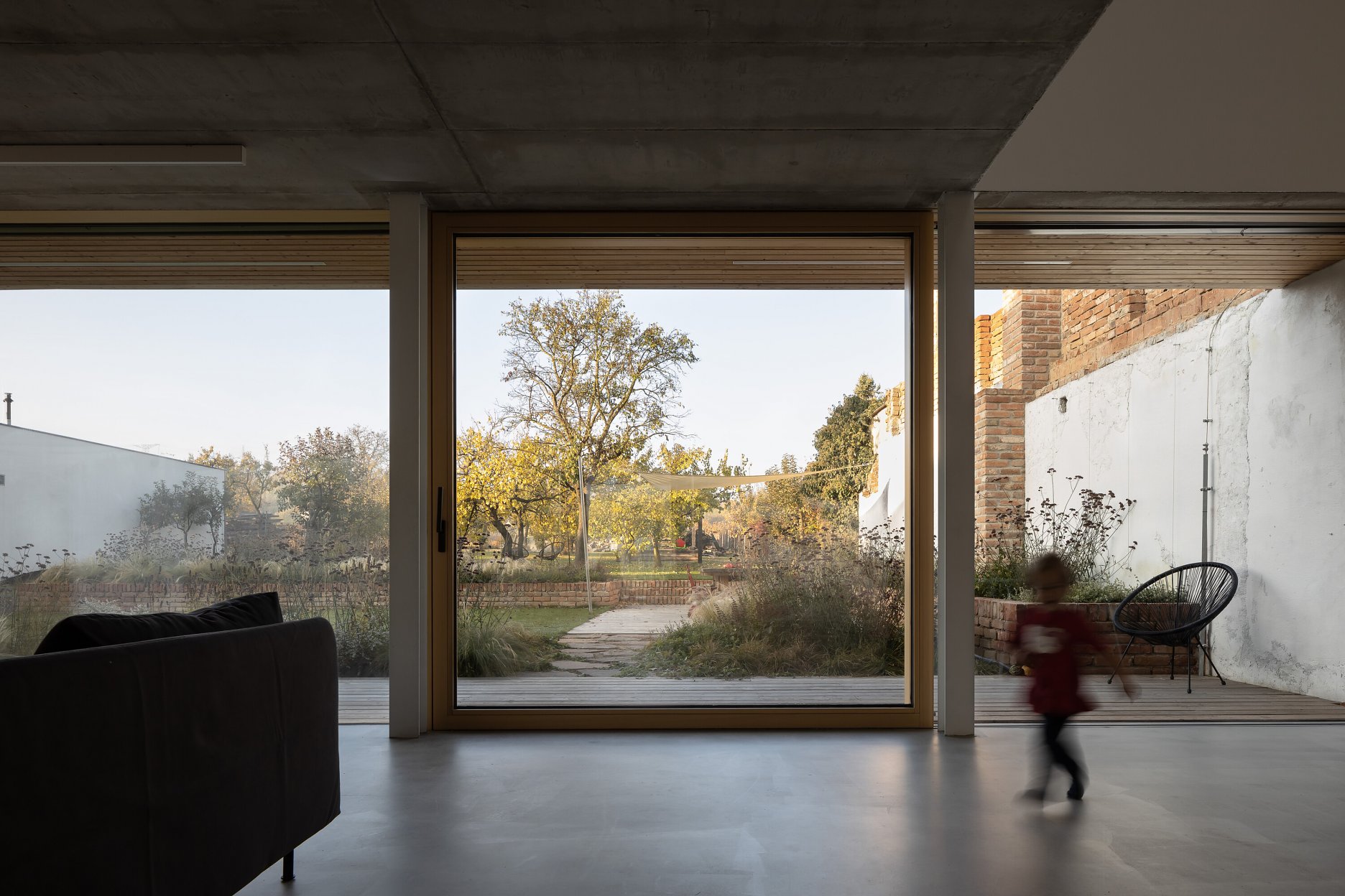Zatiaľ čo do ulice dom pôsobí uzavretým dojmom, do záhrady sa otvára prostredníctvom rozsiahleho presklenia dennej zóny. V interiéri odhaľuje základné materiály konštrukcie. V priestore dominujú surové povrchy cementových podláh a priznaných monolitických stropov. Jednoliate povrchy bielych stien a vstavaného nábytku dopĺňa výrazná textúra masívnych dubových prvkov. Dispozičné riešenie reflektuje princípy miestnej zástavby. Dom je rozdelený na dva základné celky - prejazdnú garáž s pôjdom a časť určenú na bývanie.