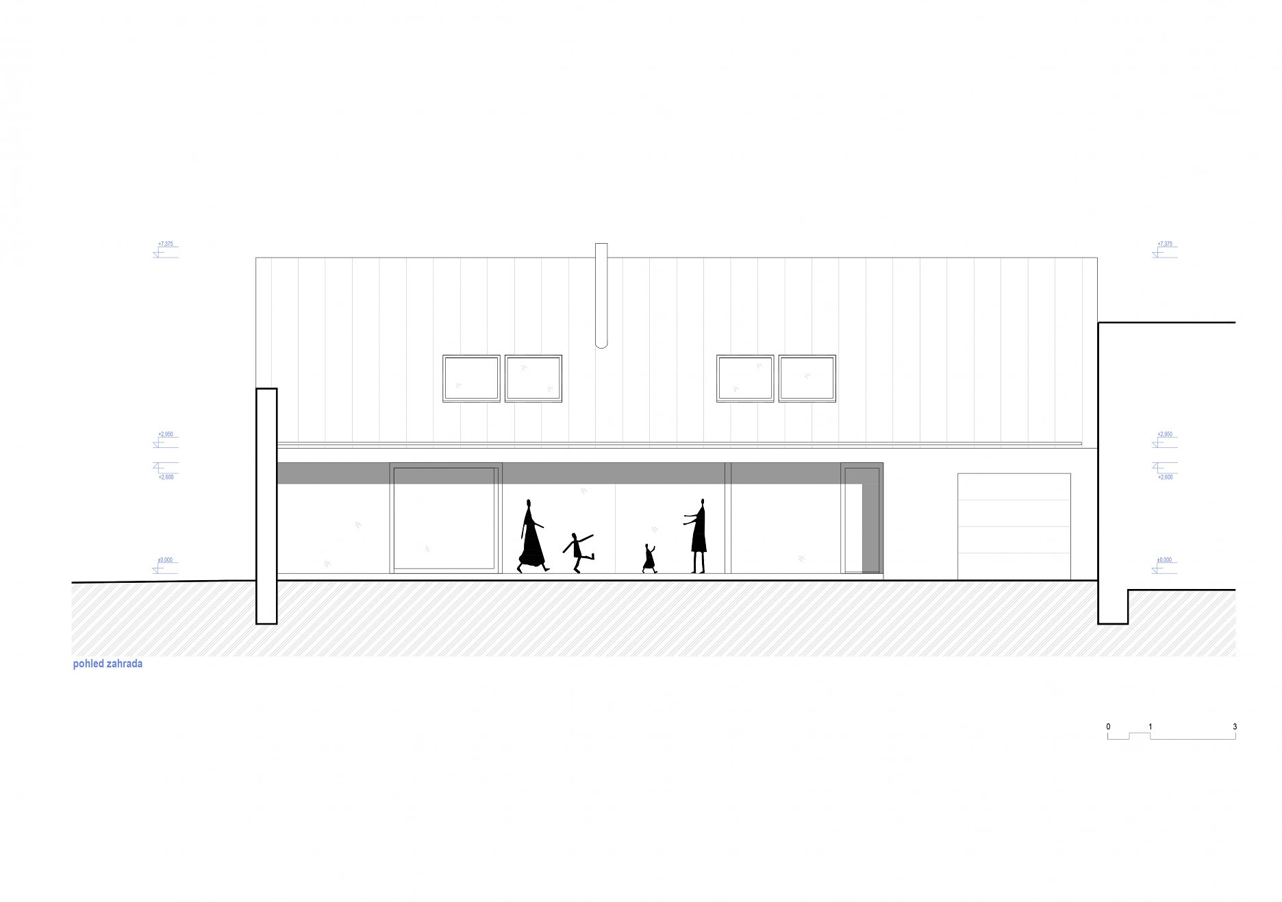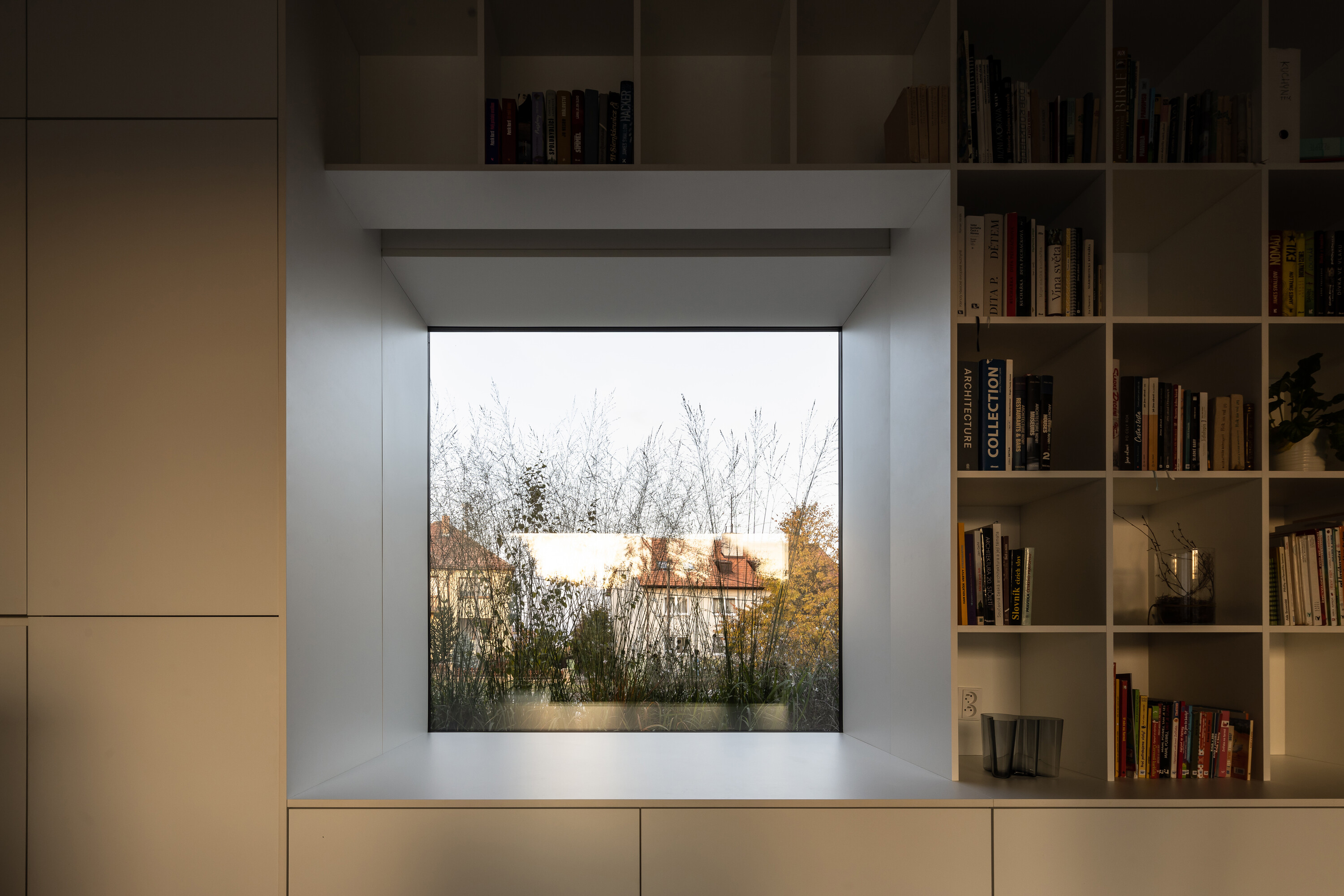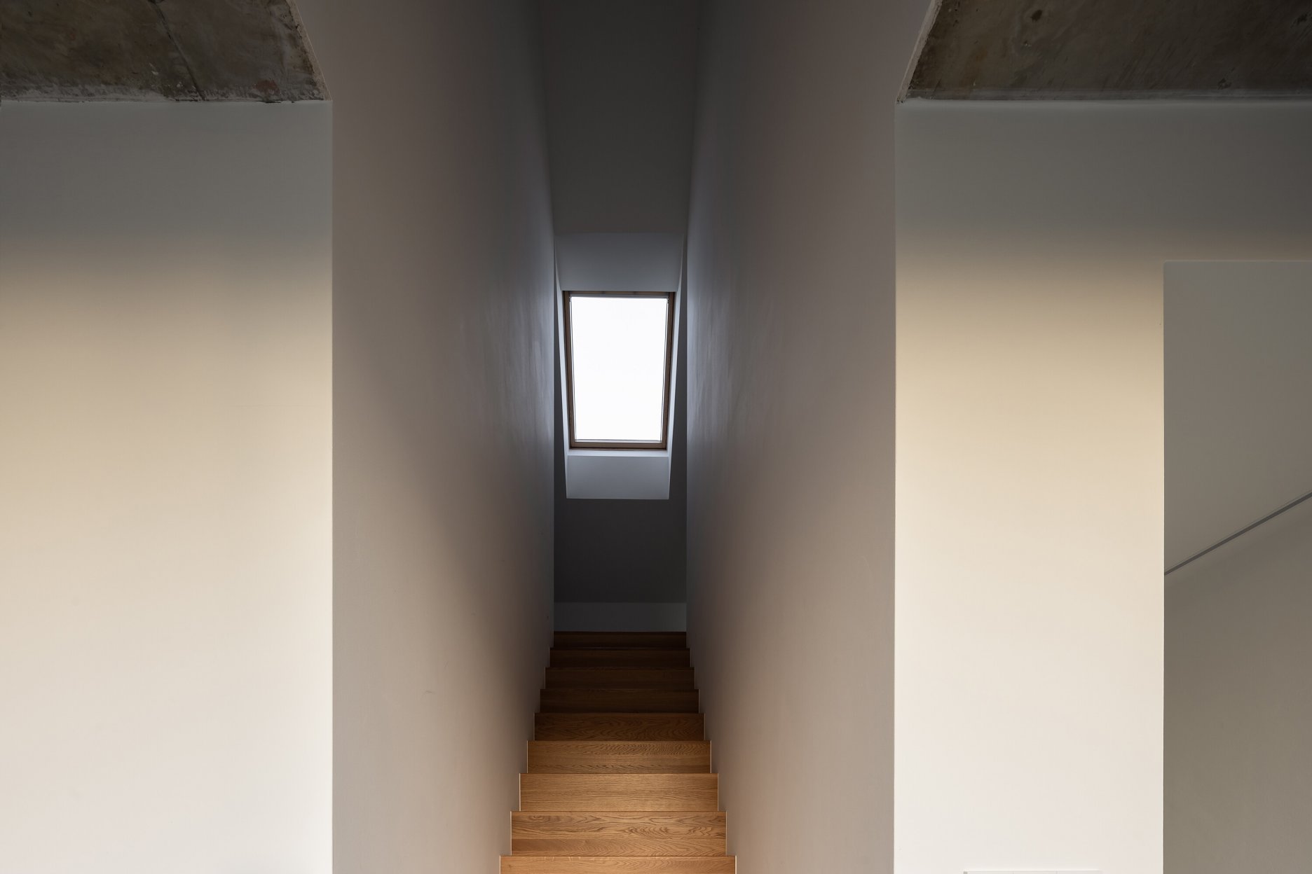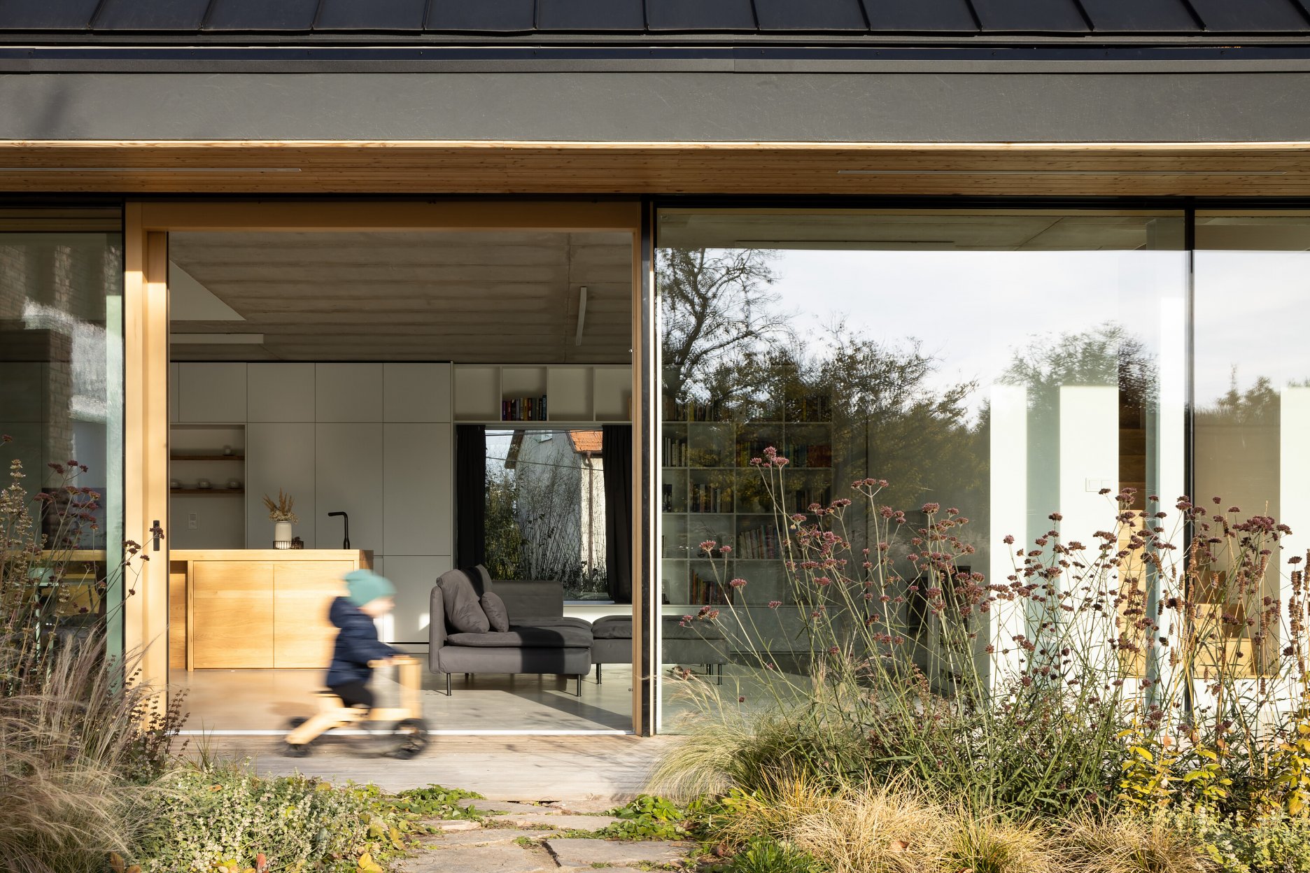 Zatiaľ čo do ulice dom pôsobí uzavretým dojmom, do záhrady sa otvára prostredníctvom rozsiahleho presklenia dennej zóny. V interiéri odhaľuje základné materiály konštrukcie. V priestore dominujú surové povrchy cementových podláh a priznaných monolitických stropov. Jednoliate povrchy bielych stien a vstavaného nábytku dopĺňa výrazná textúra masívnych dubových prvkov. Dispozičné riešenie reflektuje princípy miestnej zástavby. Dom je rozdelený na dva základné celky - prejazdnú garáž s pôjdom a časť určenú na bývanie.
