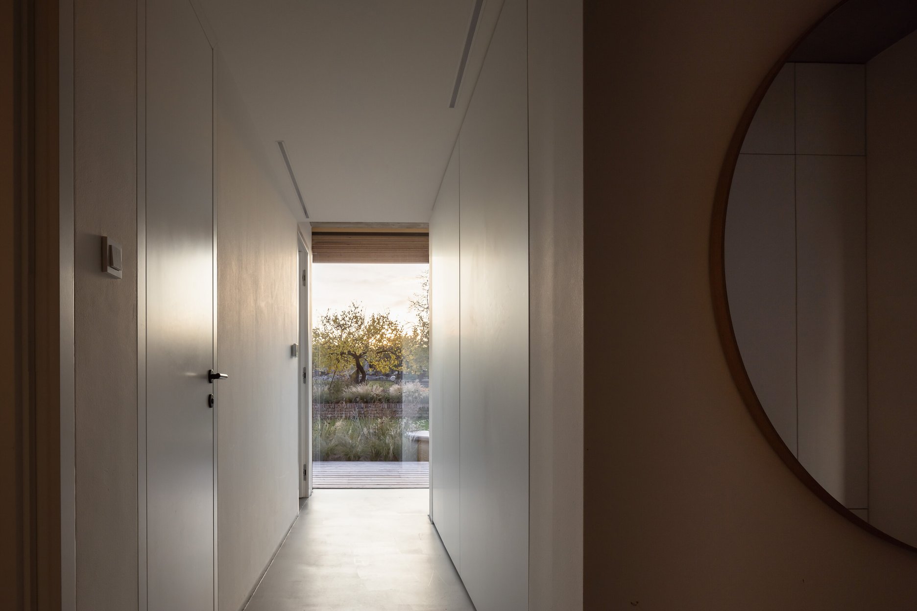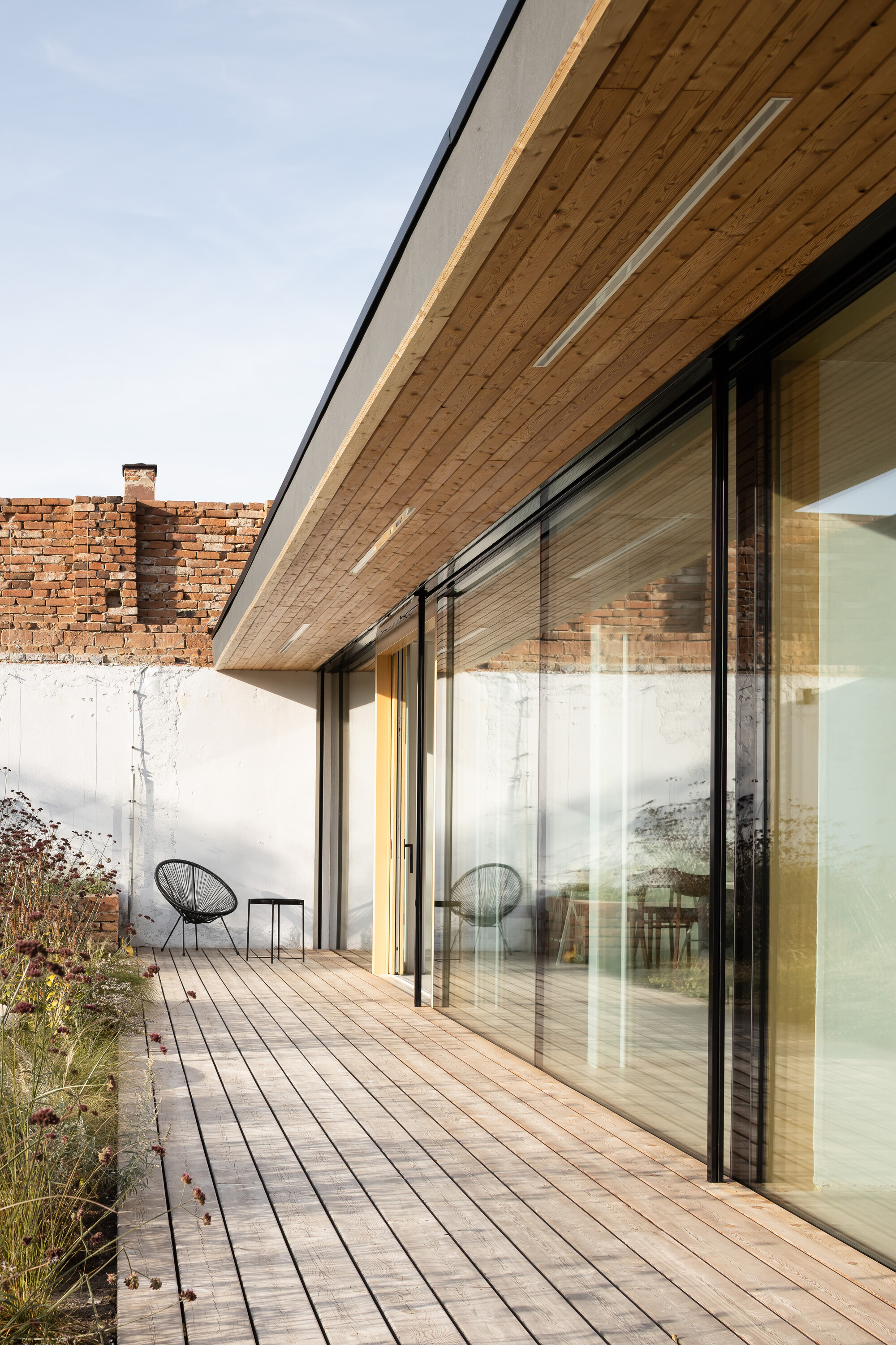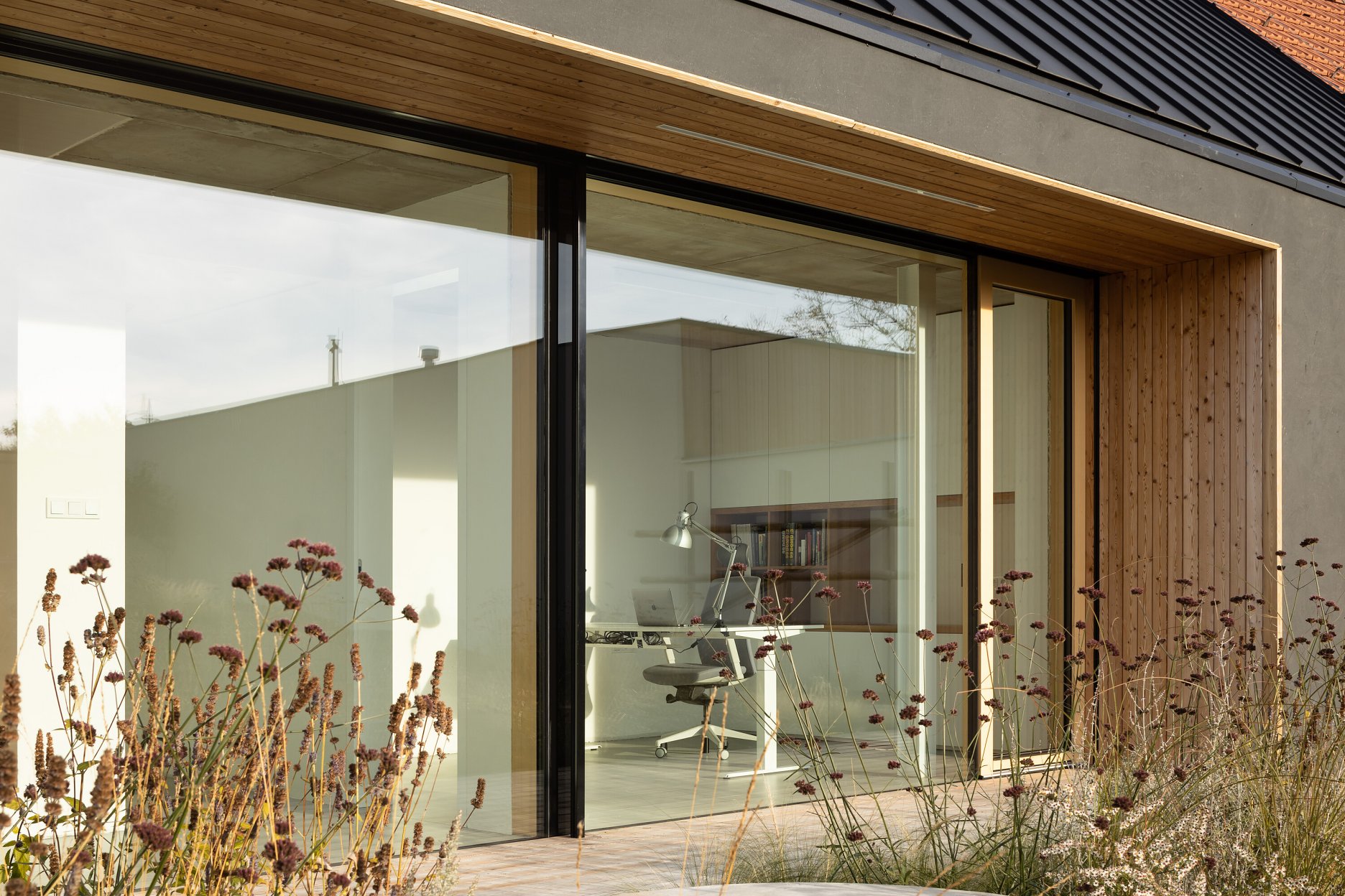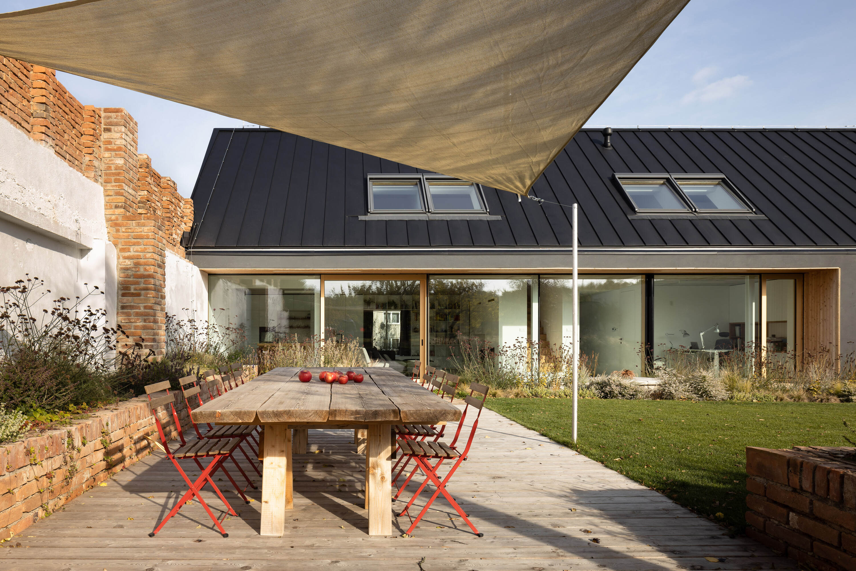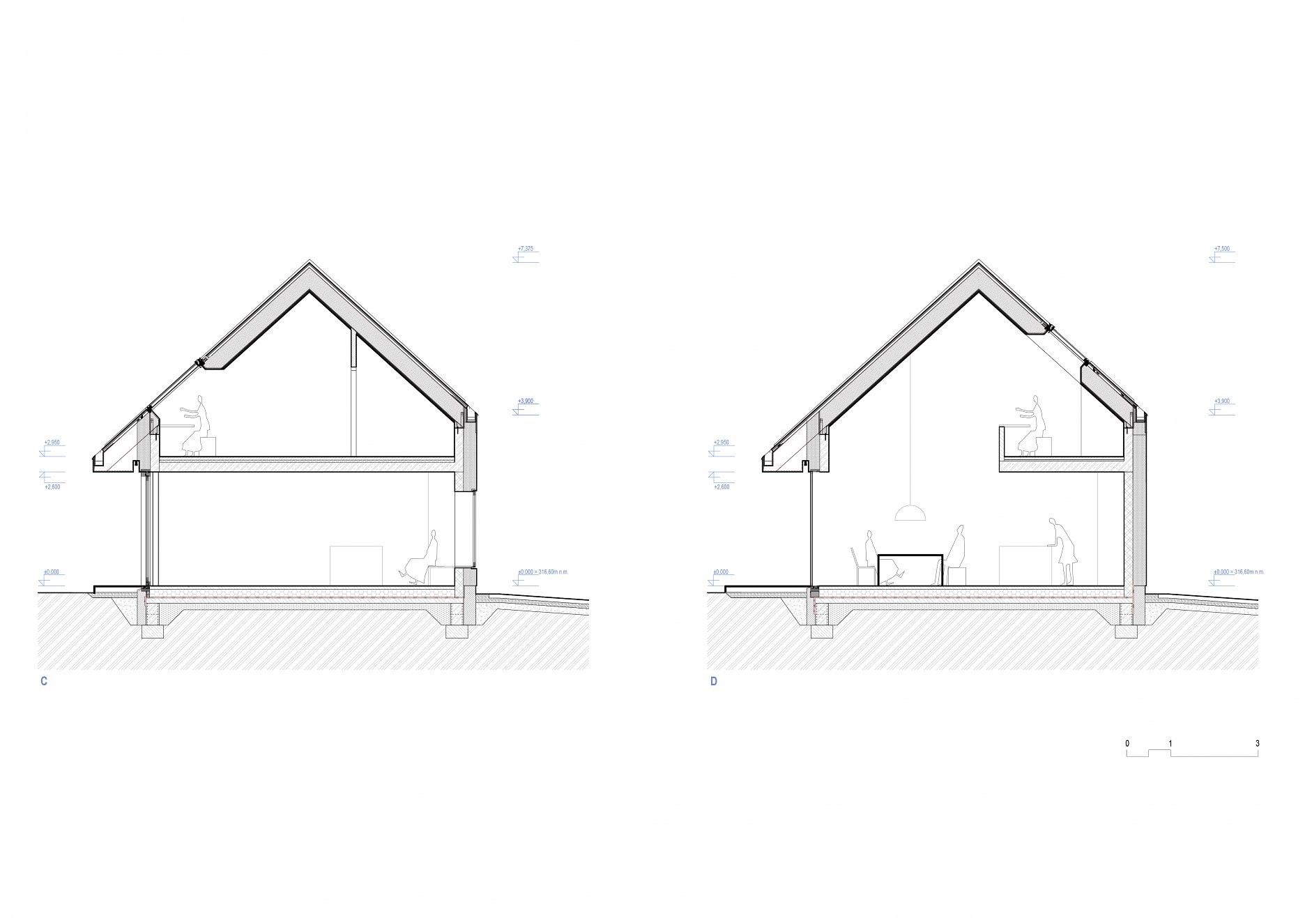 Zatiaľ čo do ulice dom pôsobí uzavretým dojmom, do záhrady sa otvára prostredníctvom rozsiahleho presklenia dennej zóny. V interiéri odhaľuje základné materiály konštrukcie. V priestore dominujú surové povrchy cementových podláh a priznaných monolitických stropov. Jednoliate povrchy bielych stien a vstavaného nábytku dopĺňa výrazná textúra masívnych dubových prvkov. Dispozičné riešenie reflektuje princípy miestnej zástavby. Dom je rozdelený na dva základné celky - prejazdnú garáž s pôjdom a časť určenú na bývanie.