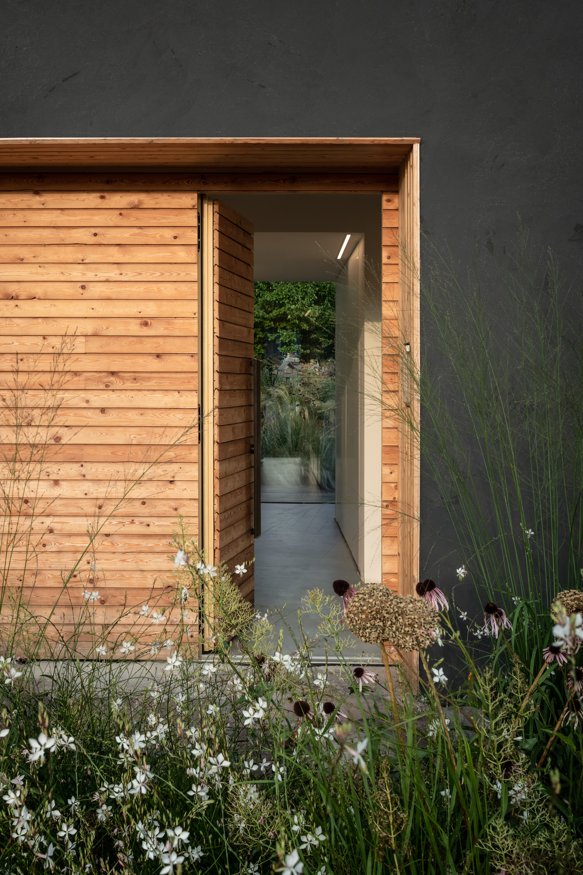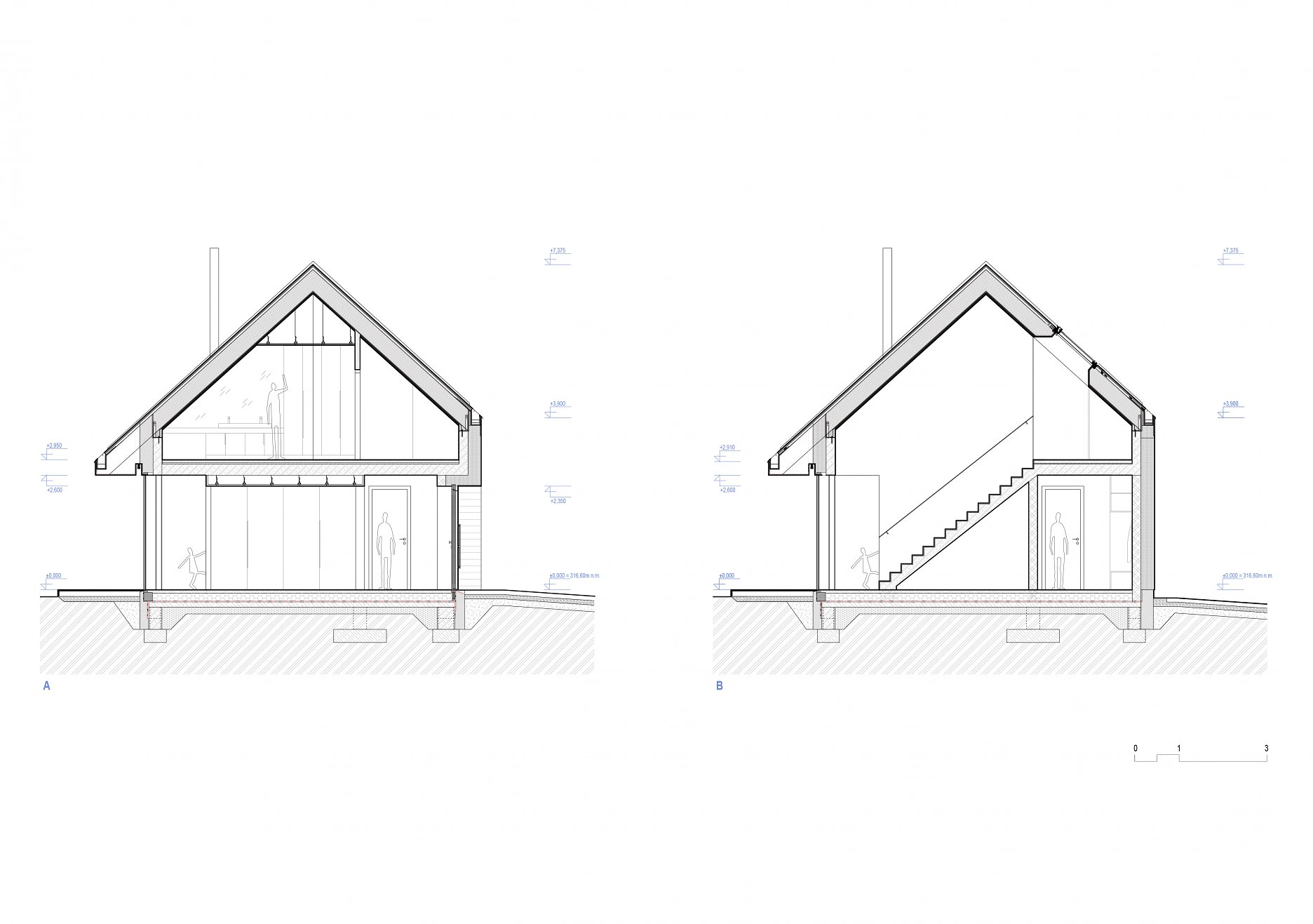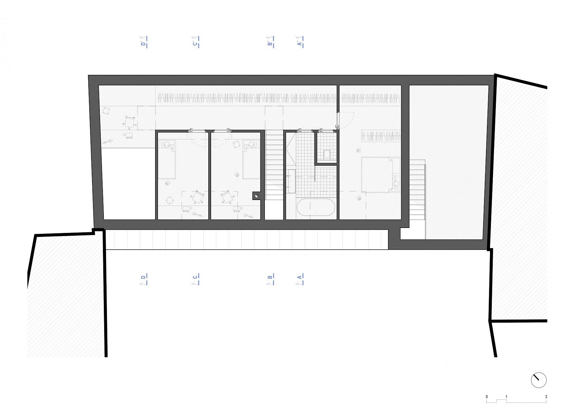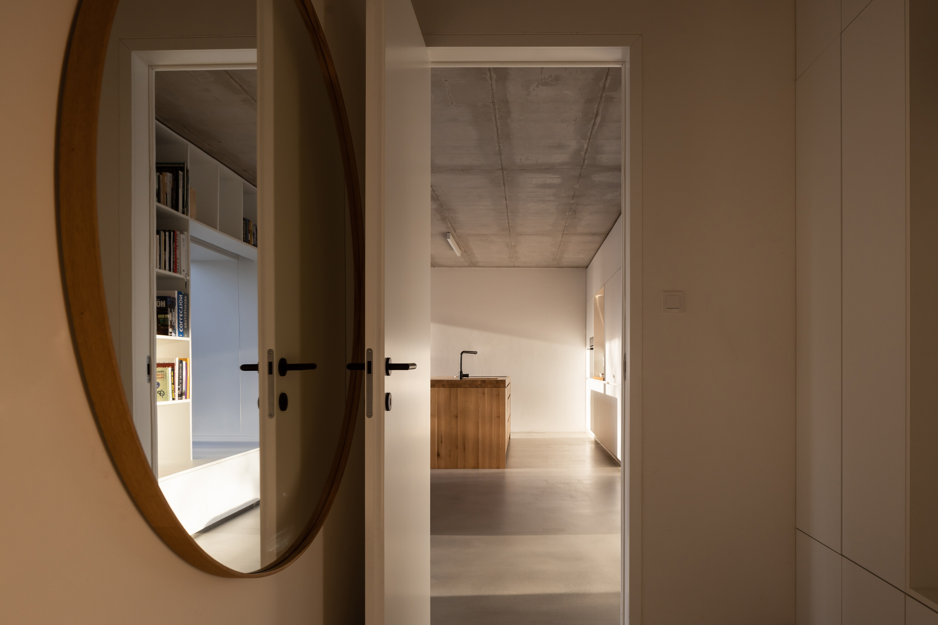 Zatiaľ čo do ulice dom pôsobí uzavretým dojmom, do záhrady sa otvára prostredníctvom rozsiahleho presklenia dennej zóny. V interiéri odhaľuje základné materiály konštrukcie. V priestore dominujú surové povrchy cementových podláh a priznaných monolitických stropov. Jednoliate povrchy bielych stien a vstavaného nábytku dopĺňa výrazná textúra masívnych dubových prvkov. Dispozičné riešenie reflektuje princípy miestnej zástavby. Dom je rozdelený na dva základné celky - prejazdnú garáž s pôjdom a časť určenú na bývanie.