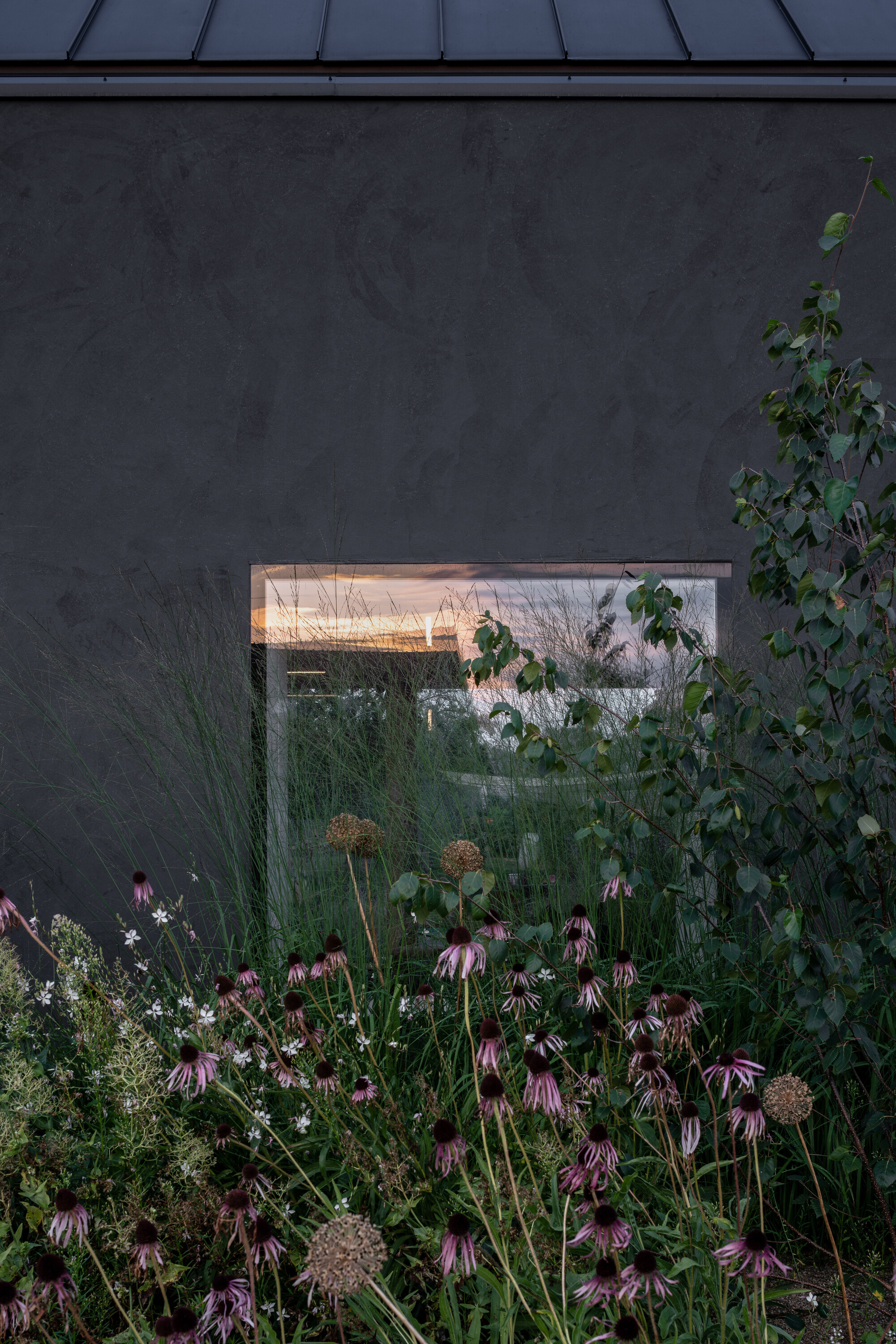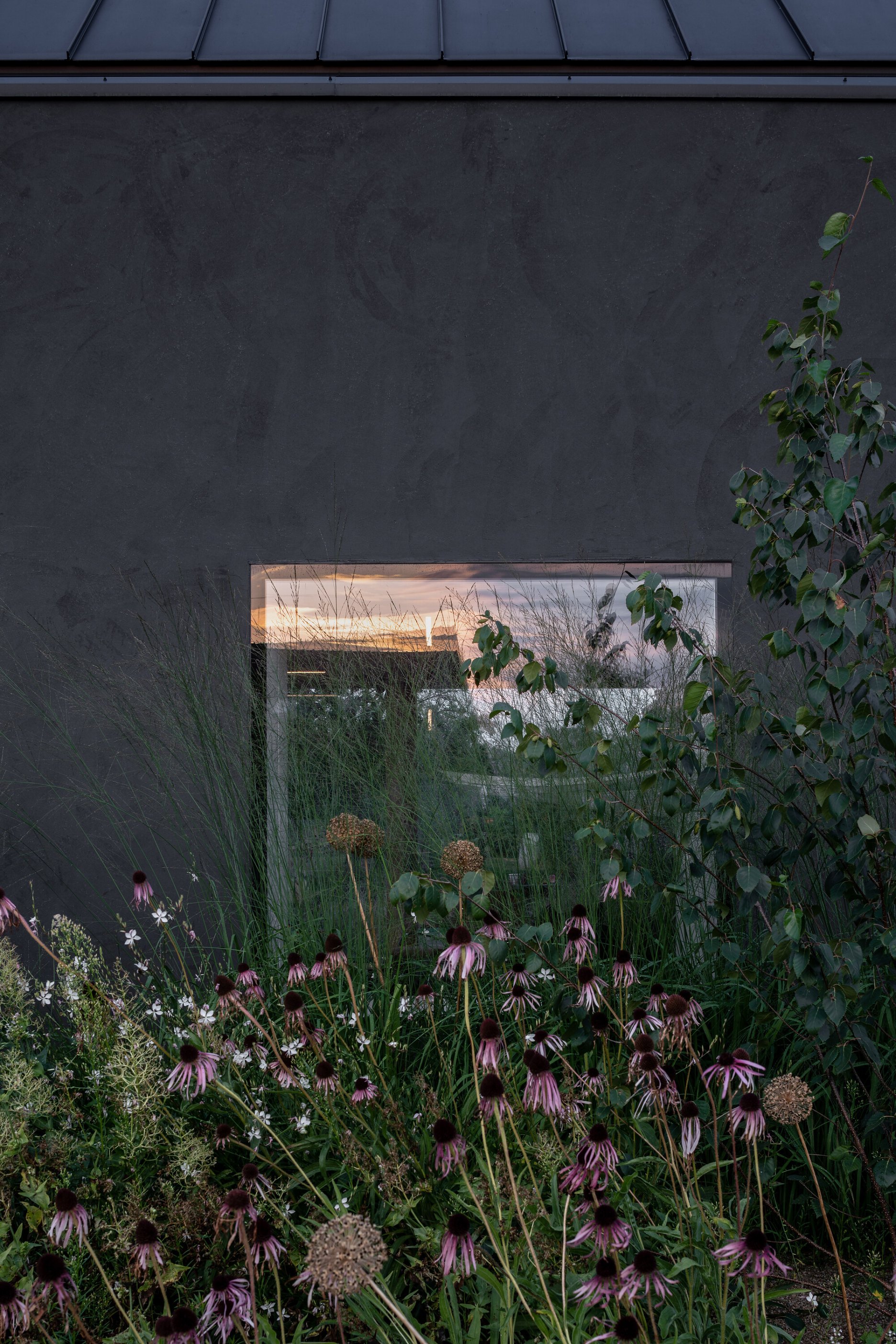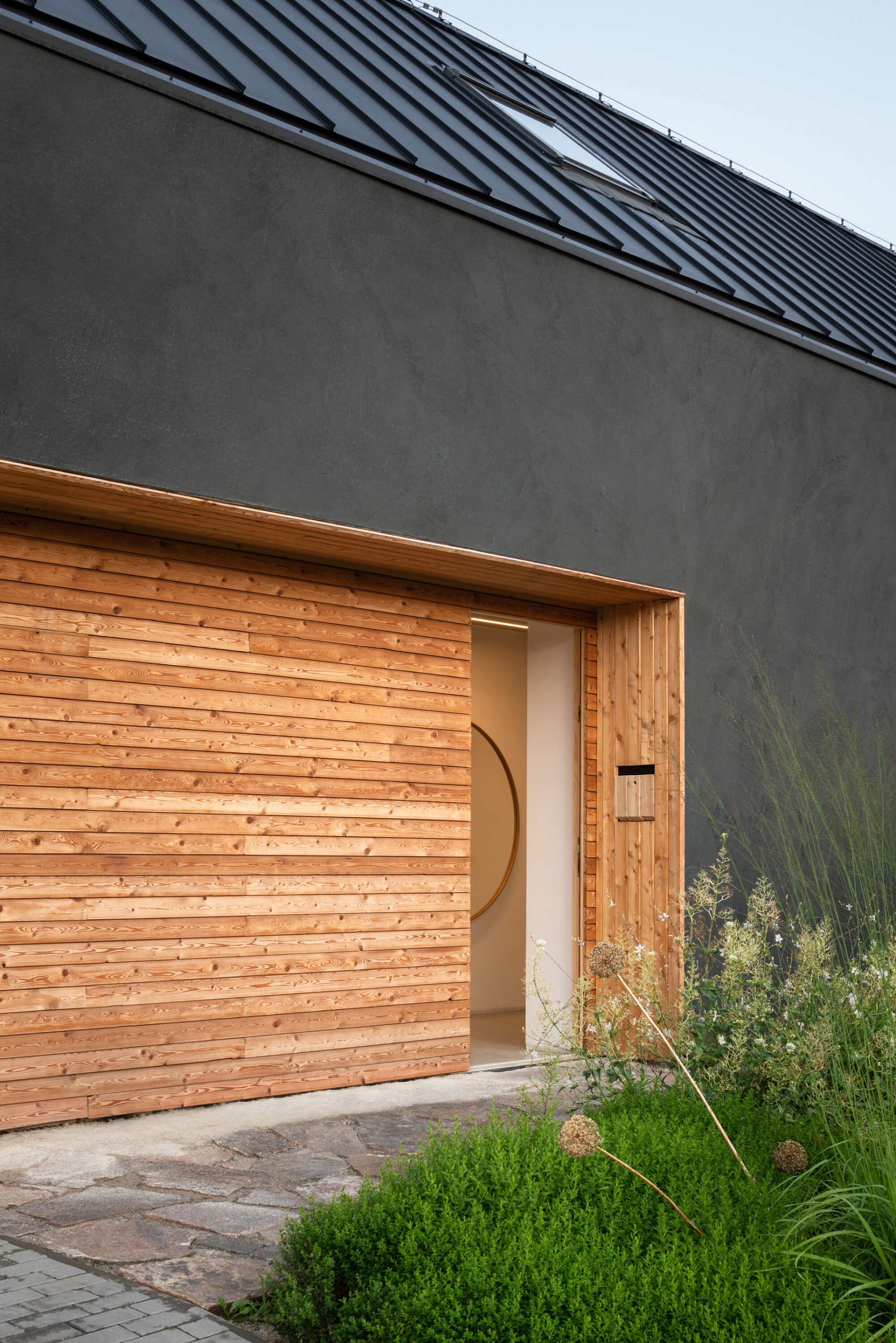 Voľba materiálov a farebnosti znázorňuje podľa slov autora vyplnenie “diery” / prázdneho priestoru po starom dome. Do zvoleného konceptu zapadá tmavosivá stierková omietka a falcovaná plechová strešná krytina. Drevený obklad zapusteného vstupu a vjazdu zachytáva hierarchiu priestoru na rozhraní interiéru a exteriéru.
