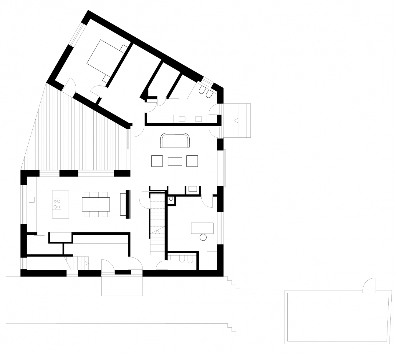 Dvojpodlažná stavba je čiastočne podpivničená. Nad rovinu plochej strechy vyčnieva strešná nadstavba, ktorá sprístupňuje krytú strešnú terasu. Najdôležitejším priestorom na prízemí je obývacia izba, ktorá je prepojená so záhradou obojstranne orientovaným zasklením.