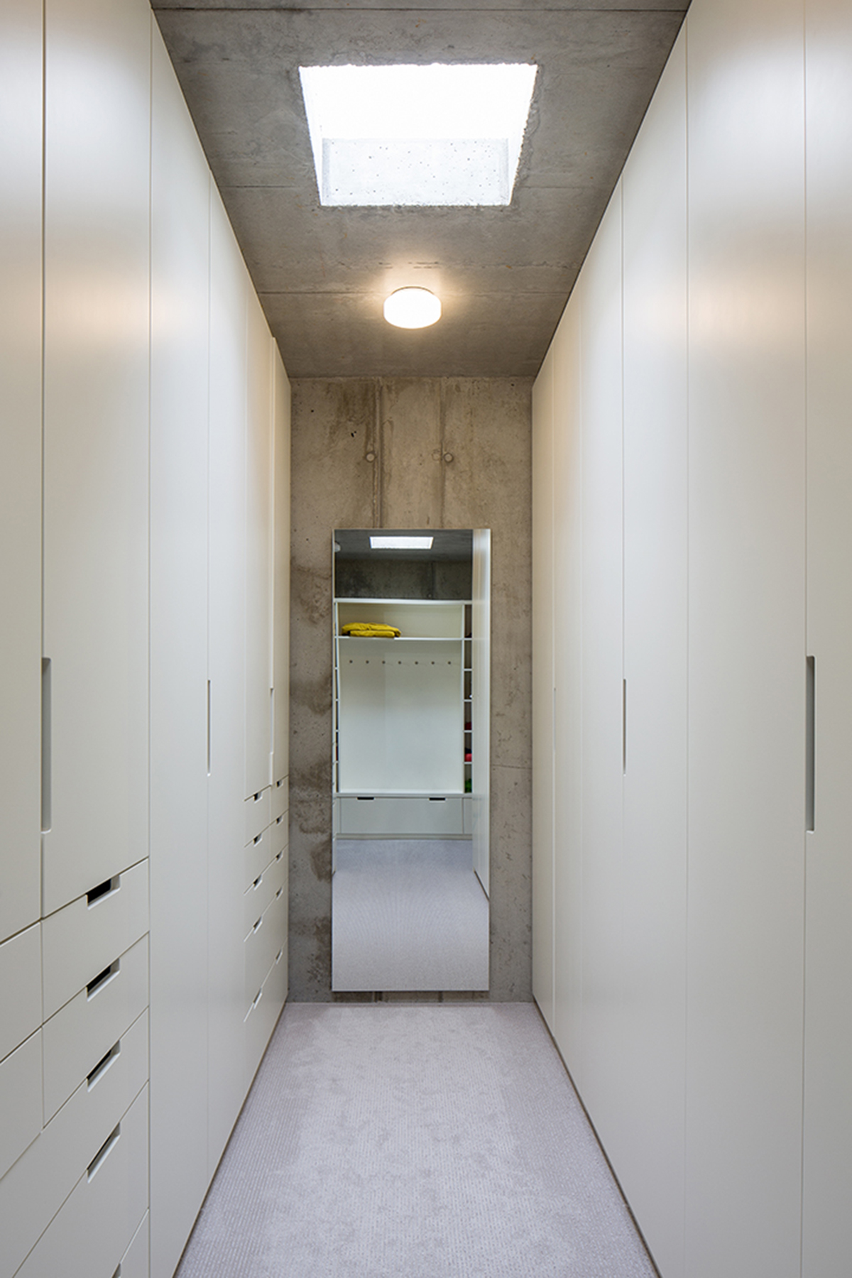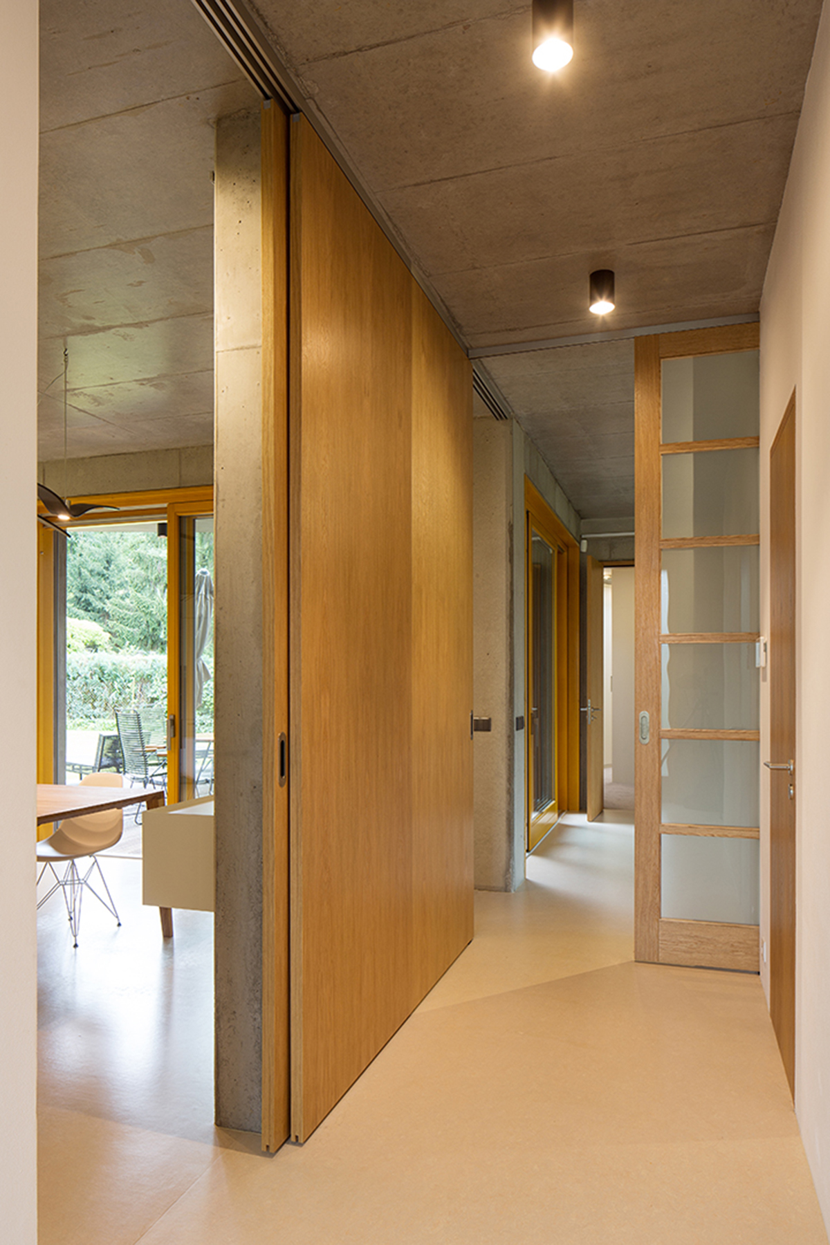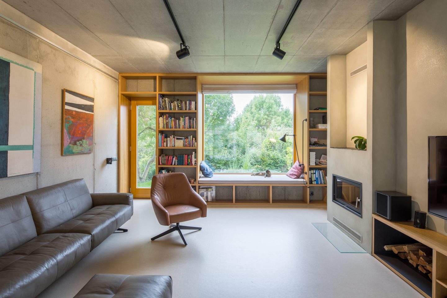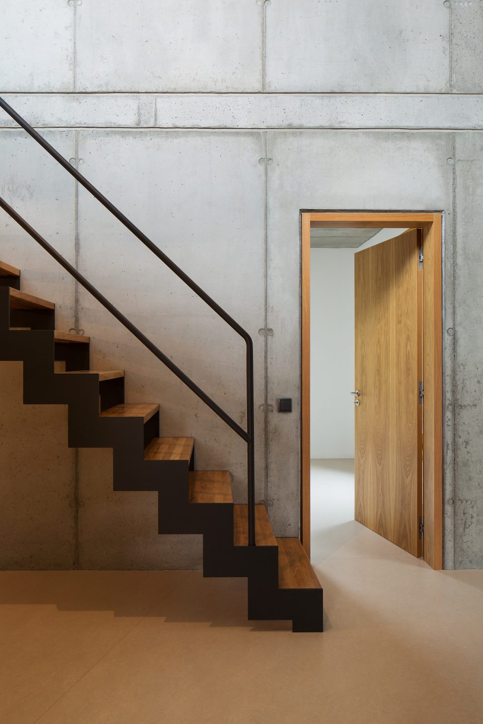 Kontrastné materiálové riešenie interiéru, využitie pohľadového betónu v kombinácii s dubovým drevom, necháva vyniknúť prirodzenú textúru a farebnosť materiálu.