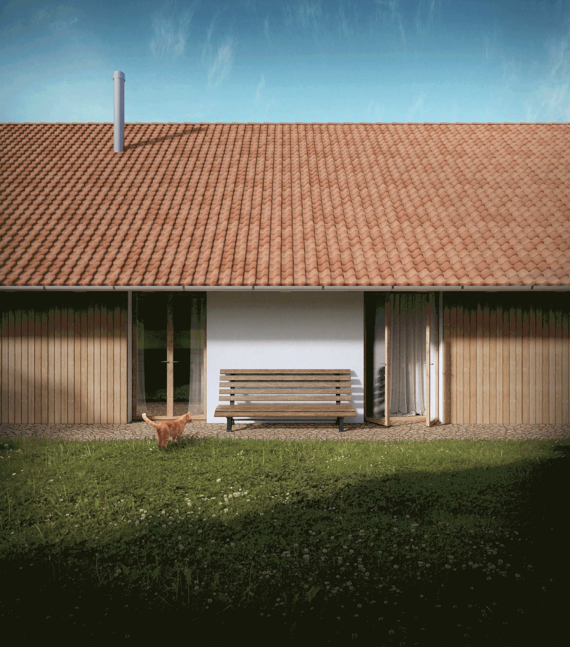 Tradičné materiály - červená keramická škridla, biele omietky a drevené okná - odkazujú na zničenú stavbu. Nový dom nekopíruje ten pôvodný, ale snaží sa prostredníctvom známych prvkov prinavrátiť atmosféru chýbajúceho domova.