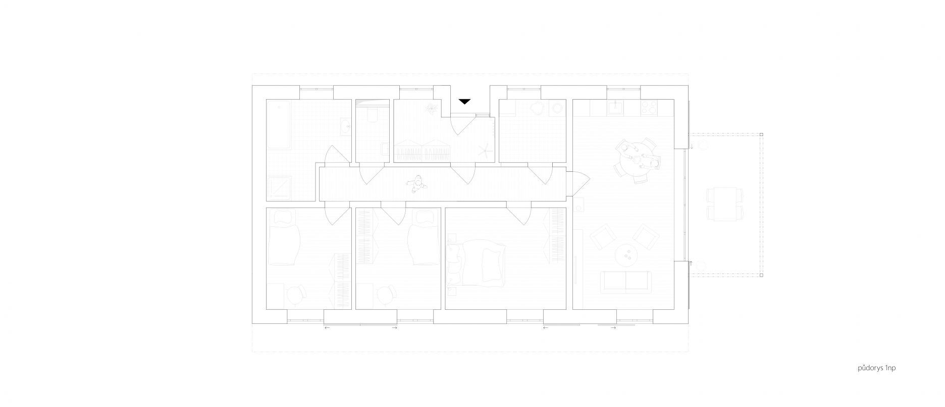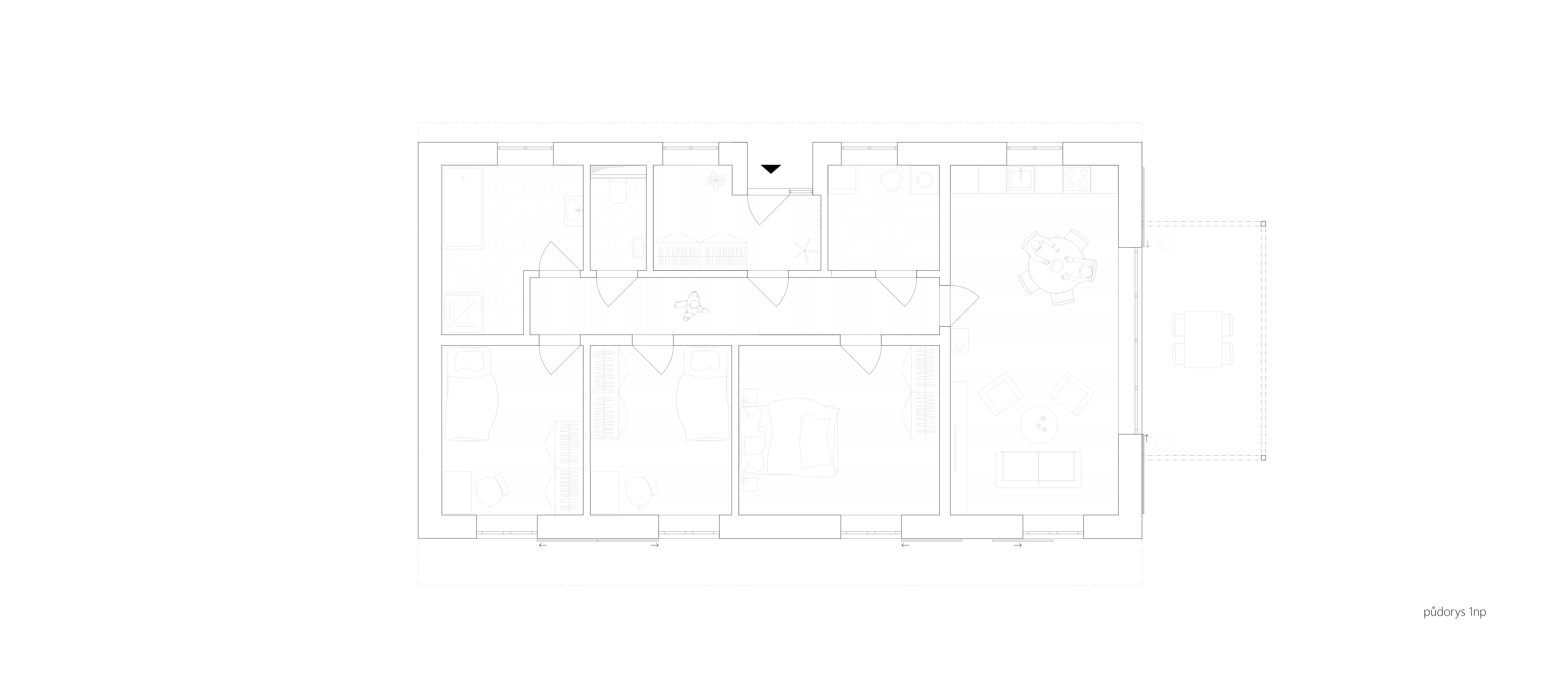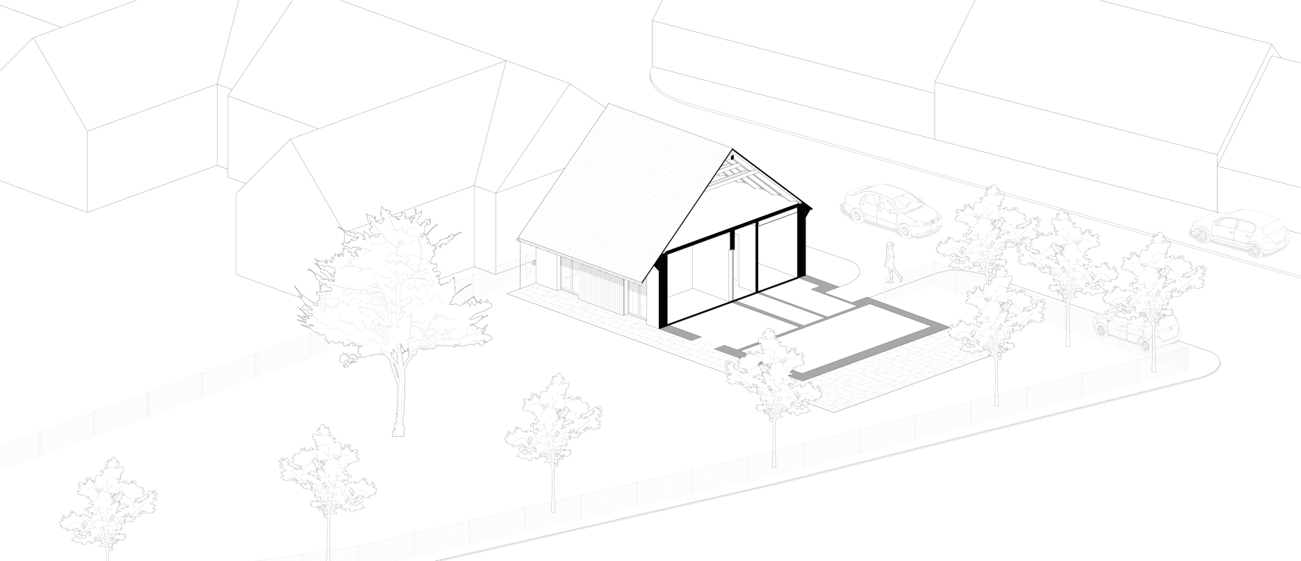 Návrh podľa slov architektov vychádza z princípov tradičných českých a moravských domov. Zapustený a krytý vstup z ulice sprístupňuje skromne riešenú nočnú časť domu s drevenou podlahou a stropom. Dennú zónu na juhozápade tvorí prevýšený priestor obývačky a kuchyne, otvorený do krovu.