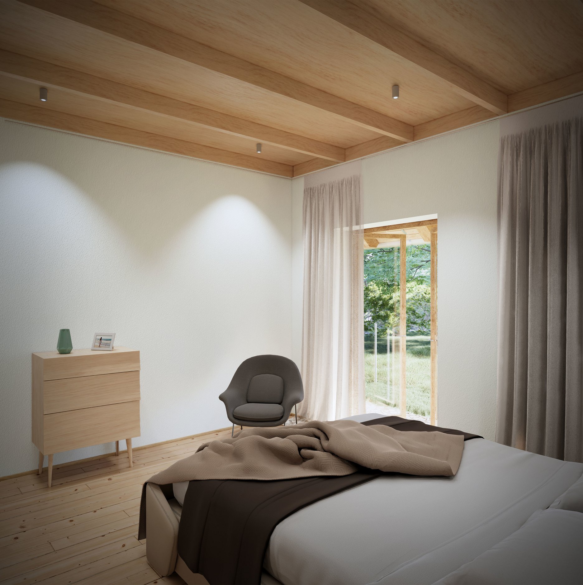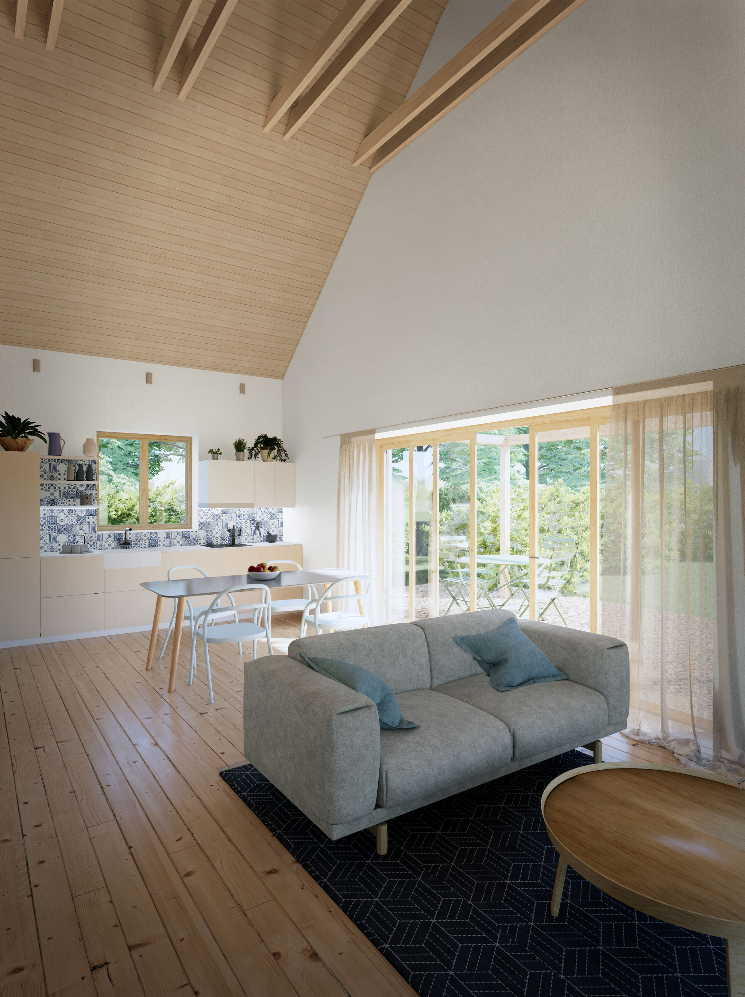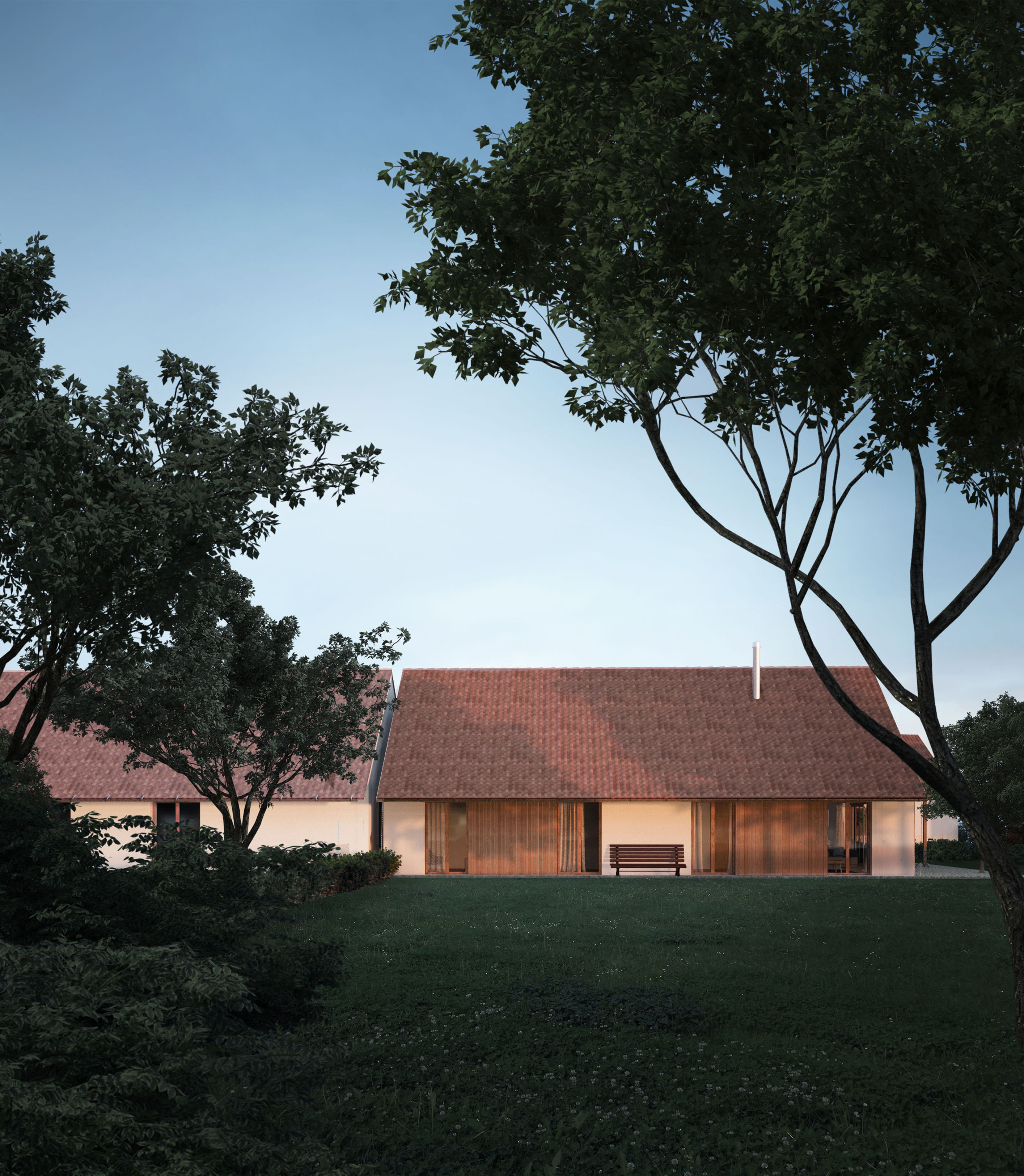 Všetky izby sú prepojené so záhradou cez vysoké francúzske okná, ktoré v lete tienia posuvné okenice a pergola.