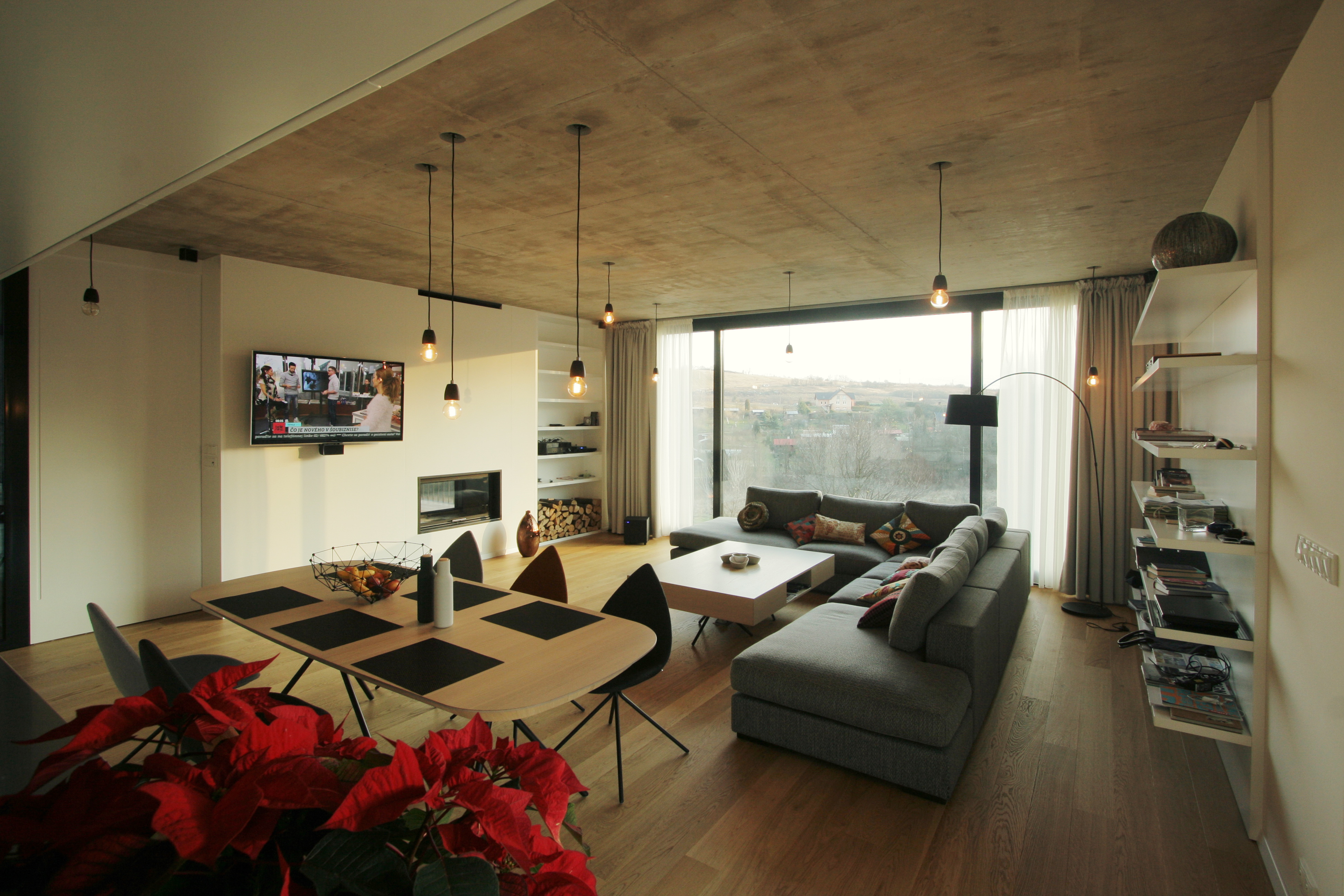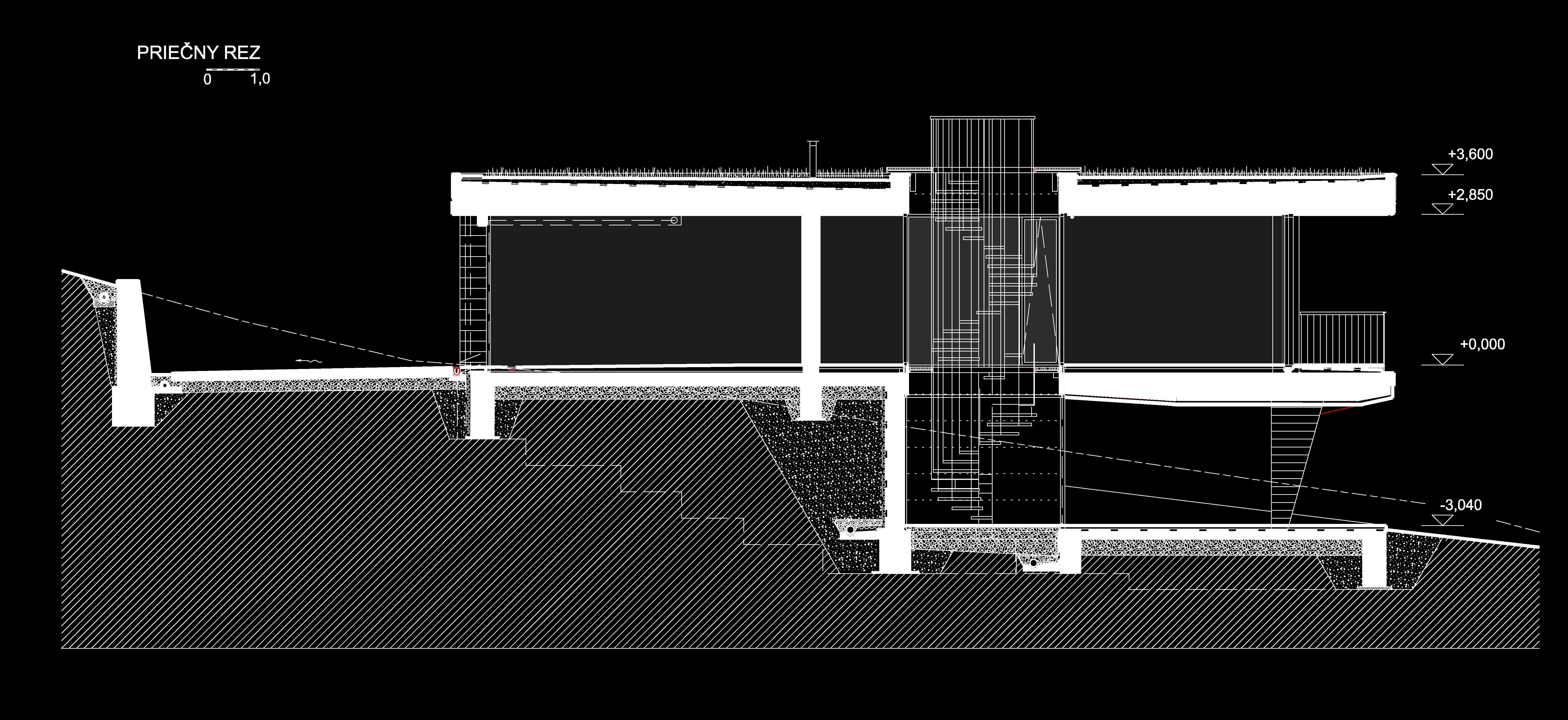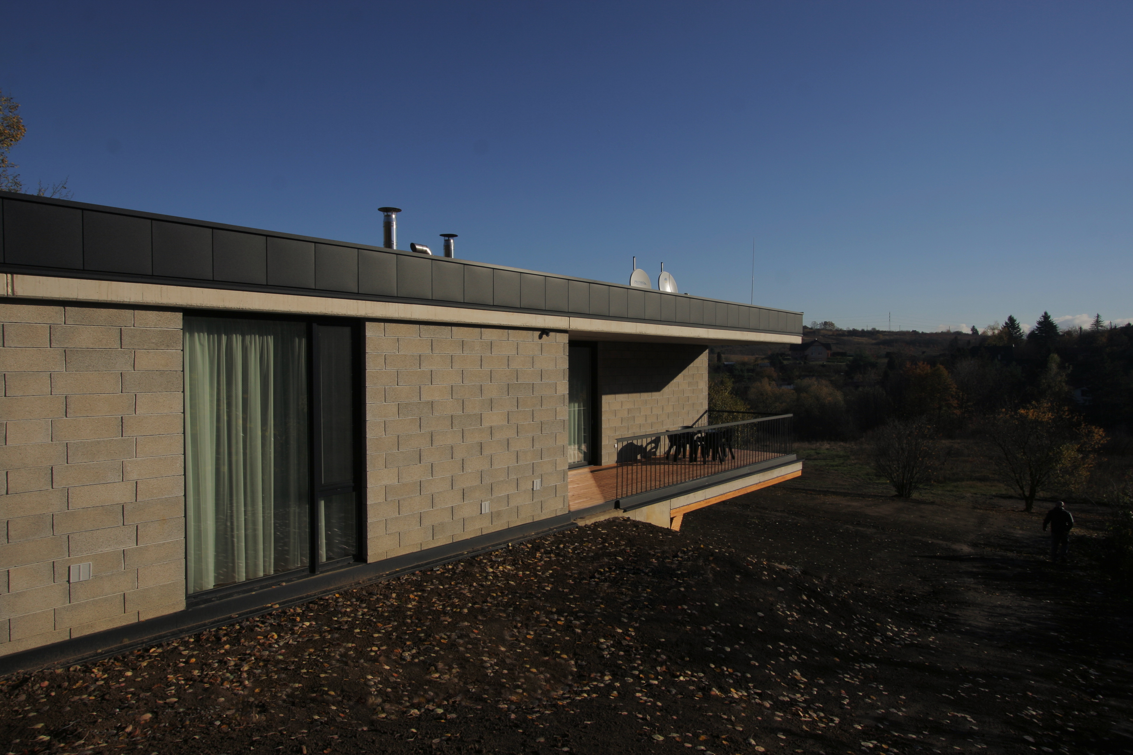 Hlavné obytné priestory domu sú vymedzené dvomi horizontálnimi železobetónovými doskami.