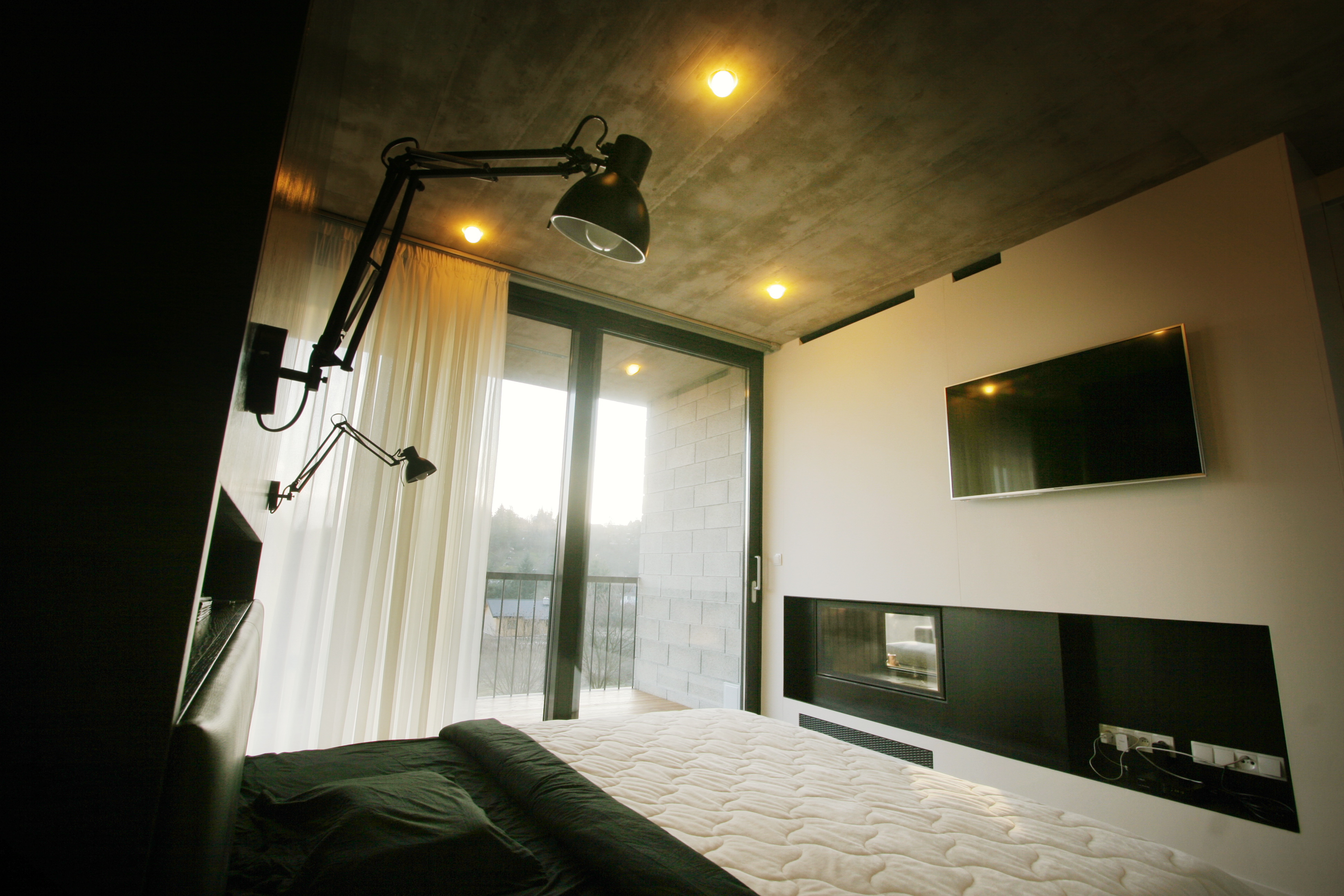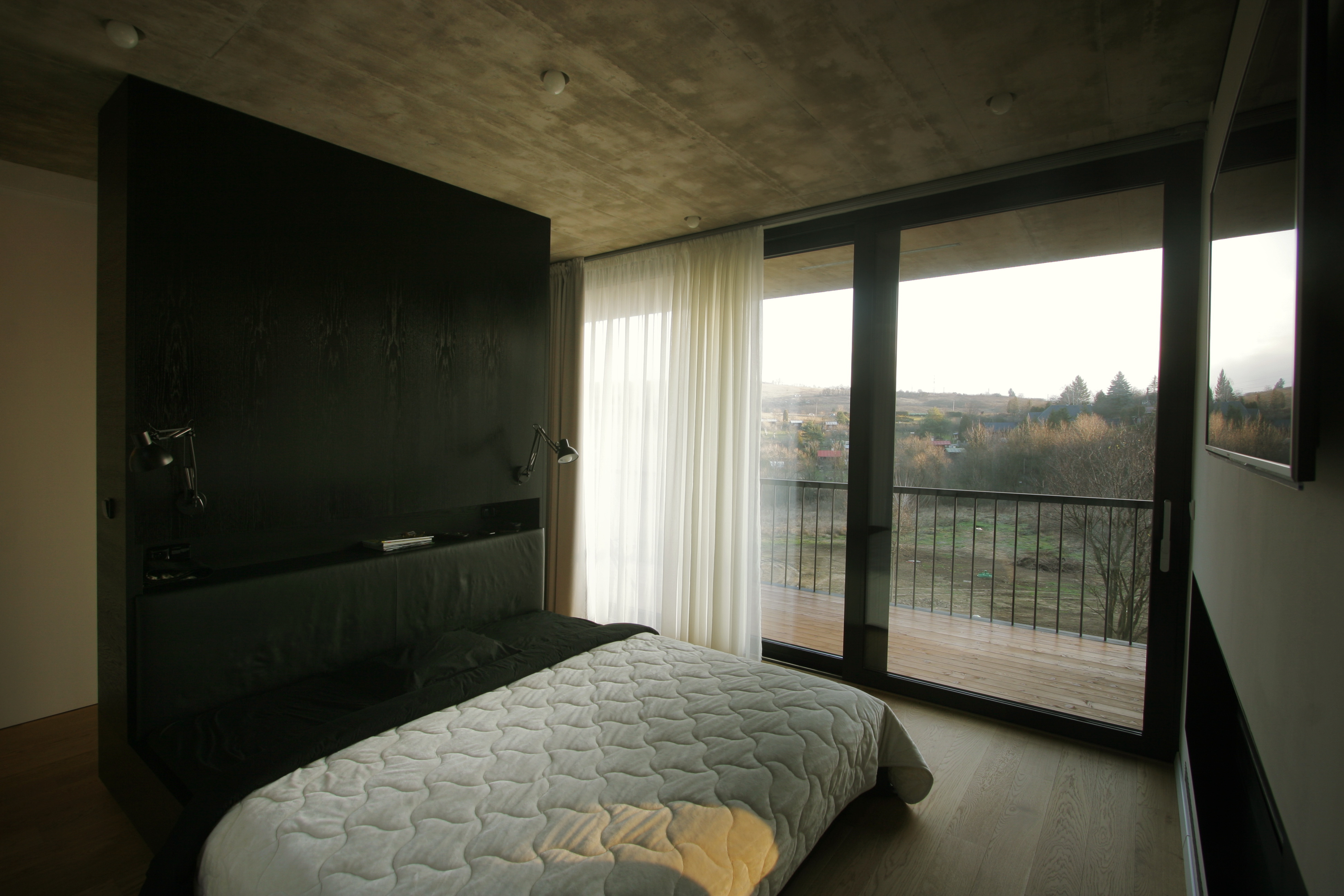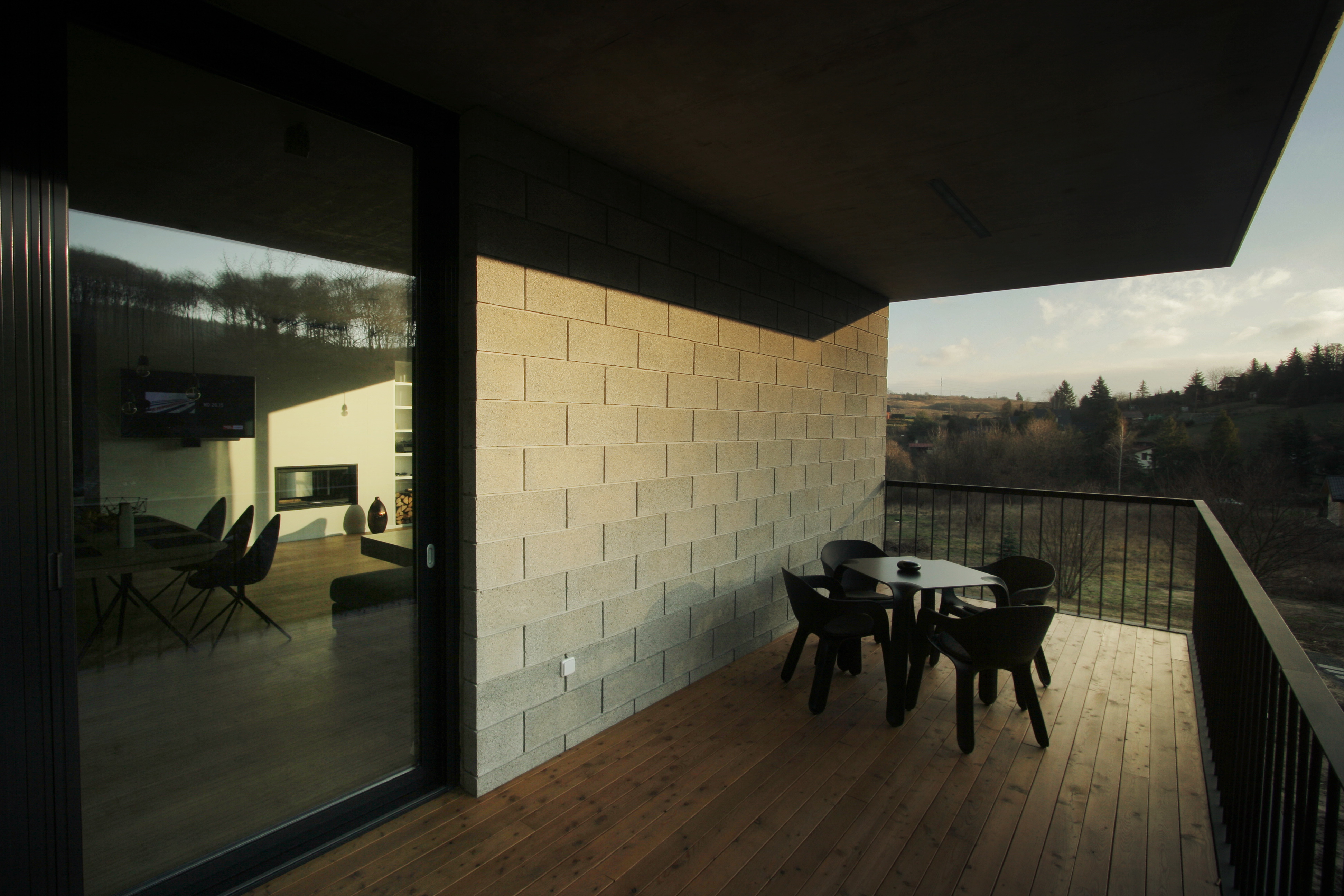 Hlavné obytné priestory domu sú vymedzené dvomi horizontálnimi železobetónovými doskami.