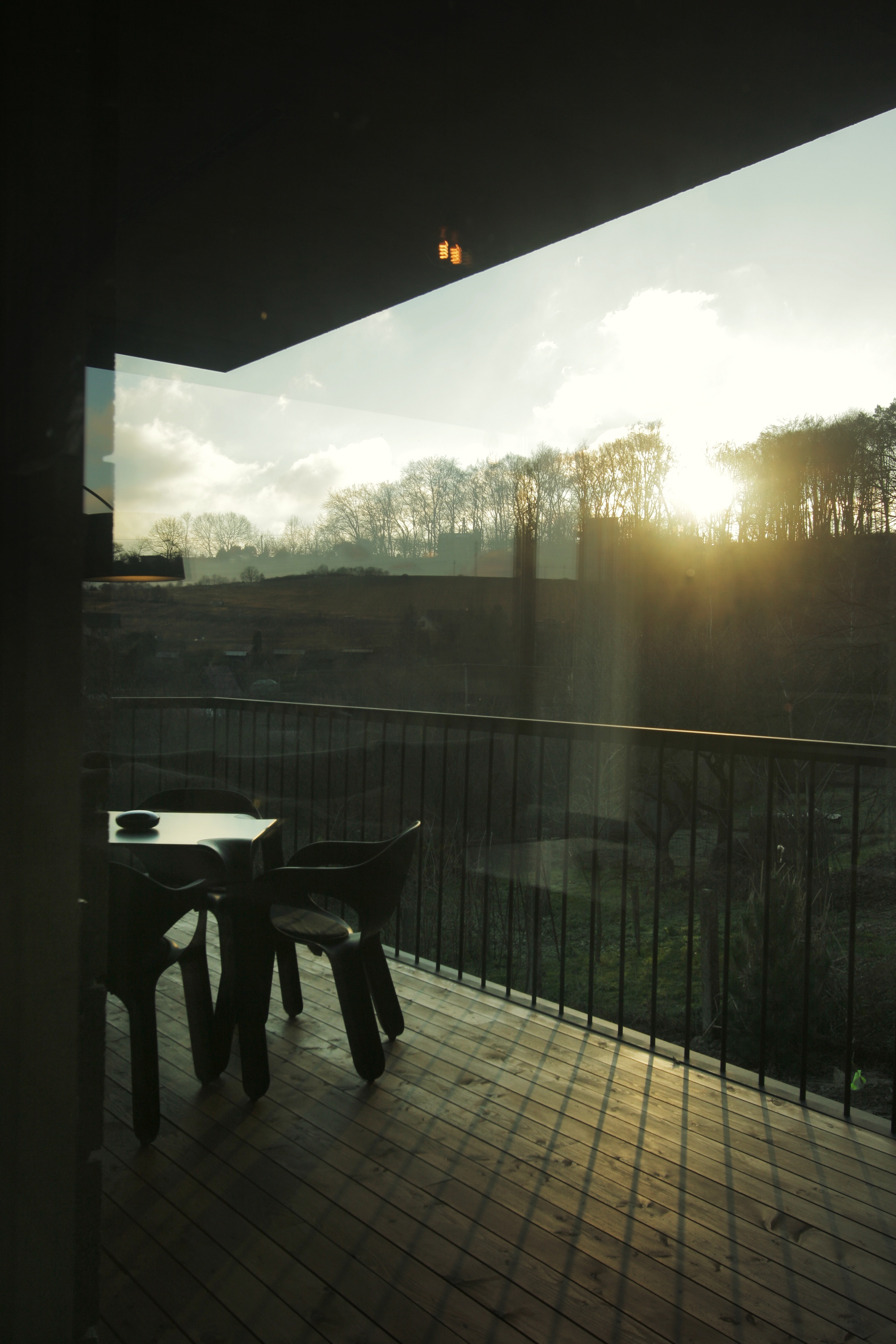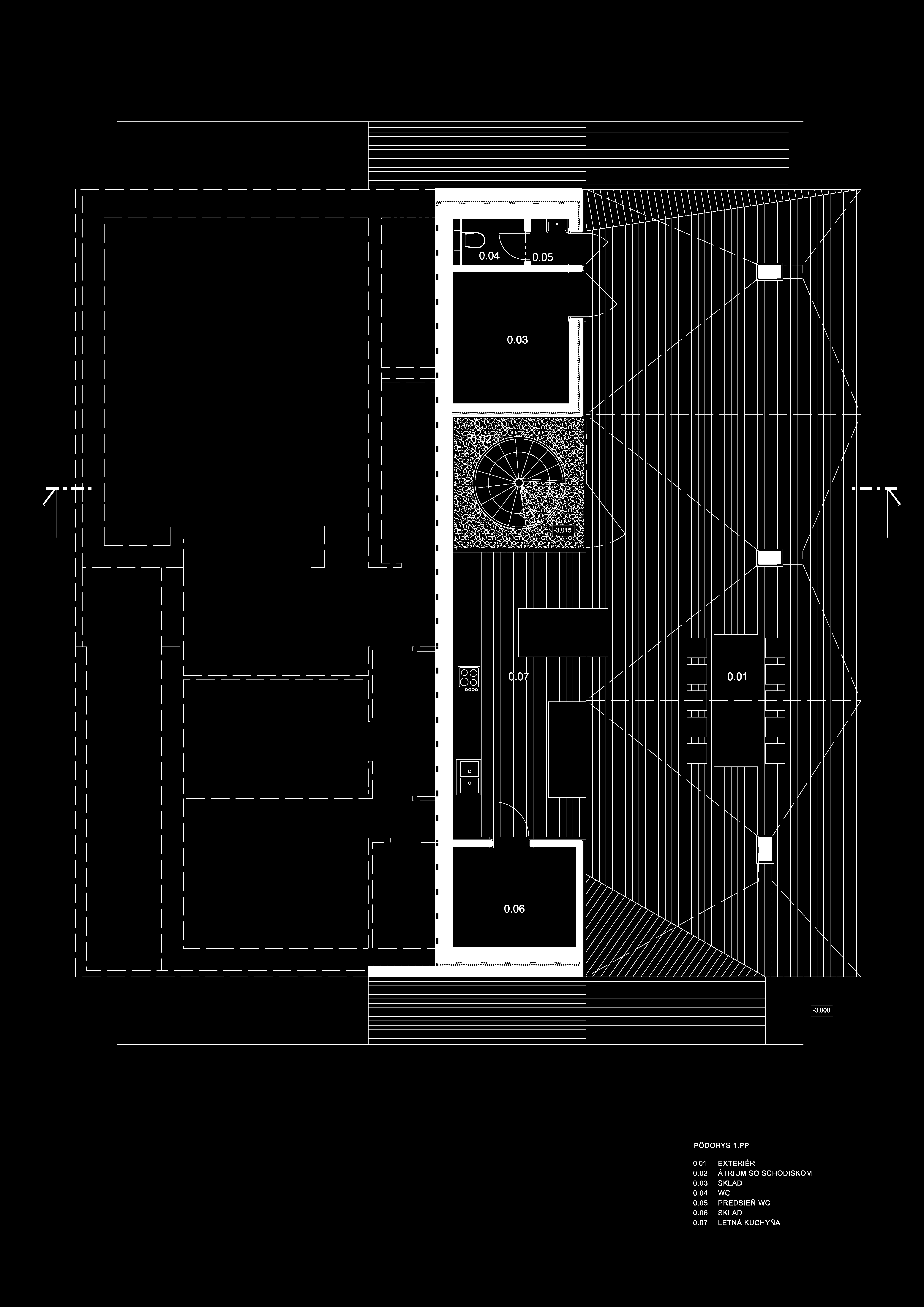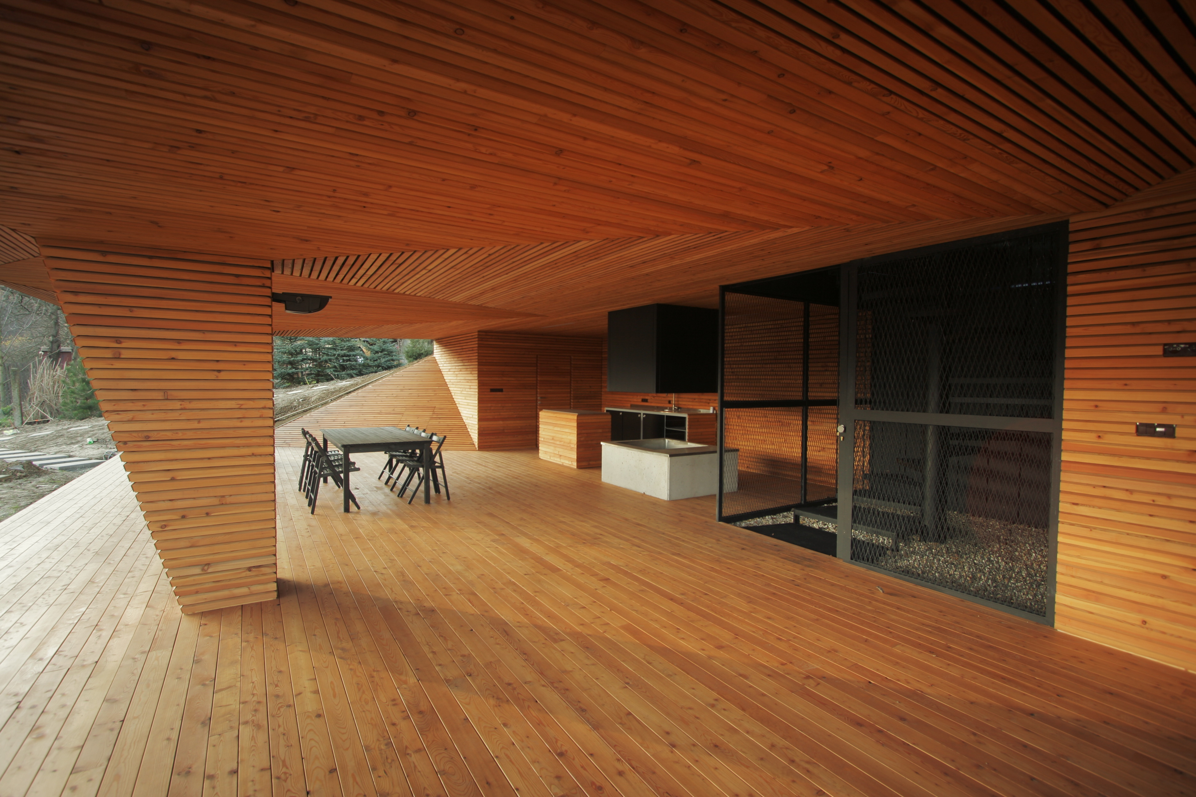 Spodná úroveň obsahuje samostatnú exteriérovú pobytovú plochu s väzbou na záhradu. Táto časť domu plní funkciu letnej kuchyne s otvoreným ohniskom exteriérového krbu. Na priestor terasy nadväzuje sklad a hygienycké zázemie.