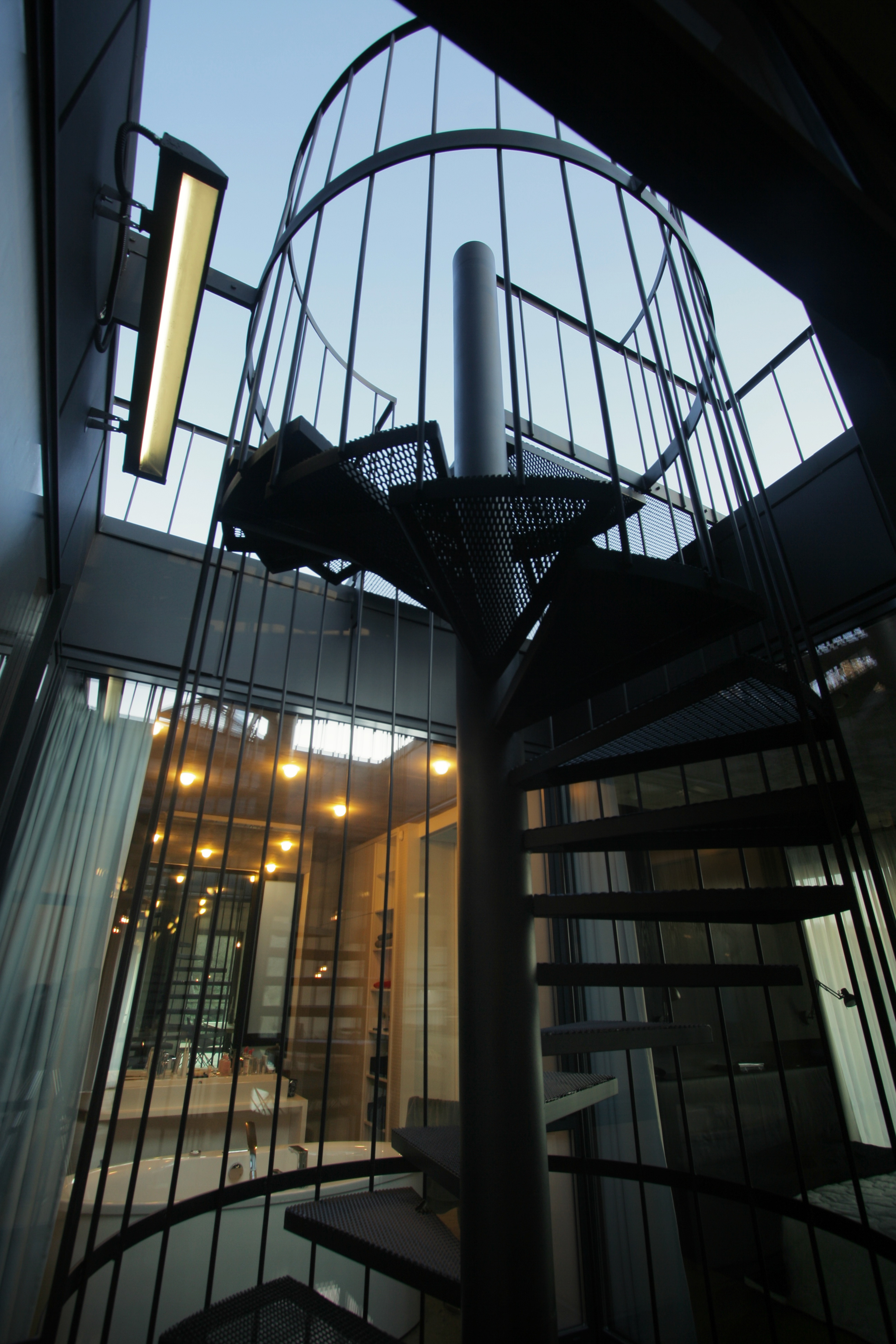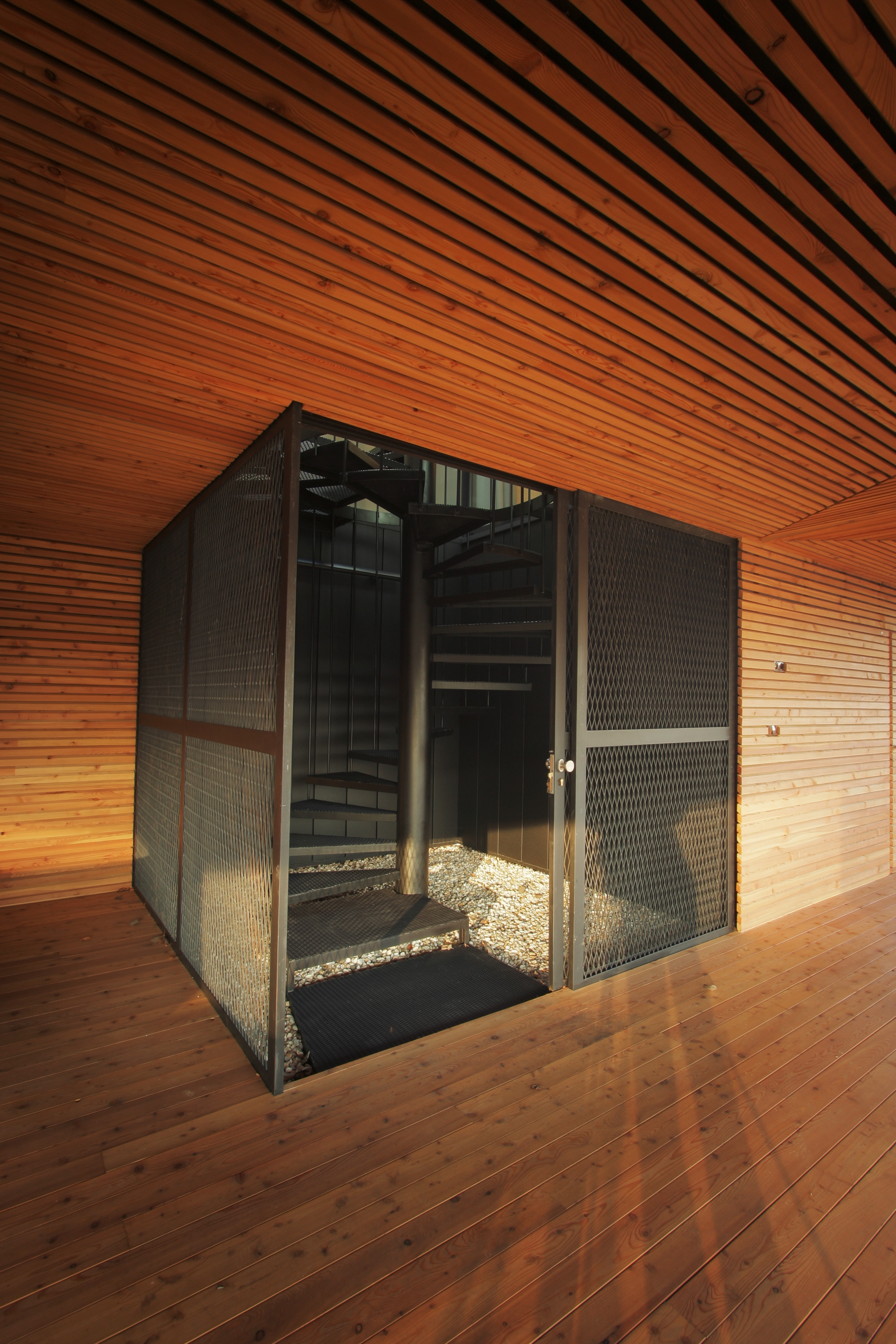 Toto schodisko tvorí aj vonkajšiu vertikálnu komunikáciu a spája jednotlivé podlažia. Je možné po ňom vystúpiť až na pochôdznu zelenú strechu domu, ale aj zostúpiť na veľkú krytú terasu prepojenú so záhradou na východnej časti pozemku.