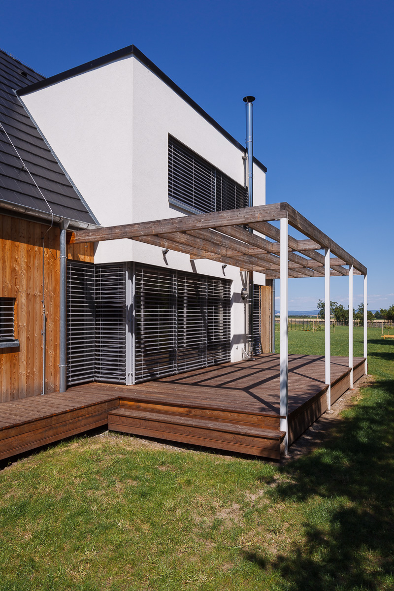 Tvaroslovie domu je inšpirované tradičnými chalupami v regióne. Základným archetypálnym tvarom so sedlovou strechou prestupuje hranol, ktorý v južnej časti rozširuje spoločenskú časť domu. Priestory na prízemí sú zväčšené a podkrovie o vikier. Na opačnej, severnej strane domu vytvára priestor pre schodisko a kúpeľne. Materiálové riešenie základných hmôt a plôch v exteriéri stavby - prírodný drevený obklad, biela omietka, tmavá antracitová farba strechy (betónové škridle Bramac Tegalit) a svetlosivé okenné rámy - prepožičali stavbe civilný charakter bez toho, aby jej ubrali na modernom architektonickom poňatí.