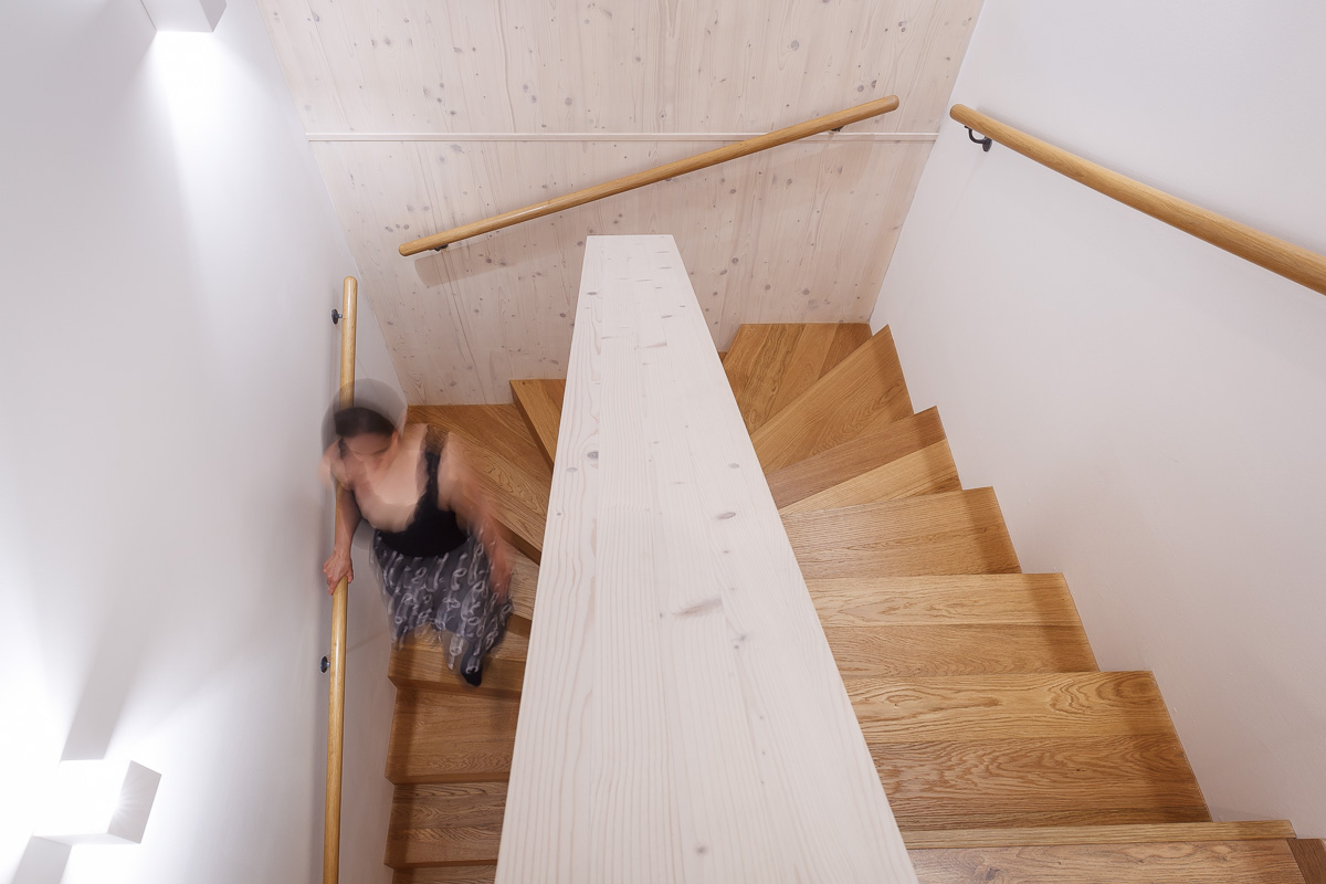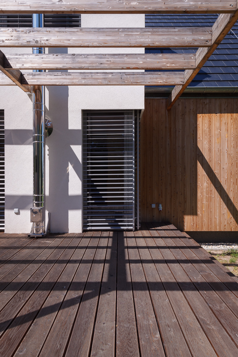 Dvojpodlažnú drevostavbu situovali architekti v prednej tretine dlhej rovinatej parcely. Pri vstupe/vjazde na pozemok je umiestnené kryté parkovacie státie so skladom na náradie, zastrešené plechovou krytinou. Obdĺžnikový pôdorys domu reaguje na tvar pozemku, pozdĺžna os domu je orientovaná v smere západ-východ, do domu sa vstupuje zo západnej strany. Novostavba je domovom mladej trojčlennej rodiny a psieho miláčika. Priestory domu sú koncipované tak, aby vyhovovali aj prípadnému budúcemu rozšíreniu počtu členov domácnosti.