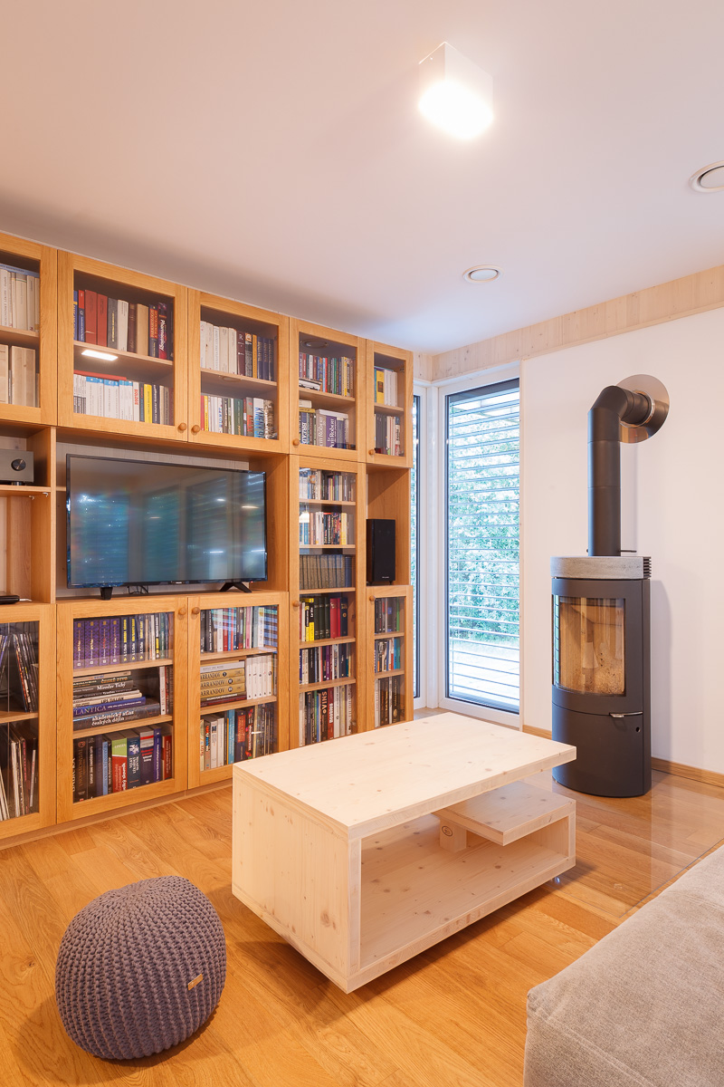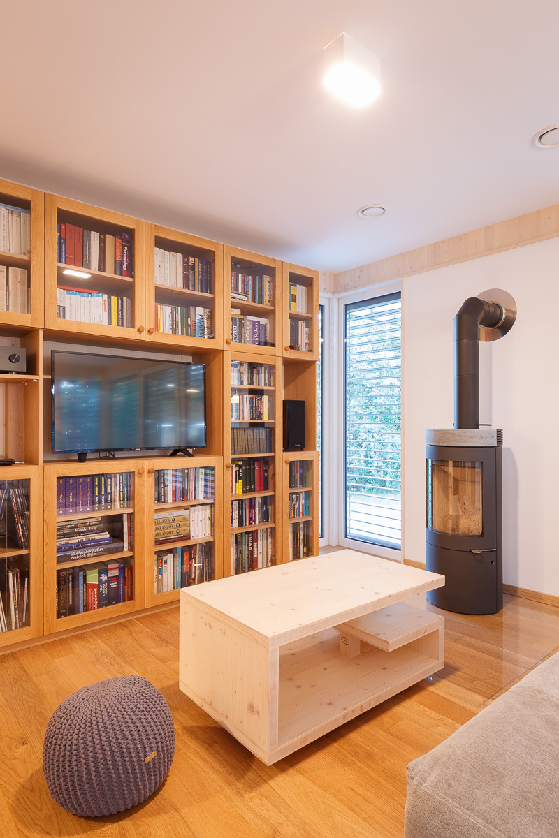 Dispozičné riešenie stavia na racionálnom usporiadaní miestností s ohľadom na funkciu a orientáciu k svetovým stranám. Hygienické zázemie, šatník a schodisko umiestnili architekti pozdĺž severnej strany domu. Smerom na juh rozšírili obytný priestor na prízemí o komfortnú pobytovú terasu tienenú pergolou. Dennú zónu na prízemí tvoria vzájomne prepojené priestory kuchyne, jedálne a odpočinkovej časti s veľkou knižnicou. Spálňa rodičov na prízemí má orientáciu na východ, v podkroví (2. NP) sú umiestnené dve detské izby (spálňa a herňa), pracovňa a kúpeľňa s WC.