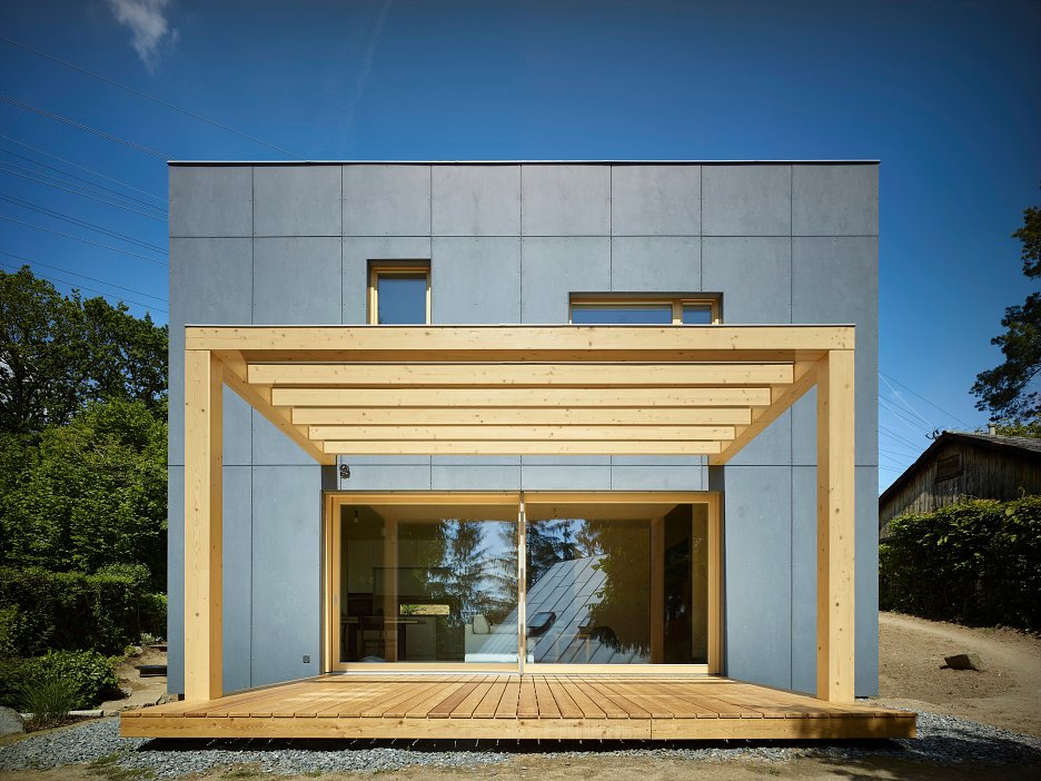 Chatová oblast u slapské přehrady se pomalu proměňuje v rezidenční osadu. Rodinný dům stojí na místě rekreačního objektu, jehož uspořádání ani technické vlastnosti již nevyhovovaly investorovým nárokům, a zachovává pouze jeho půdorysnou stopu. Dispozici nevelké stavby předurčil jižní svah s terénním zlomem. Vstup se nachází v ložnicovém patře a s pozemkem jej spojuje lávka. Ze zádveří sestupuje schodiště do obytného prostoru s kuchyní, který rozměrným prosklením a terasou s pergolou navazuje na jižní část zahrady. Konstrukci domu tvoří masivní dřevěné panely s tepelnou izolací minerální vatou a provětrávanou mezerou za velkoformátovým obkladem z cementovláknitých desek. S antracitovým odstínem fasády kontrastuje světlé dřevo okenních rámů a pergoly, stejně jako žlutý lak ocelové lávky. Výraz interiéru udávají především přiznané smrkové panely.