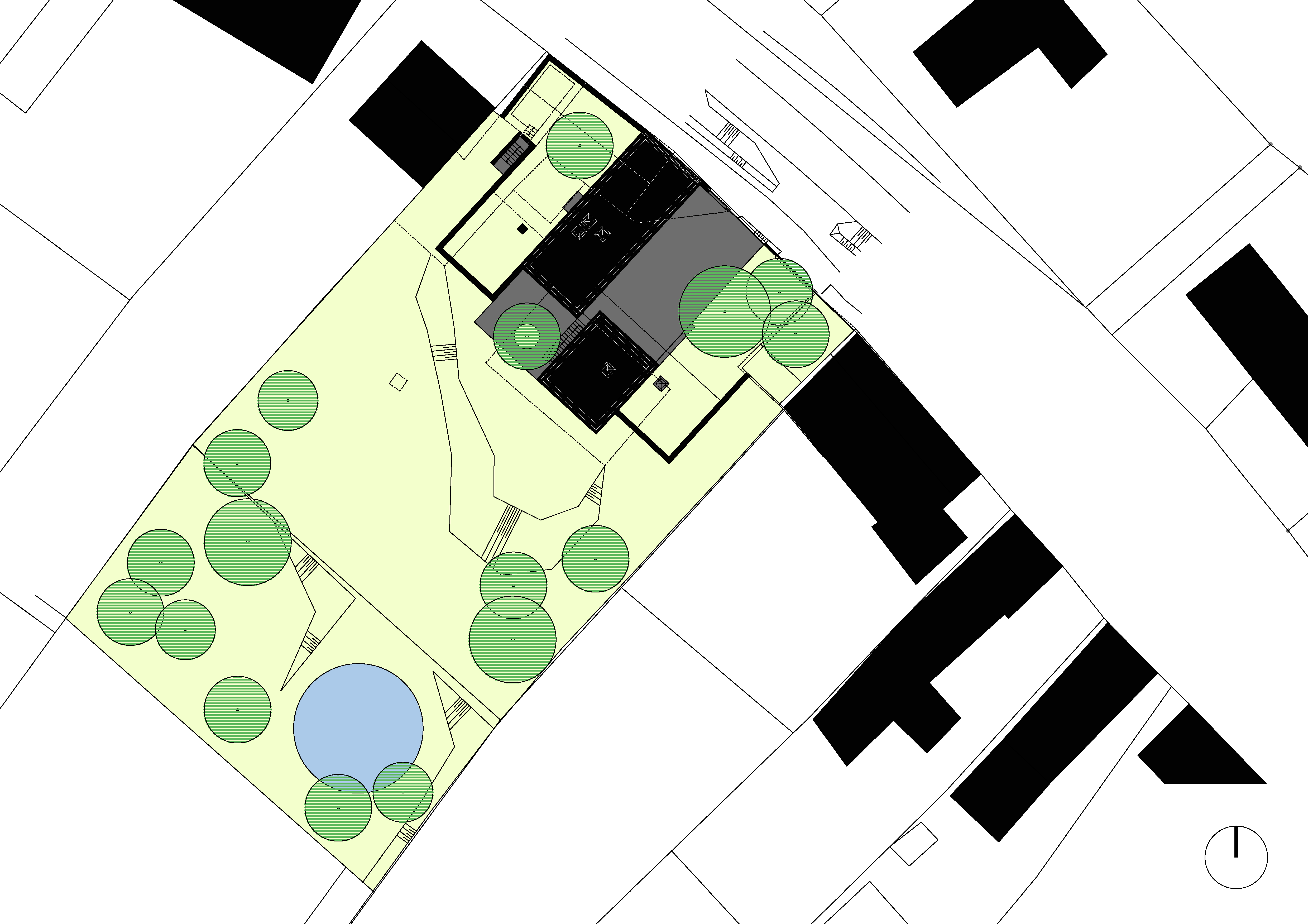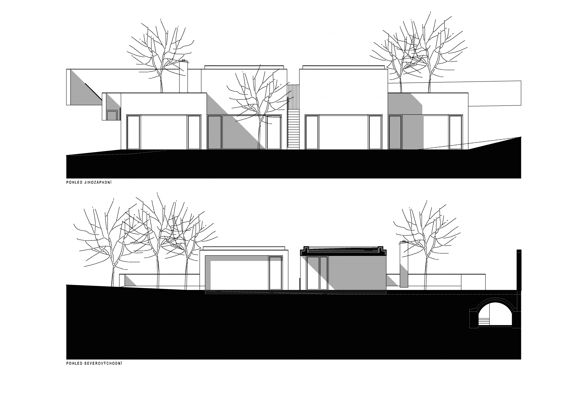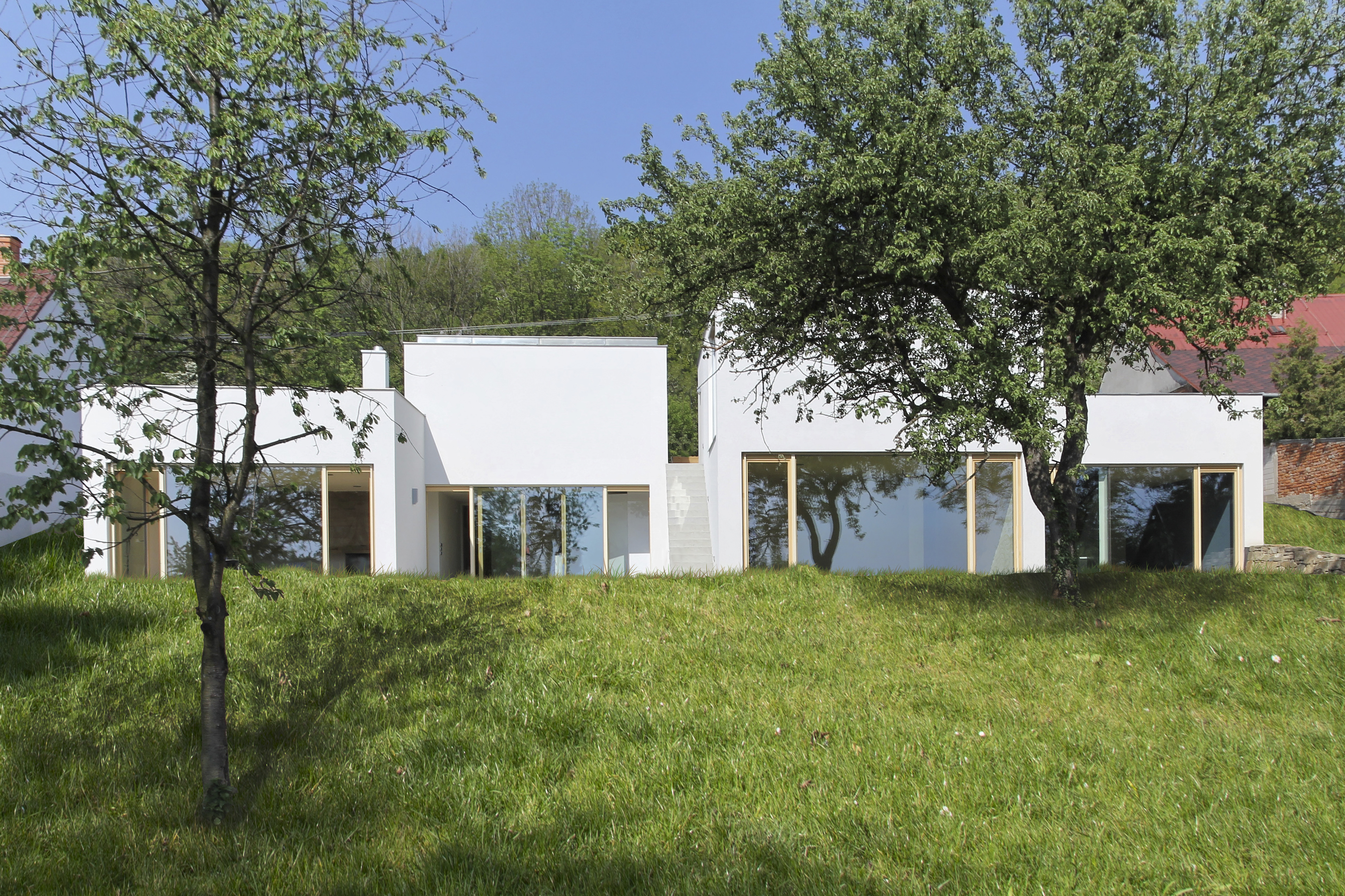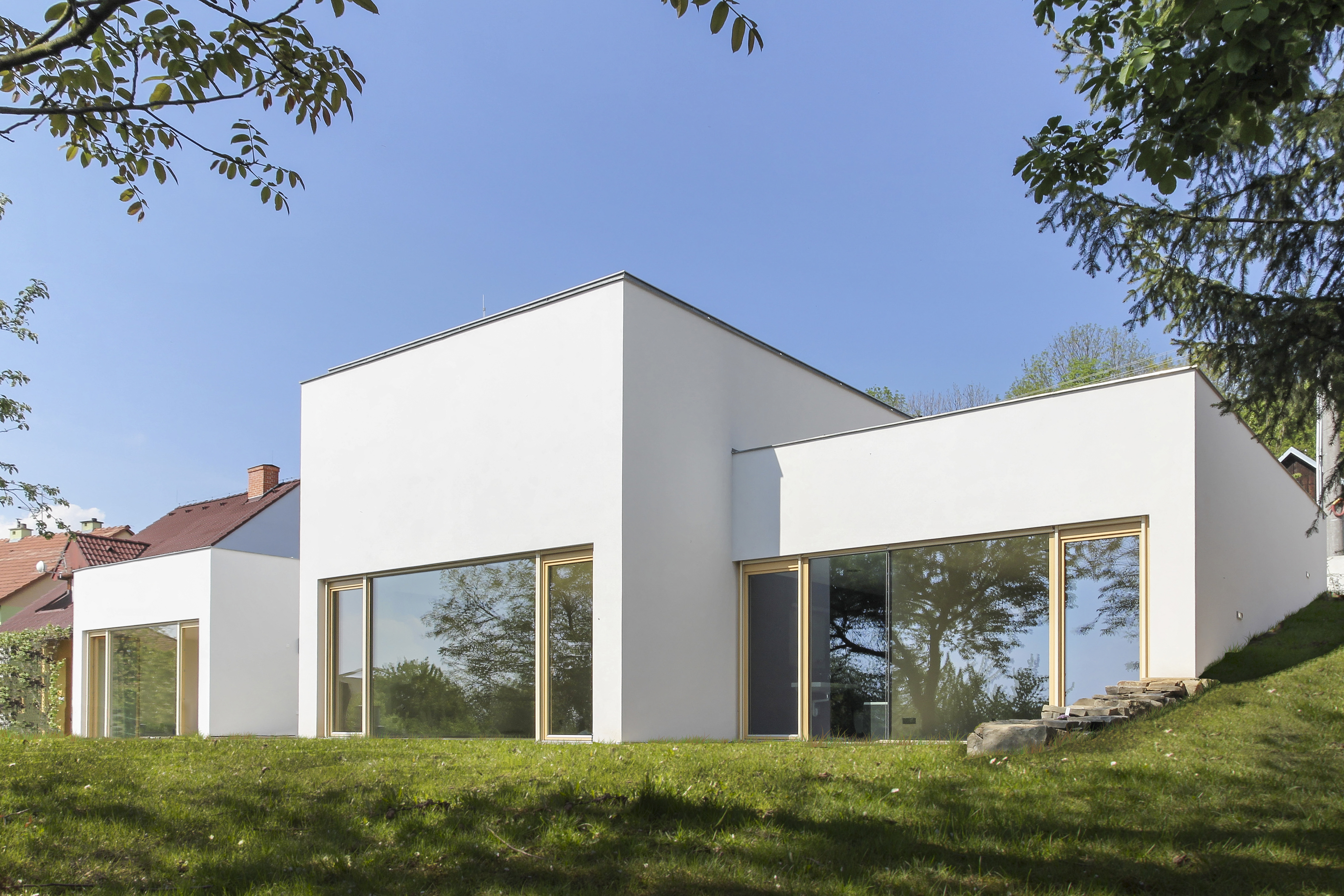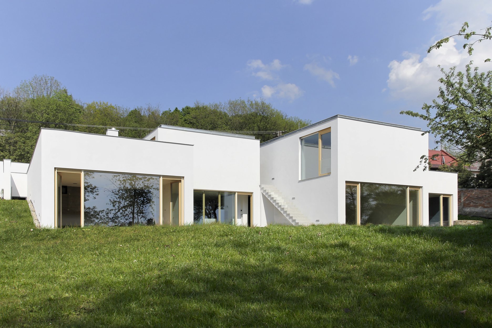 Objekt sa prispôsobuje svahovitému terénu. Pri pohľade z ulice relatívne nenápadná jednopodlažná hmota domu sa rozvíja a “rastie” smerom do záhrady. Štyri samostatné obytné bloky sú prepojené s privátnym dvorom prostredníctvom rozmerných presklených stien.