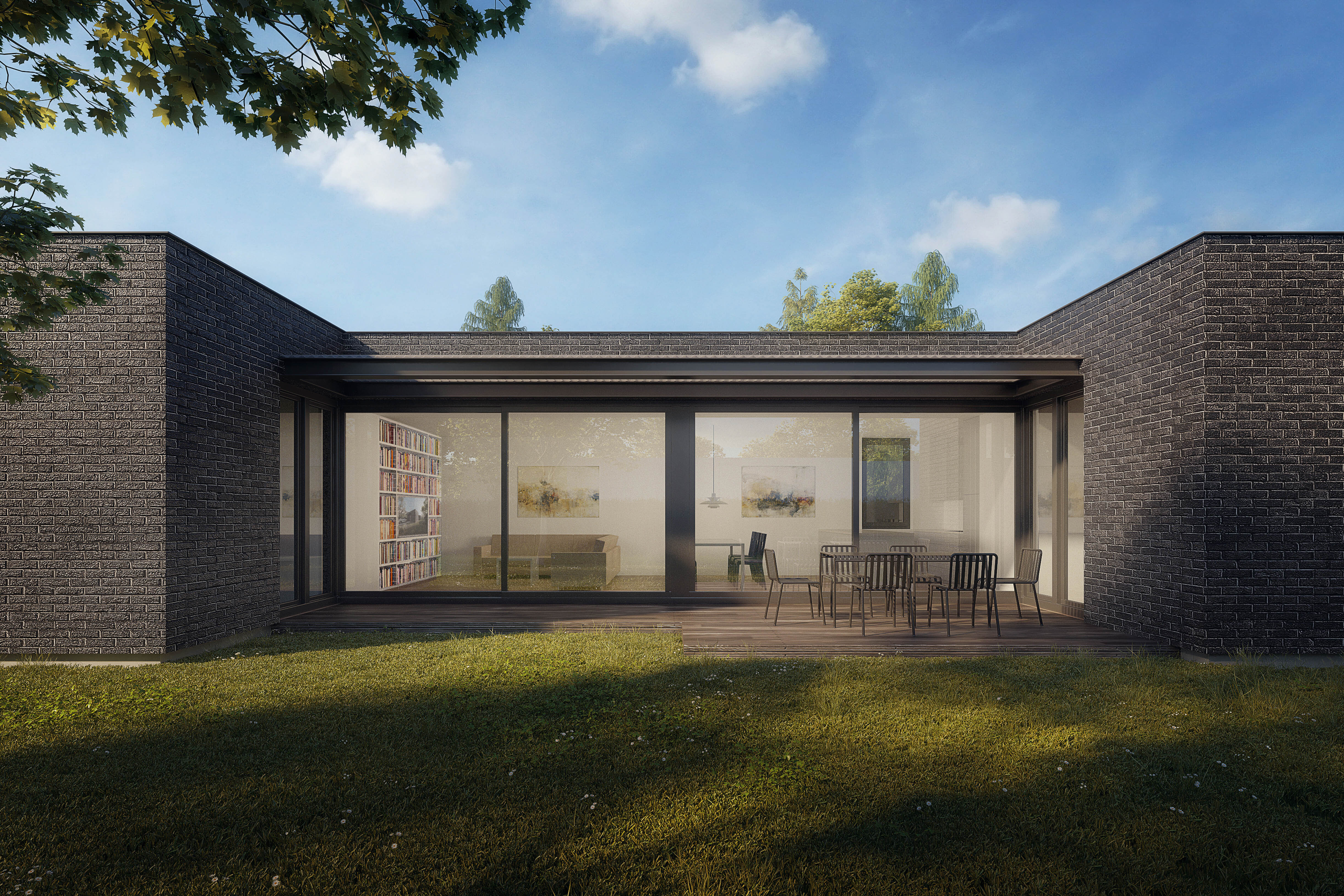 Na západní straně dispozici uzavírá křídlo se třemi ložnicemi a koupelnou. Fasáda nese tmavý cihelný obklad, střechu kryje extenzivní vegetace. Zbytky cihel, které po páscích běžně likvidují, jsme použili na vydláždění terasy a garážového stání. Přístřešek pro automobil a zastřešení terasy zajišťuje lehká konstrukce z ocelových profilů a sklolaminátu. Jednoduché černobílé pojetí interiéru ladí díky černým rámům hliníkových oken s exteriérem. Neutrální odstíny jemně doplňuje solitérní nábytek ze světlé dýhy.
