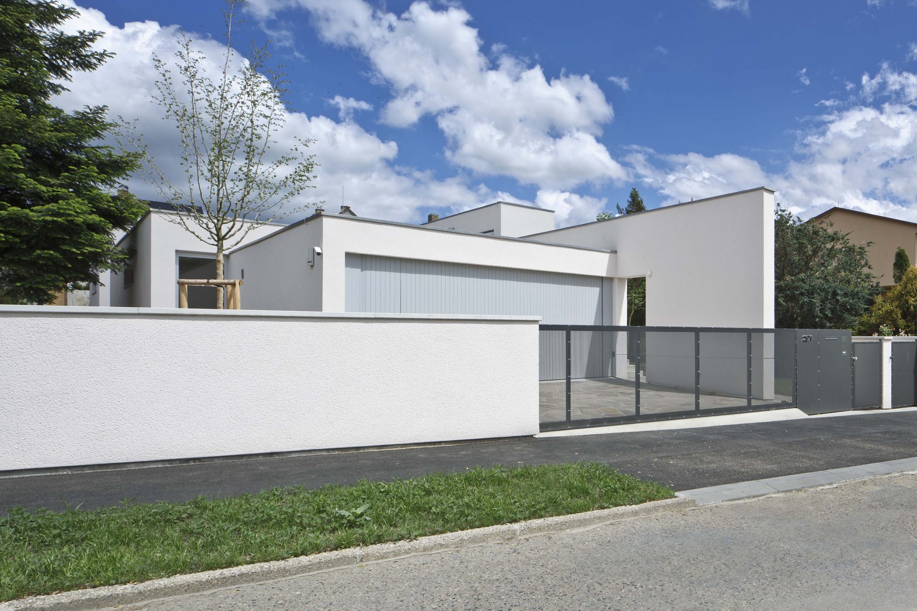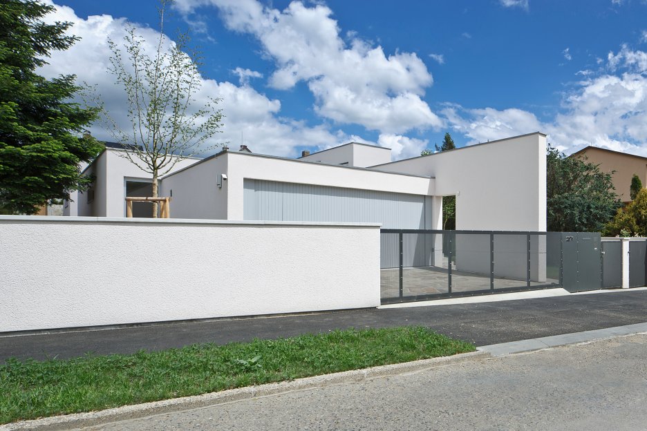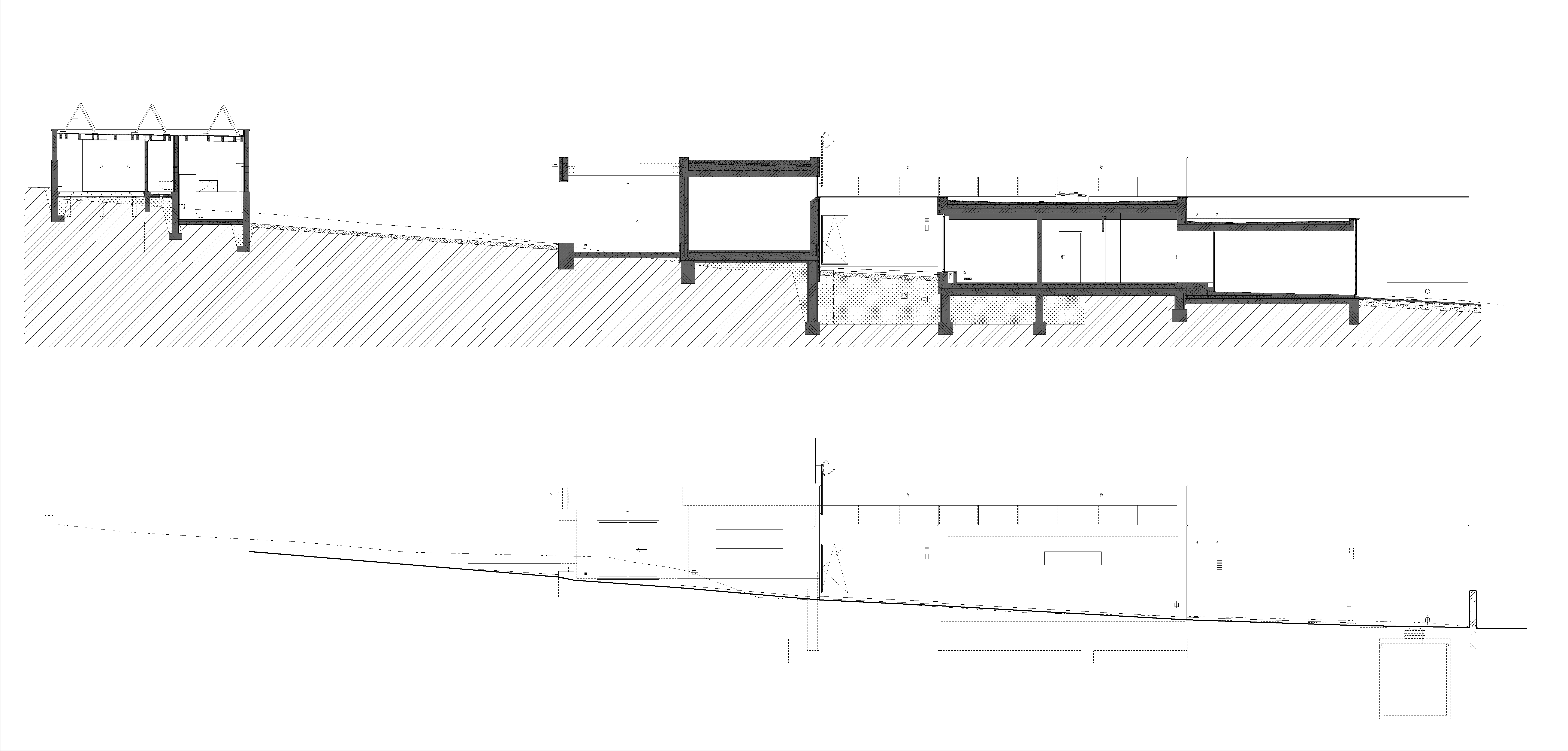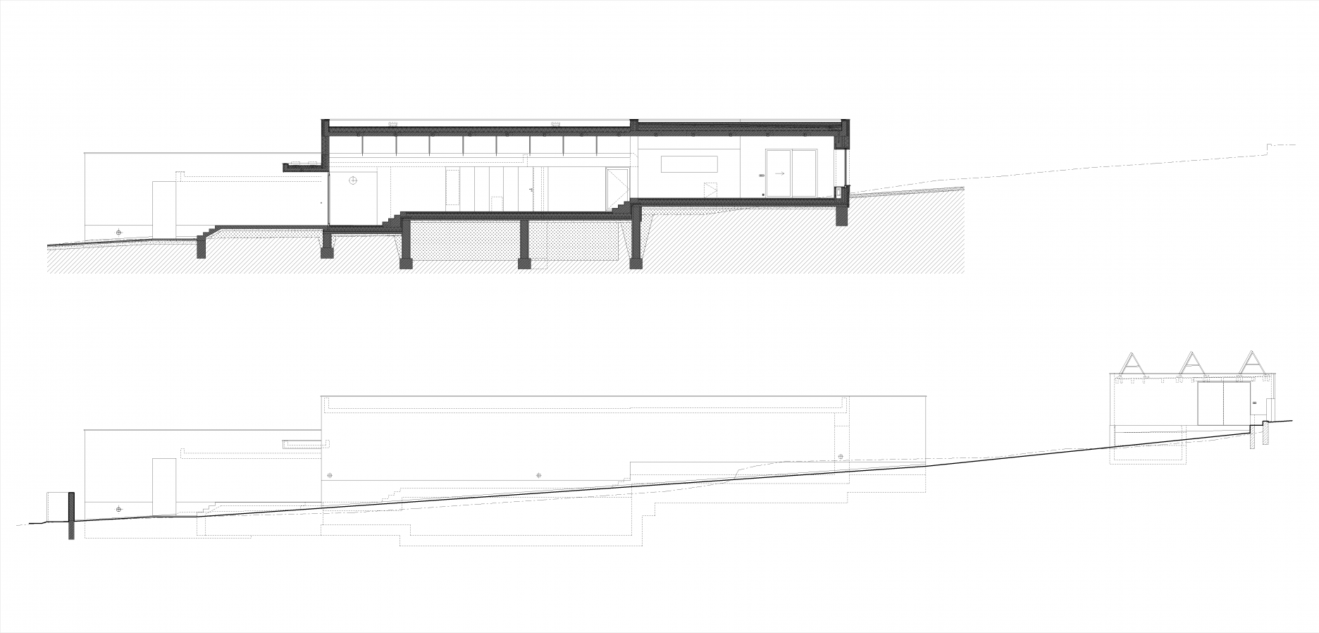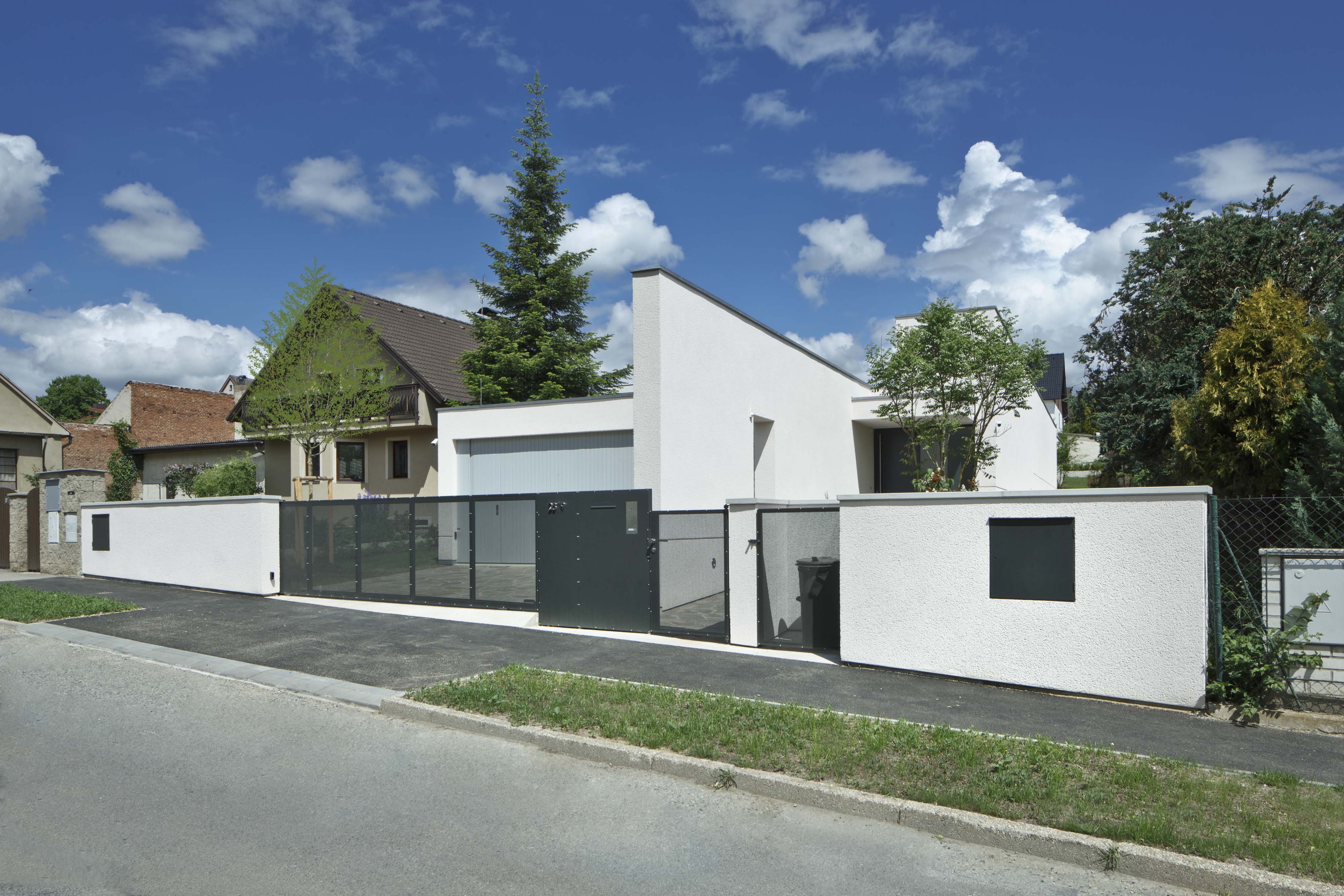 Návrh využíva terén zvažujúci sa od príjazdovej cesty. Objekt je výškovo členený na tri úrovne: garáž so zázemím, kľudovú časť so spálňou a obytnú časť s priestrannou terasou. Jednotlivé výškové úrovne kopírujú svah, celý priestor prepája komunikácia vedúca pozdĺž východnej fasády objektu. Veľkoryso koncipovaný priestor s bazilikálnym osvetlením lemuje stena z pohľadového betónu.
