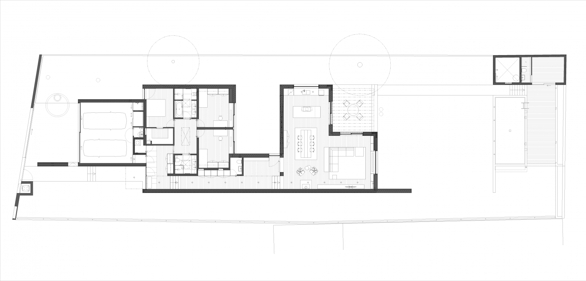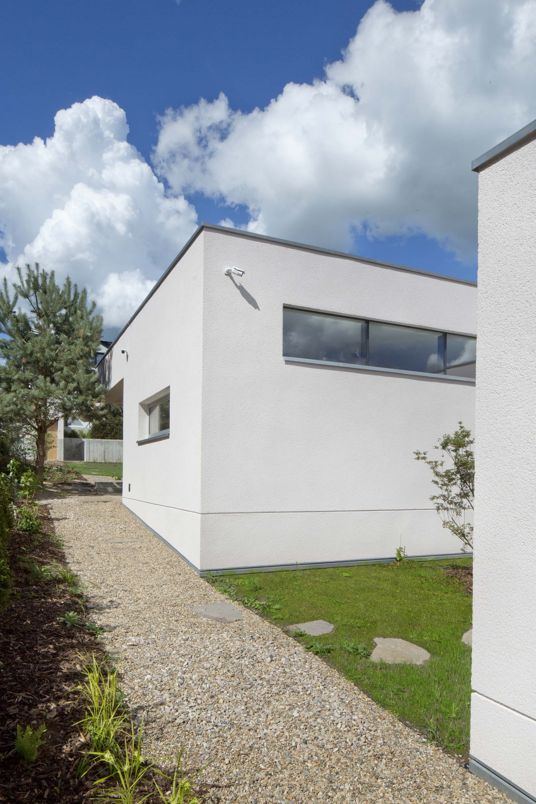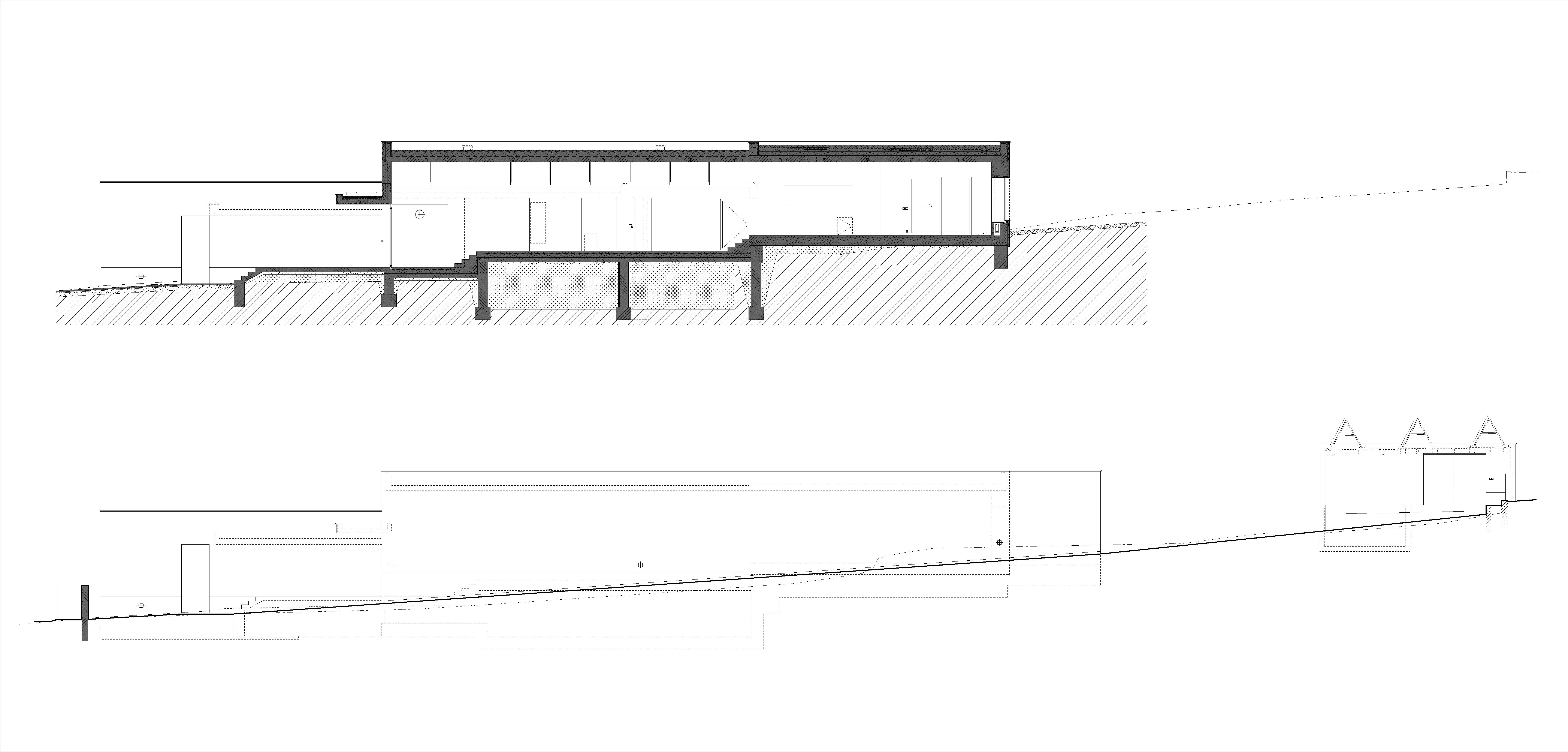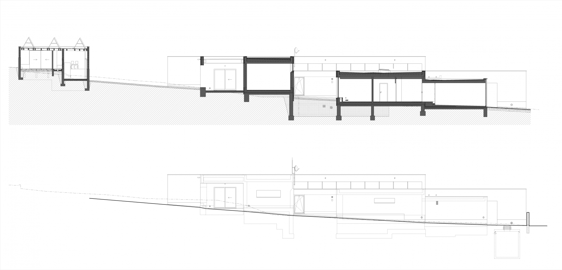 Návrh využíva terén zvažujúci sa od príjazdovej cesty. Objekt je výškovo členený na tri úrovne: garáž so zázemím, kľudovú časť so spálňou a obytnú časť s priestrannou terasou. Jednotlivé výškové úrovne kopírujú svah, celý priestor prepája komunikácia vedúca pozdĺž východnej fasády objektu. Veľkoryso koncipovaný priestor s bazilikálnym osvetlením lemuje stena z pohľadového betónu.