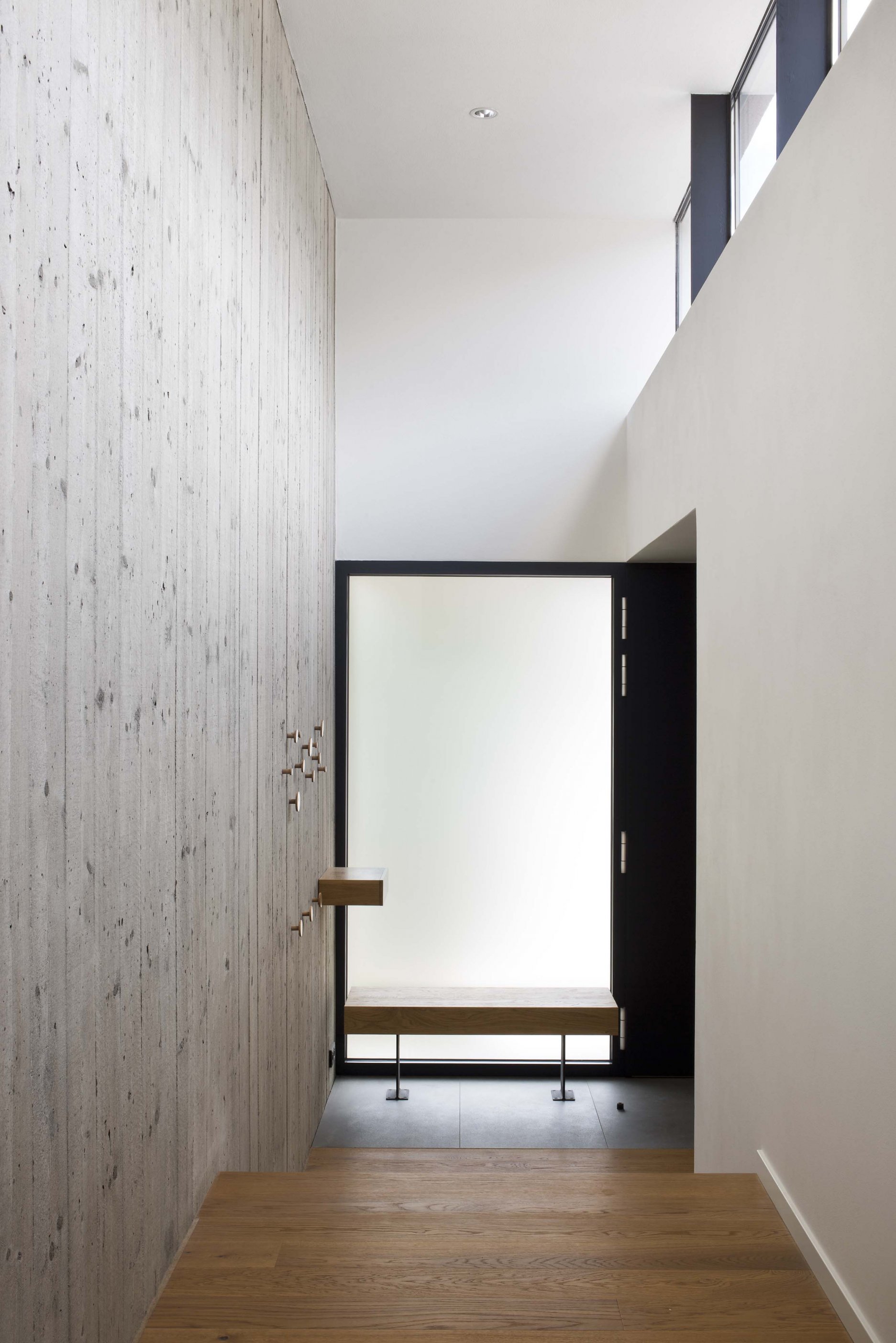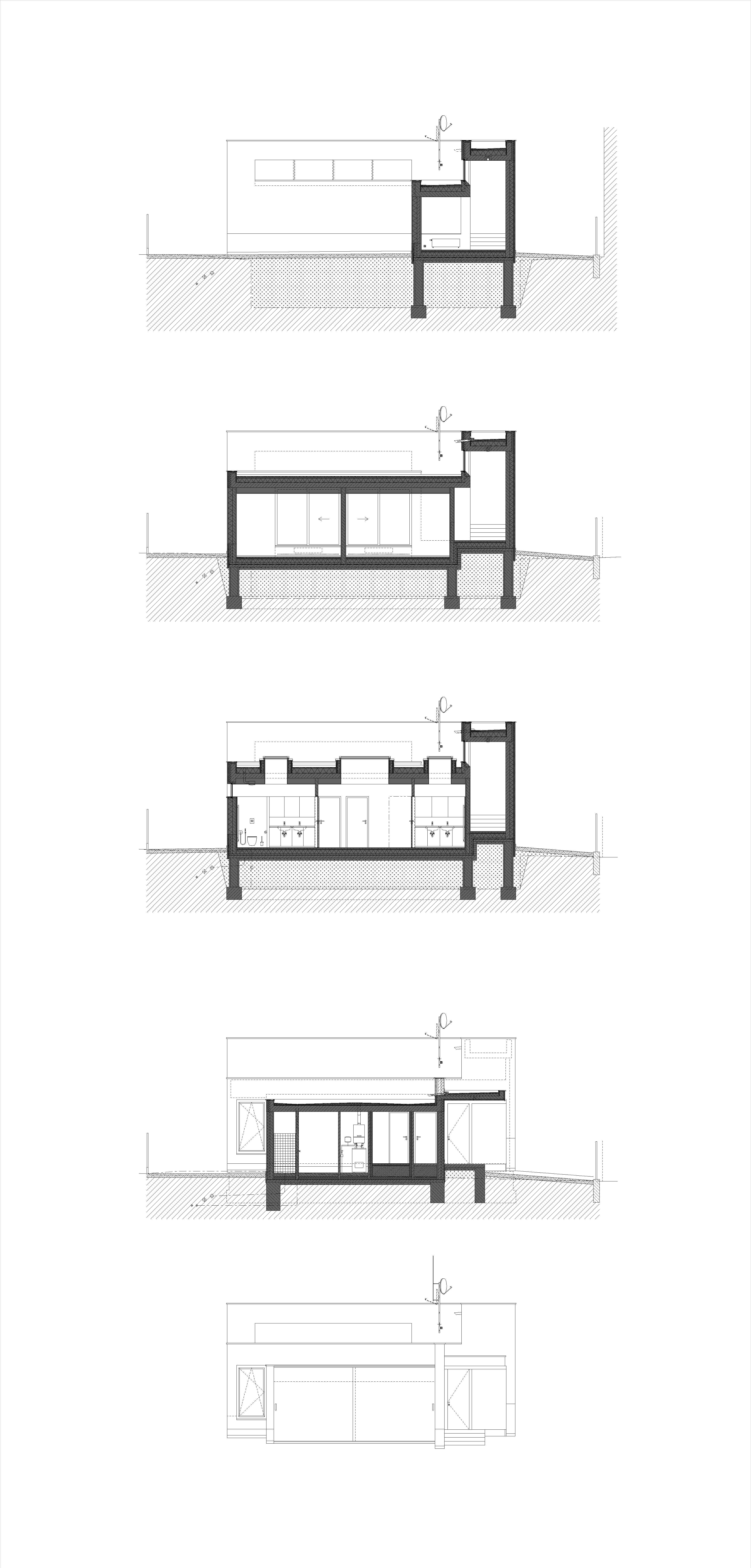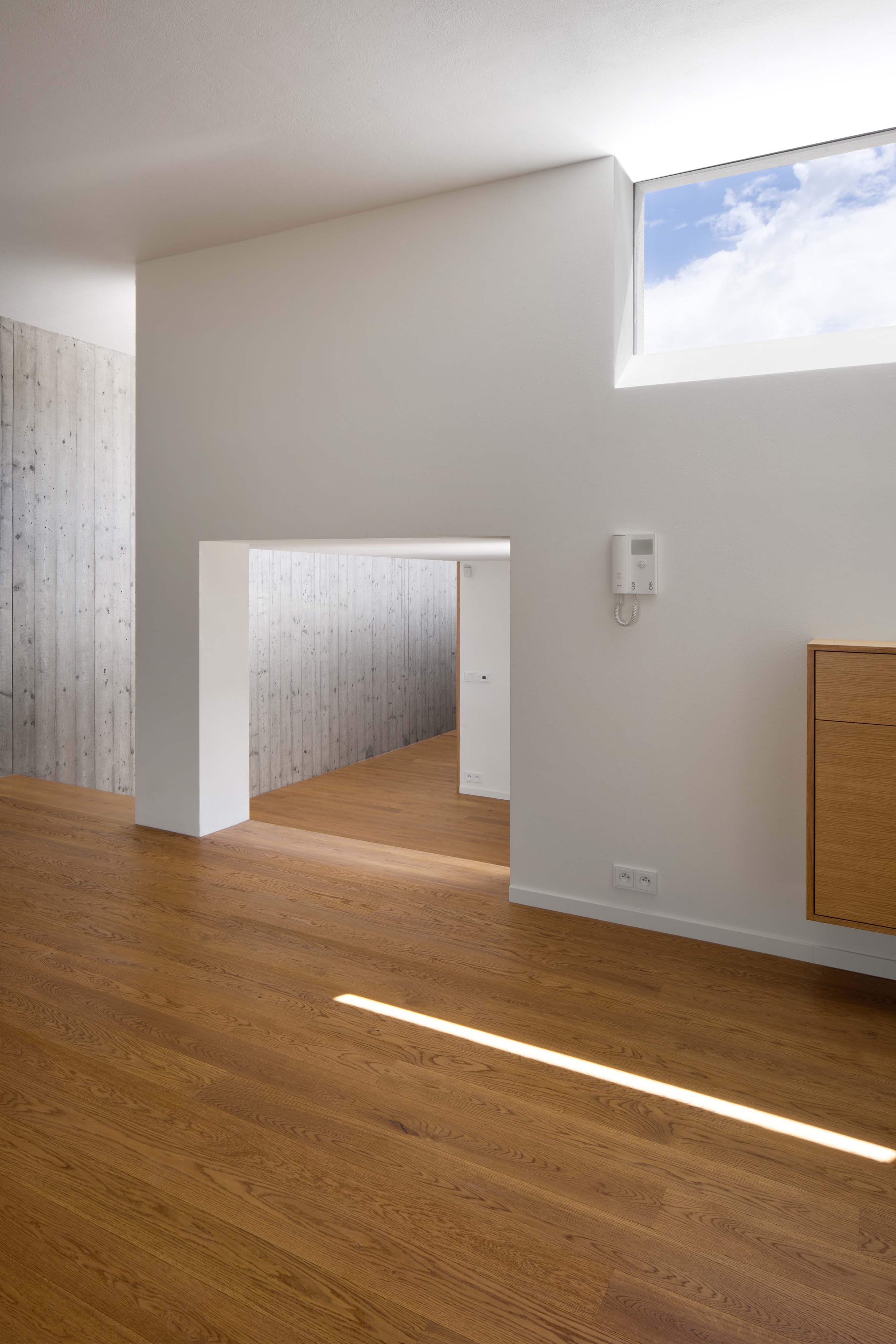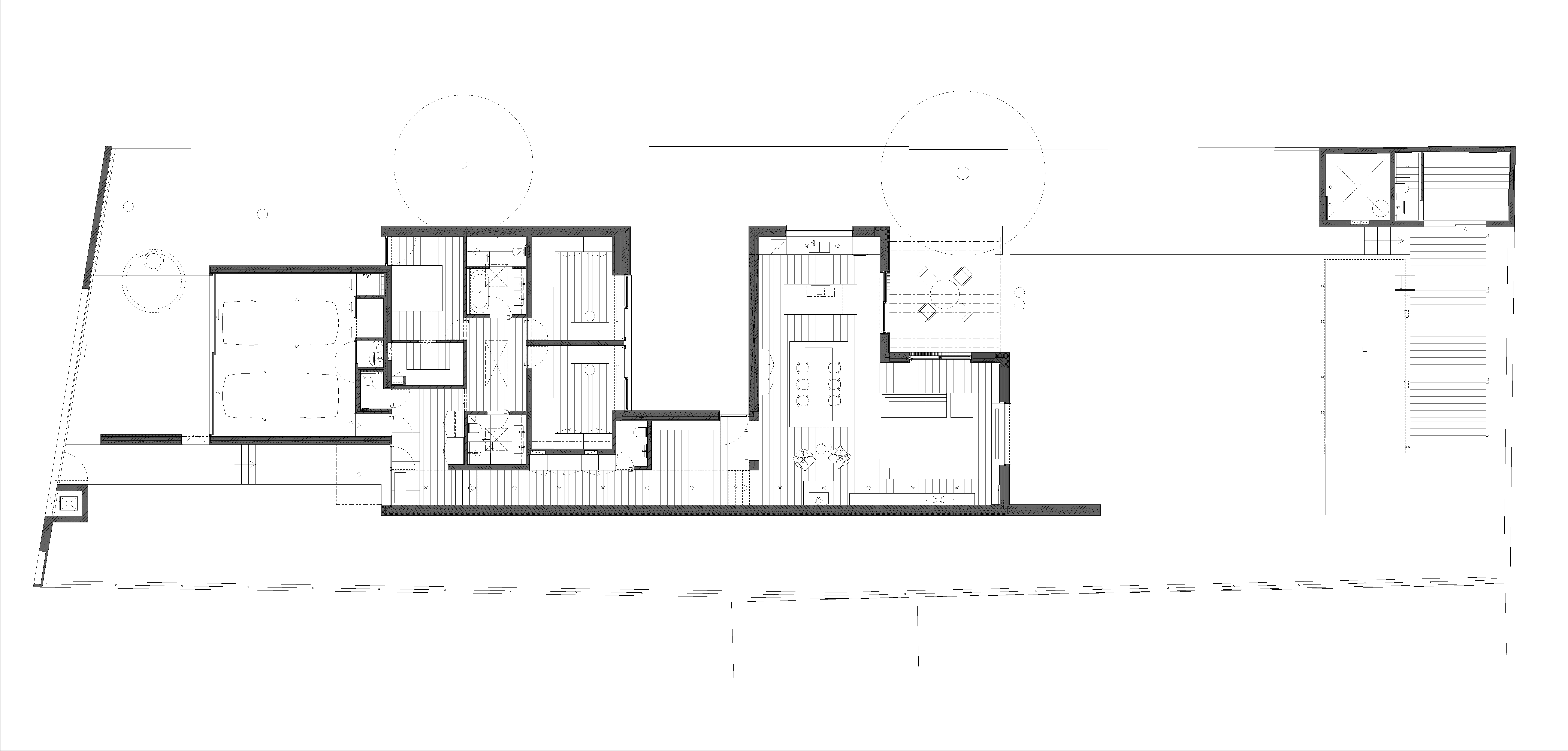Návrh využíva terén zvažujúci sa od príjazdovej cesty. Objekt je výškovo členený na tri úrovne: garáž so zázemím, kľudovú časť so spálňou a obytnú časť s priestrannou terasou. Jednotlivé výškové úrovne kopírujú svah, celý priestor prepája komunikácia vedúca pozdĺž východnej fasády objektu. Veľkoryso koncipovaný priestor s bazilikálnym osvetlením lemuje stena z pohľadového betónu.