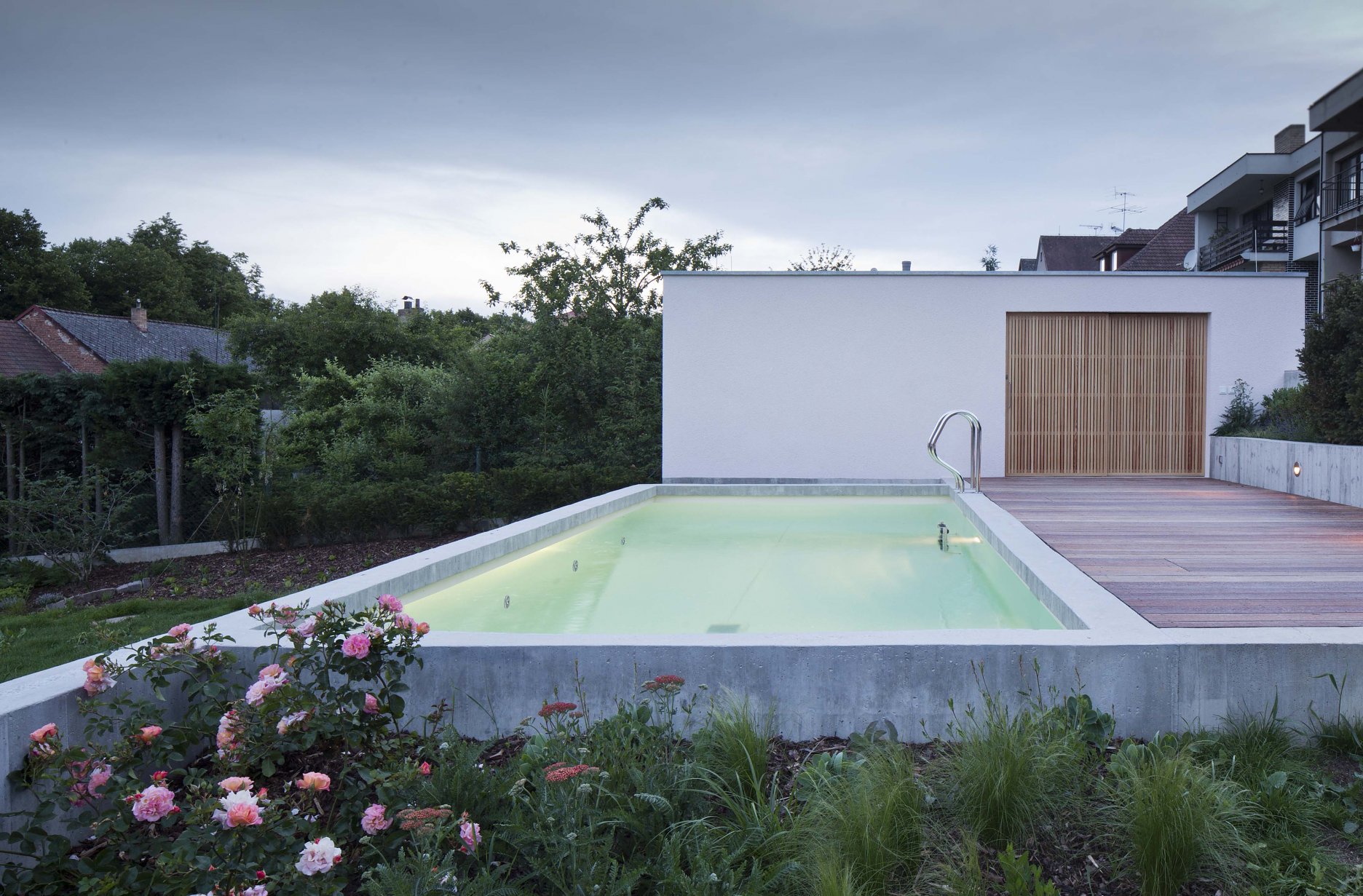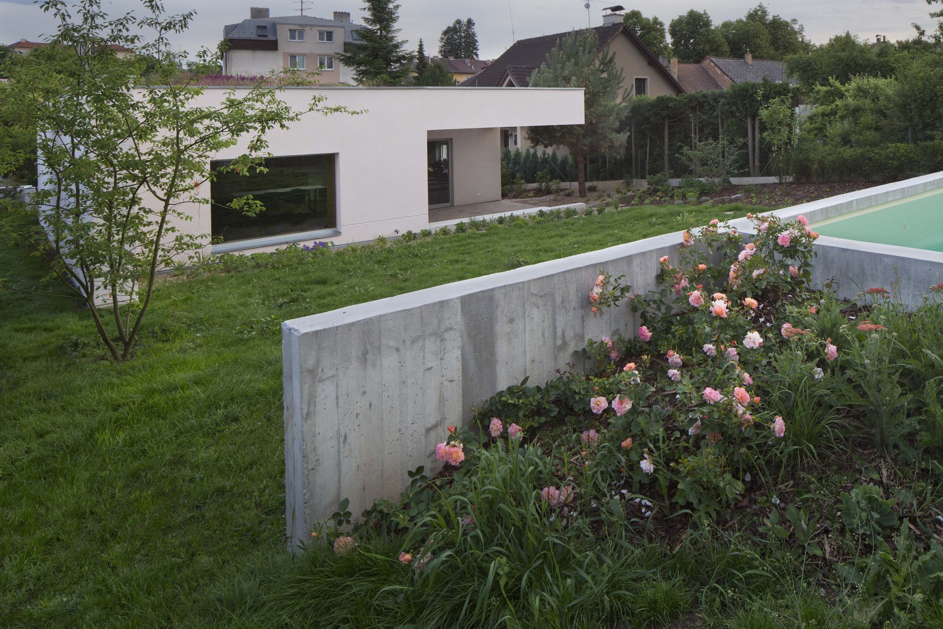 Pozdĺž hornej hrany pozemku je situovaný záhradný domček s terasou a vonkajším bazénom. Z terasy je vďaka prevýšeniu zachovaný priehľad ponad vegetačnú strechu na protiľahlý zelený svah Karlova. Priestorové a výškové osadenie stavby rozdeľuje záhradu na dve funkčné zóny.