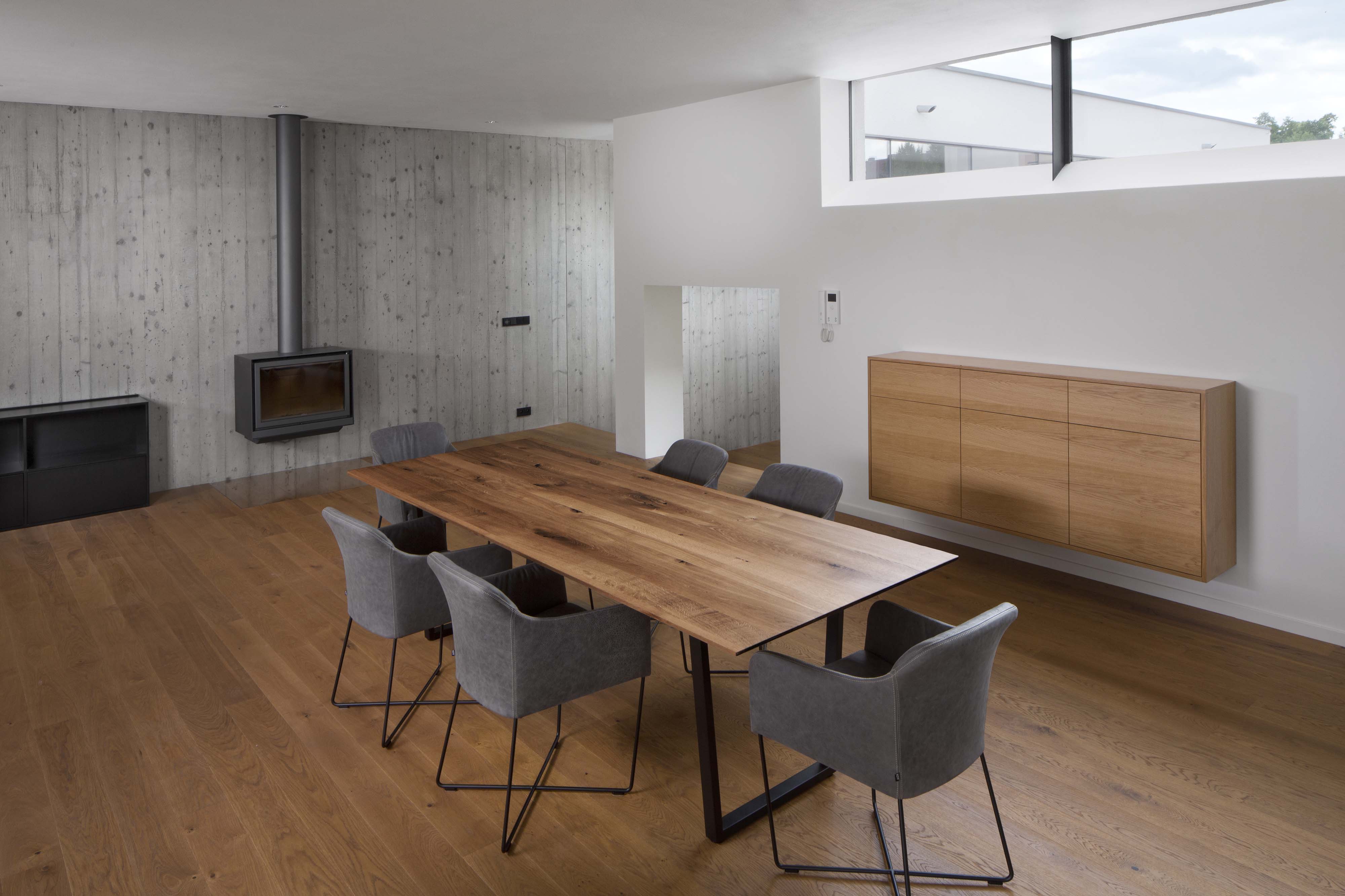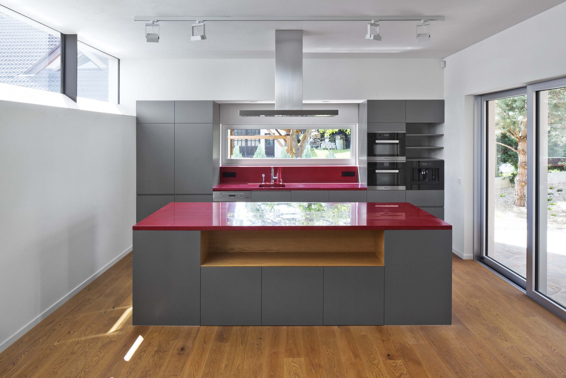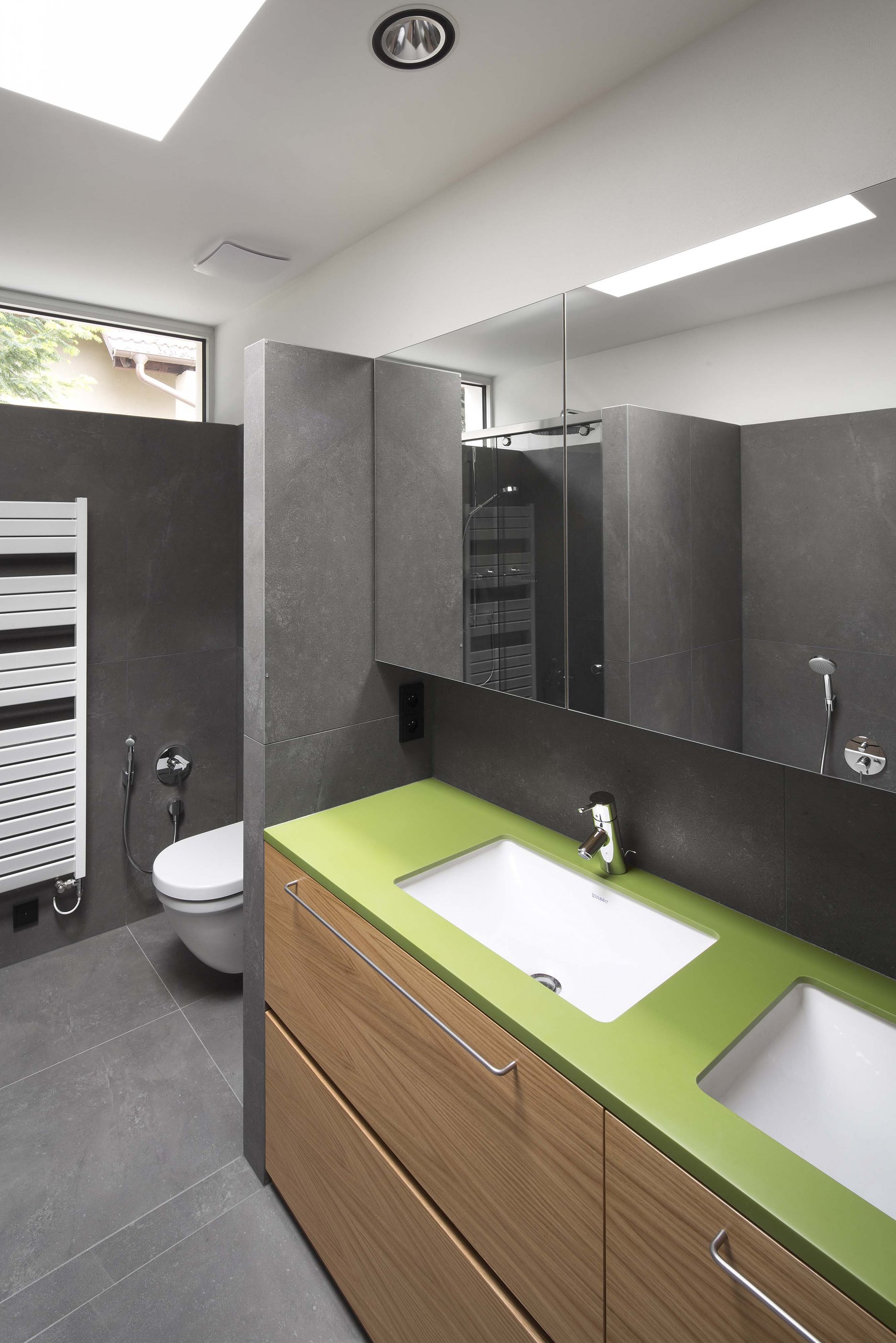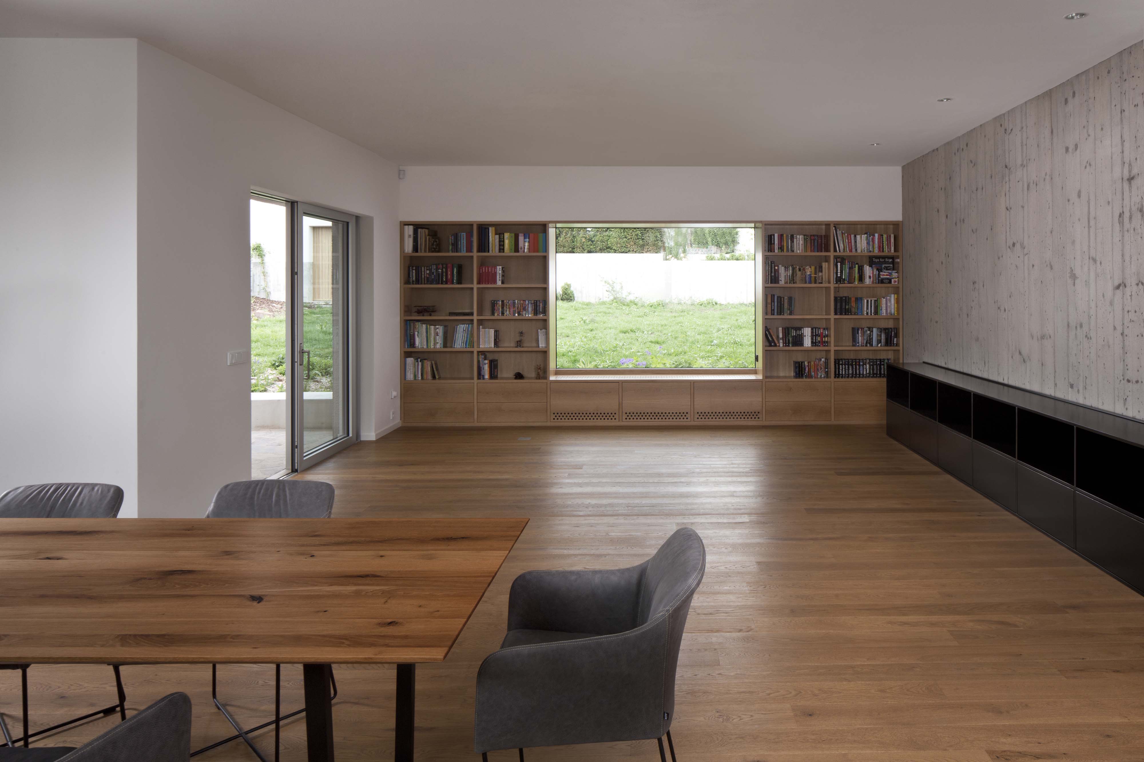 Konštrukčný systém zo zalievaných štiepkocementových tvaroviek Durisol je kombinovaný s monolitickými železobetónovými stropmi a stenou z pohľadového betónu, ktorá prebieha cez celý interiér. Na stene sú jasne viditeľné odtlačky debnenia, ktoré tvorili zvislé dosky šírky 20 centimetrov. Rovnakú “kresbu” má aj betón použitý na bazéne a "sokli" záhradného domu. Sivé hliníkové okná a bledá škrabaná omietka zapadajú do monochromatického stvárnenia exteriéru. Predpolie pred vstupom a terasa sú dláždené prírodným kameňom. Monochromatickú schému v interiéri oživuje dubová podlaha, nábytok a farebné povrchy v kuchyni a kúpeľni.
