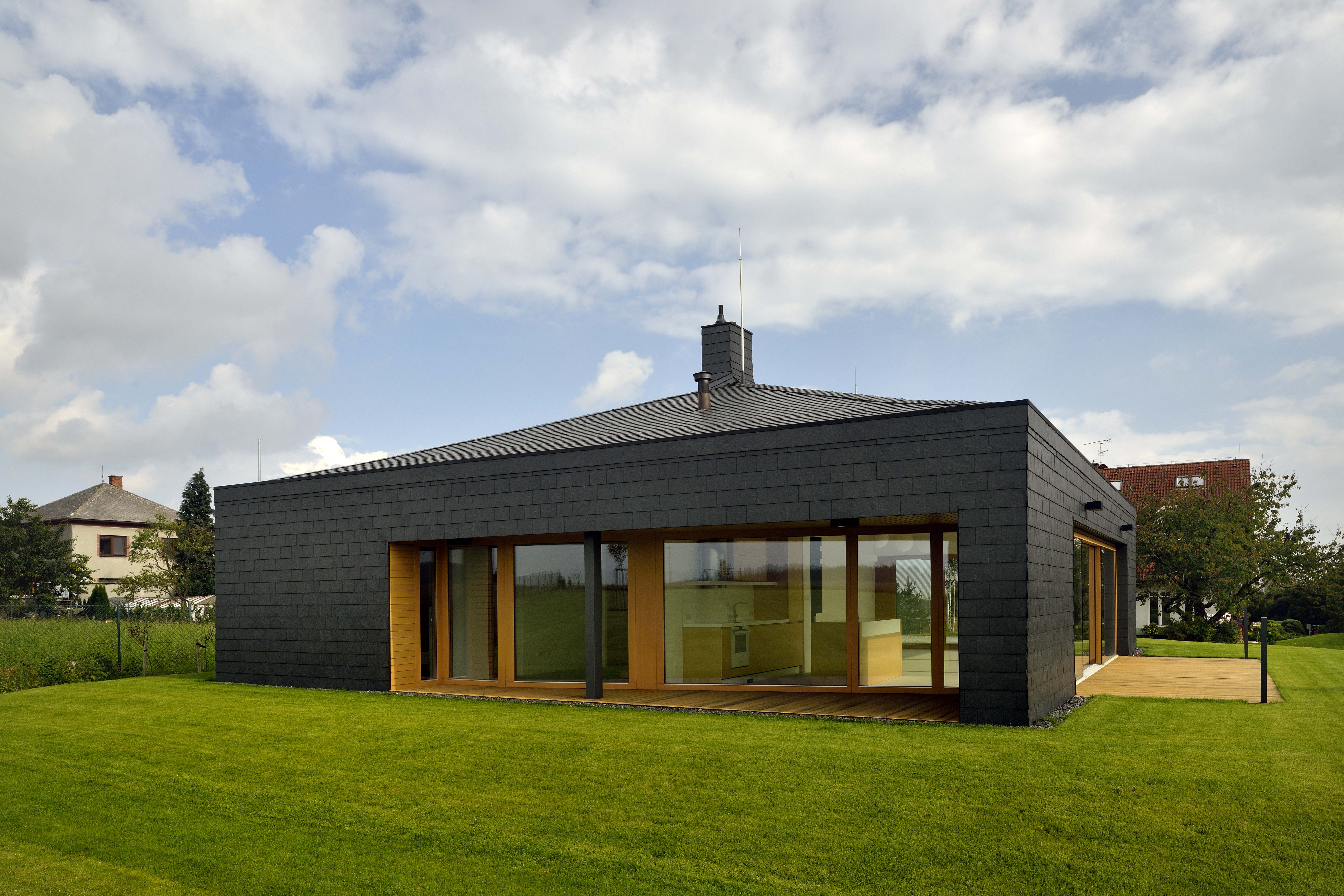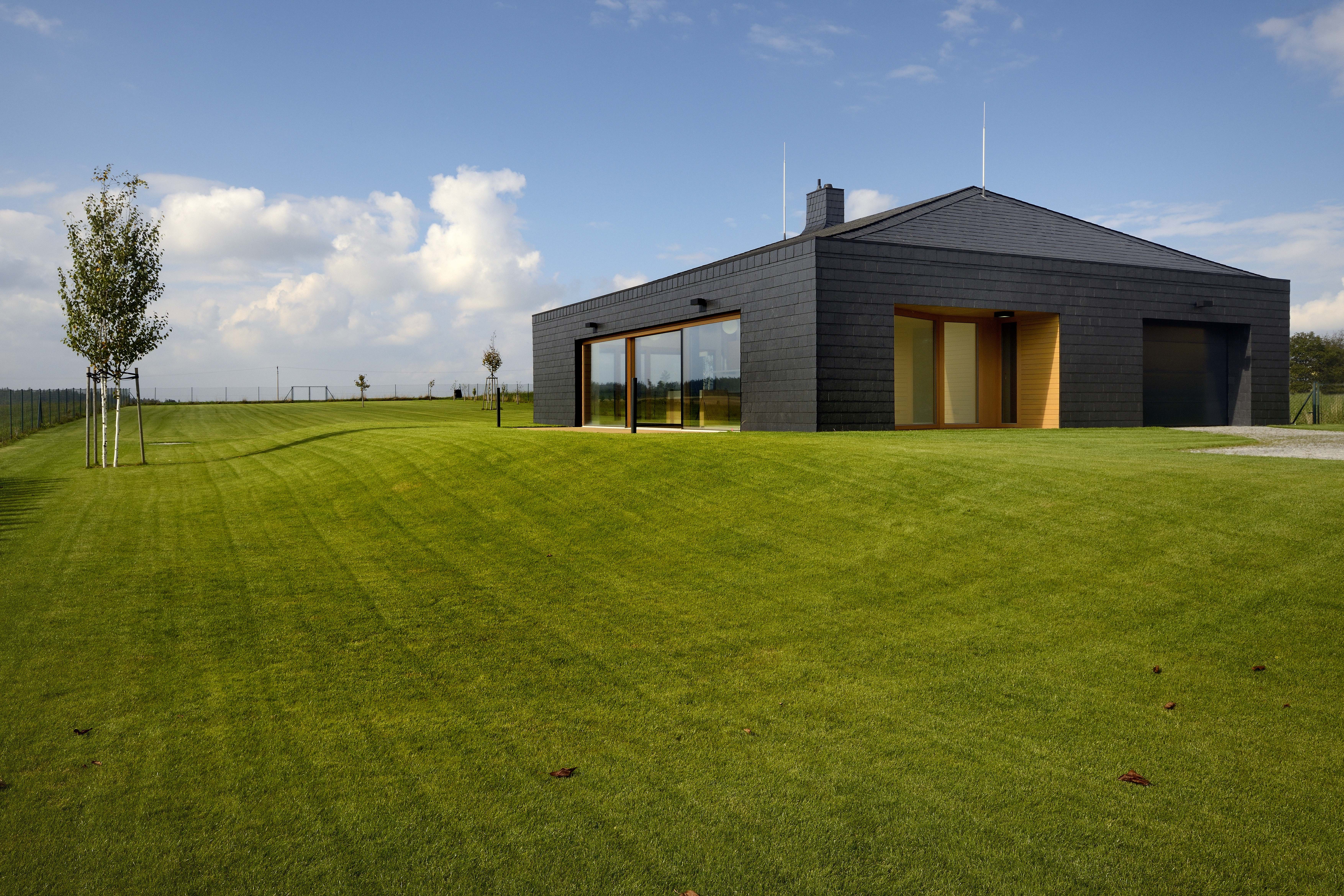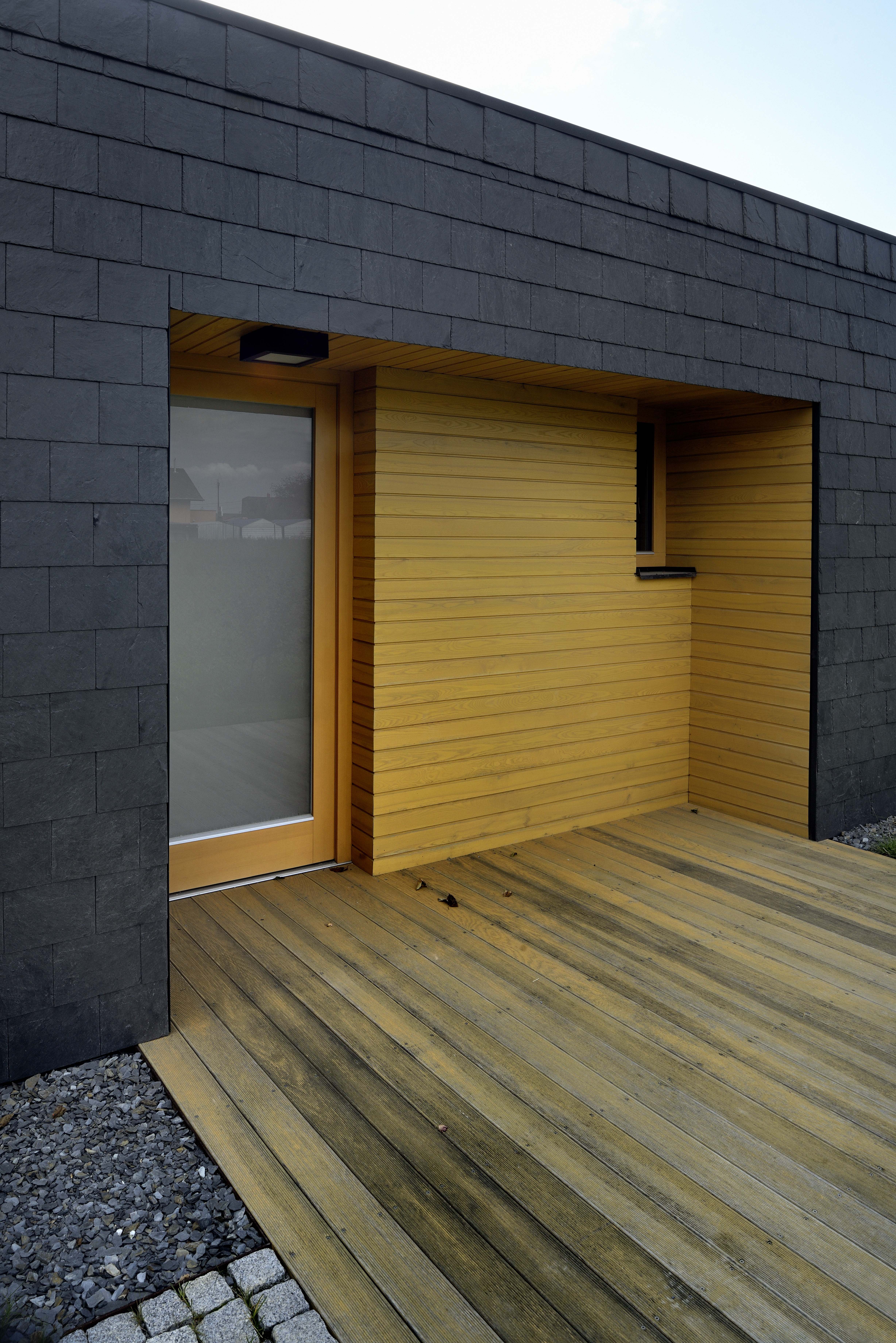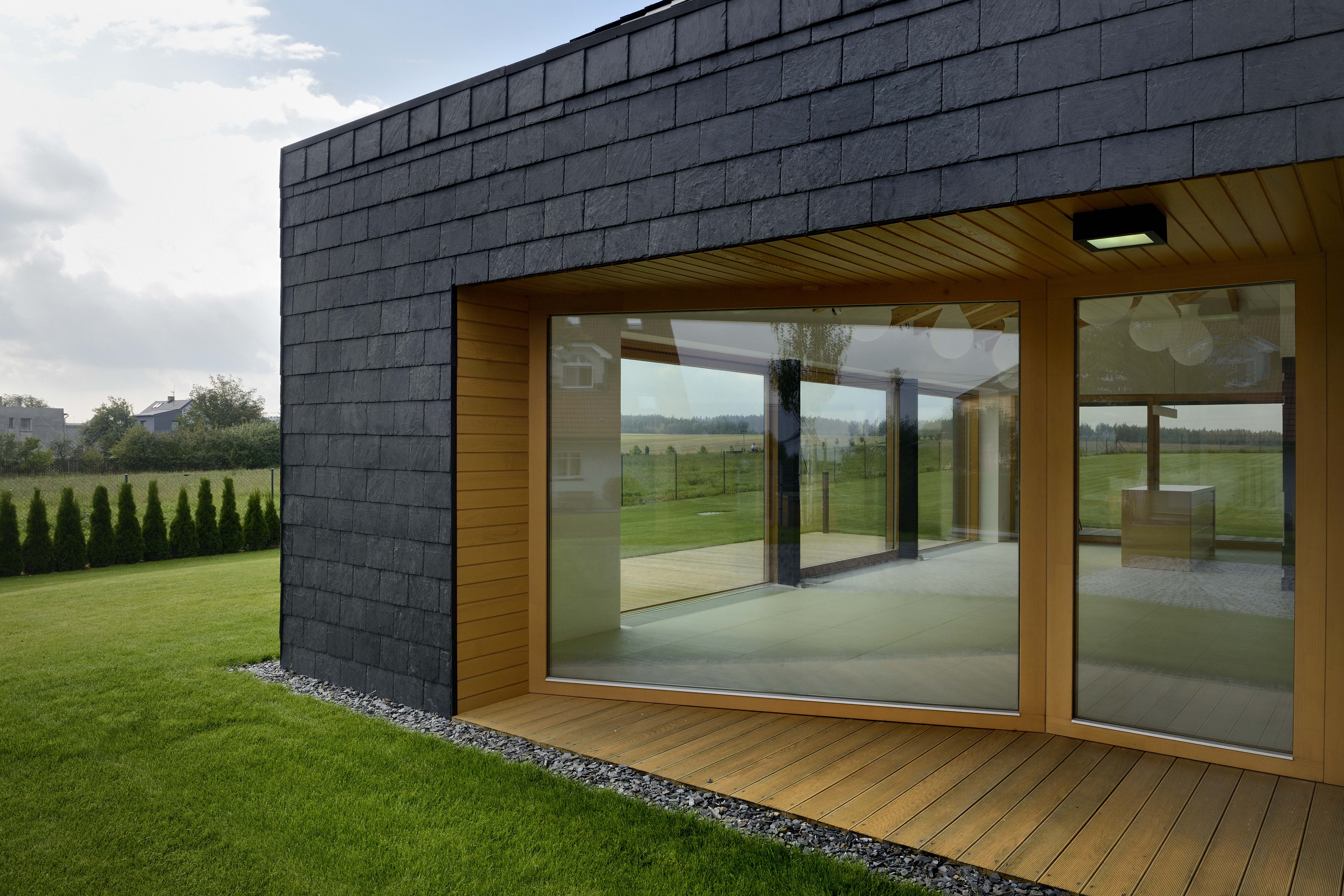 Dom je vymurovaný z keramických tvaroviek v kombinácii s oceľovými stĺpmi, Konštrukcia strechy je z lepených drevených väzníkov. Strechu aj fasádu pokrýva rovnaký materiál - bridlica. „Jde o materiál tolik typický pro tuto oblast, v okolí bylo několik malých břidlicových lomů,“ vysvetľuje architekt Tomáš Bindr.