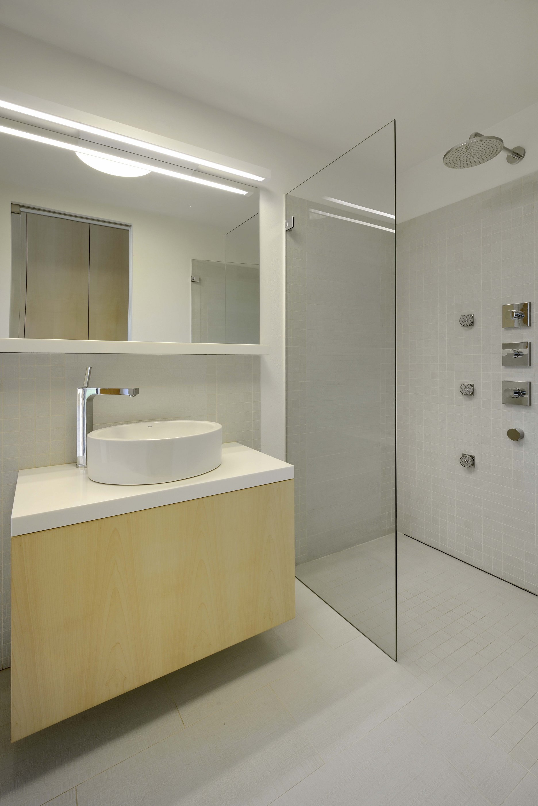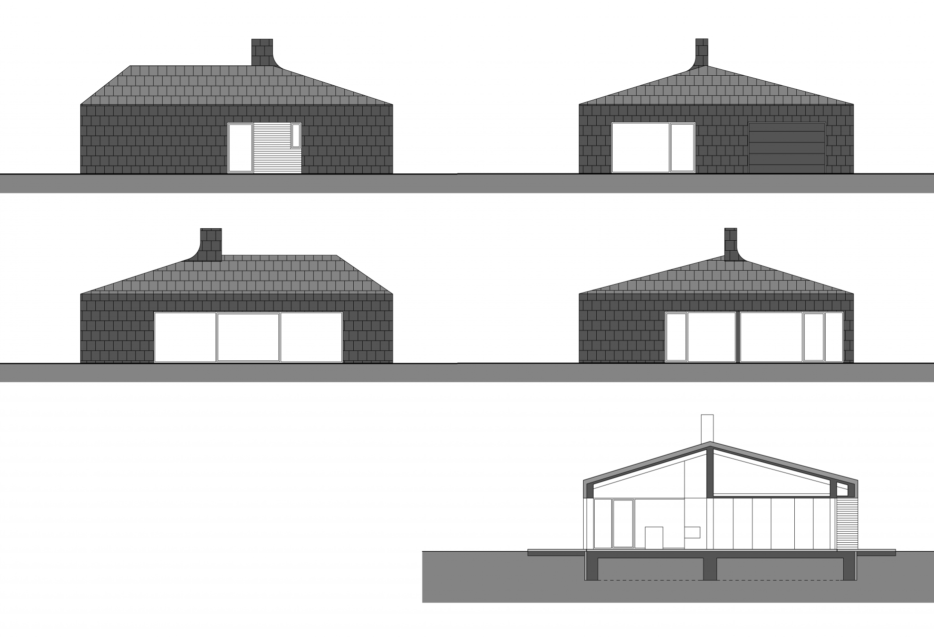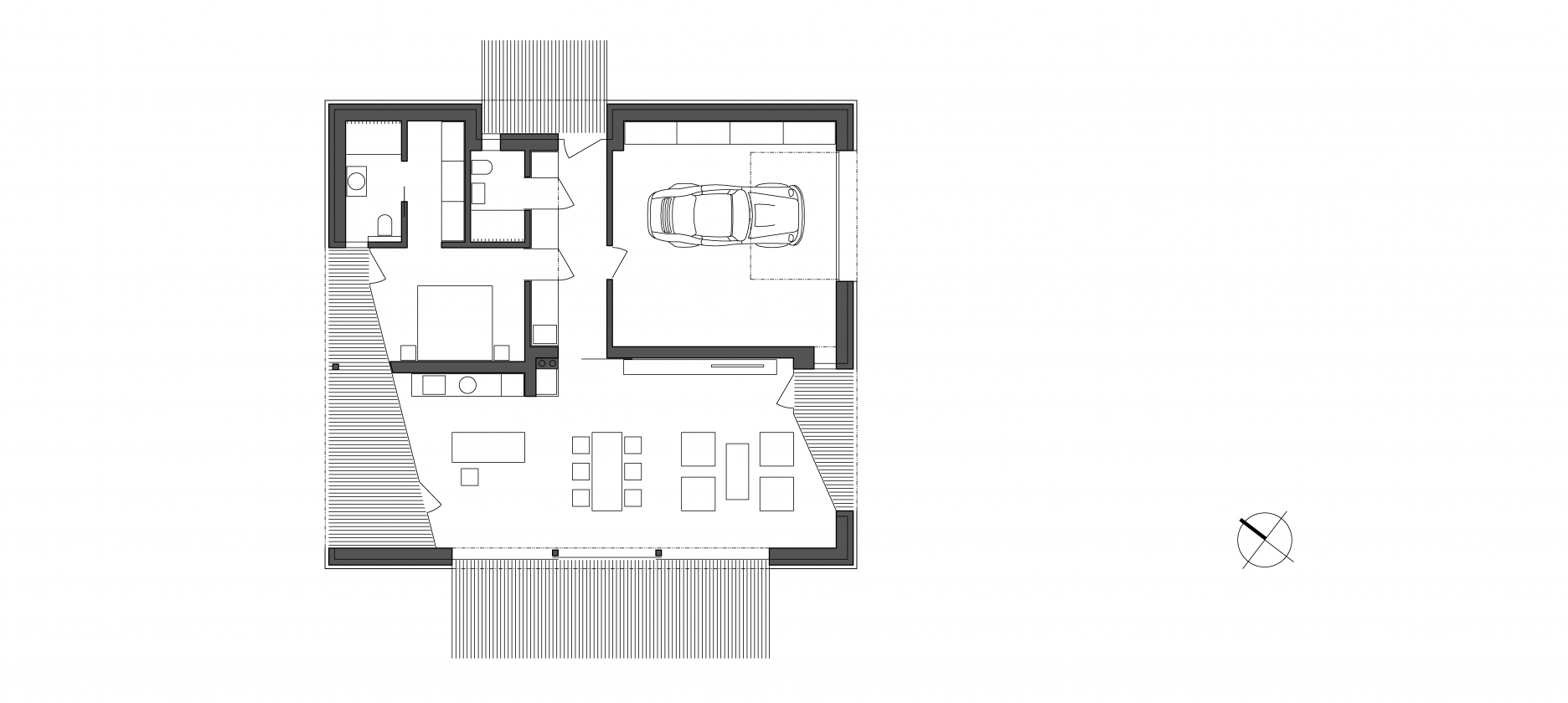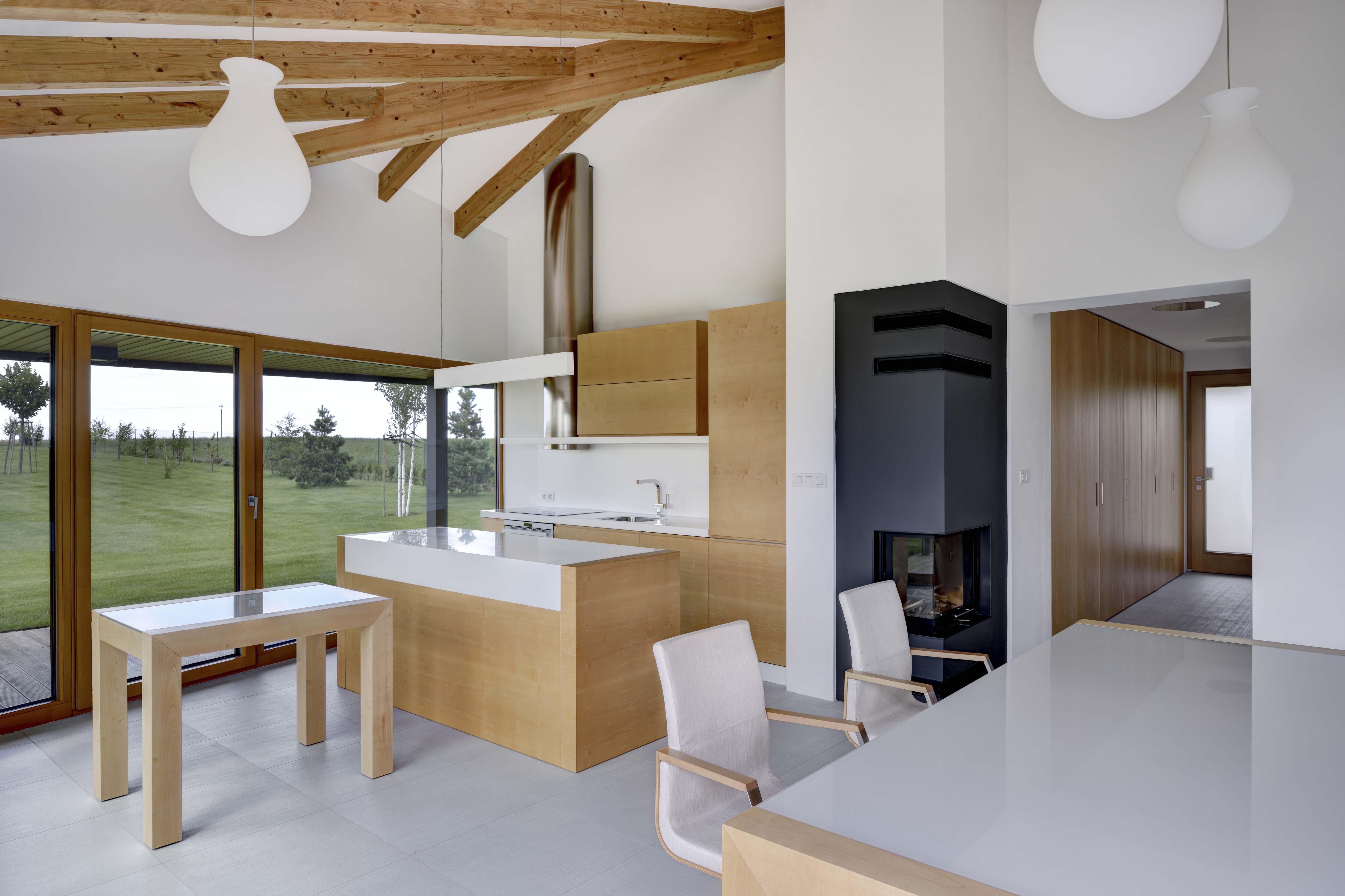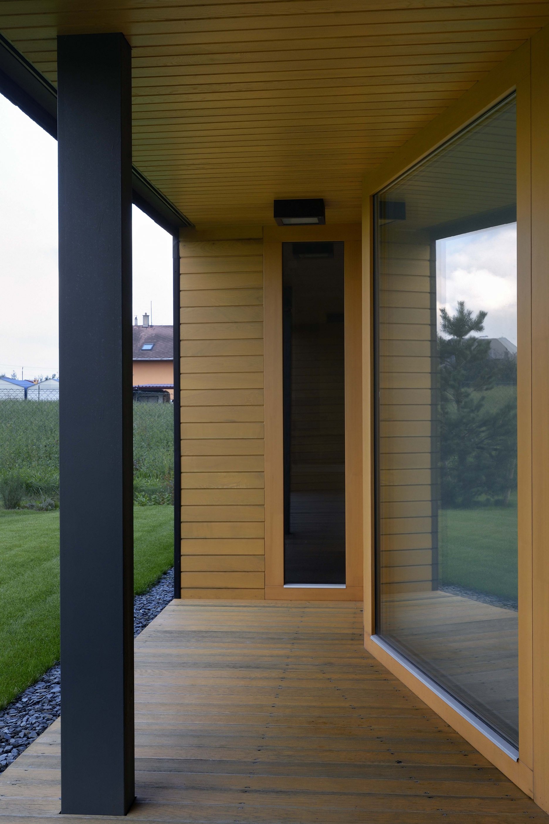 V juhovýchodnej časti domu sa nachádza hlavný obytný priestor, kombinovaný s jedálňou a kuchyňou. Z troch strán sa vstupuje na vonkajšie kryté terasy. Oproti garáži je situovaná spálňa, z ktorej taktiež vedú dvere na terasu, a dve kúpeľne. Jedna je prístupná zo vstupnej chodby a druhá zo spálne.