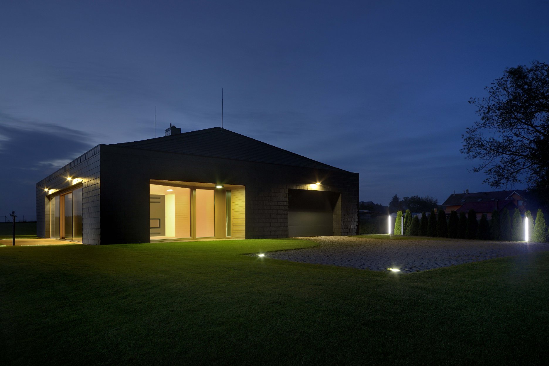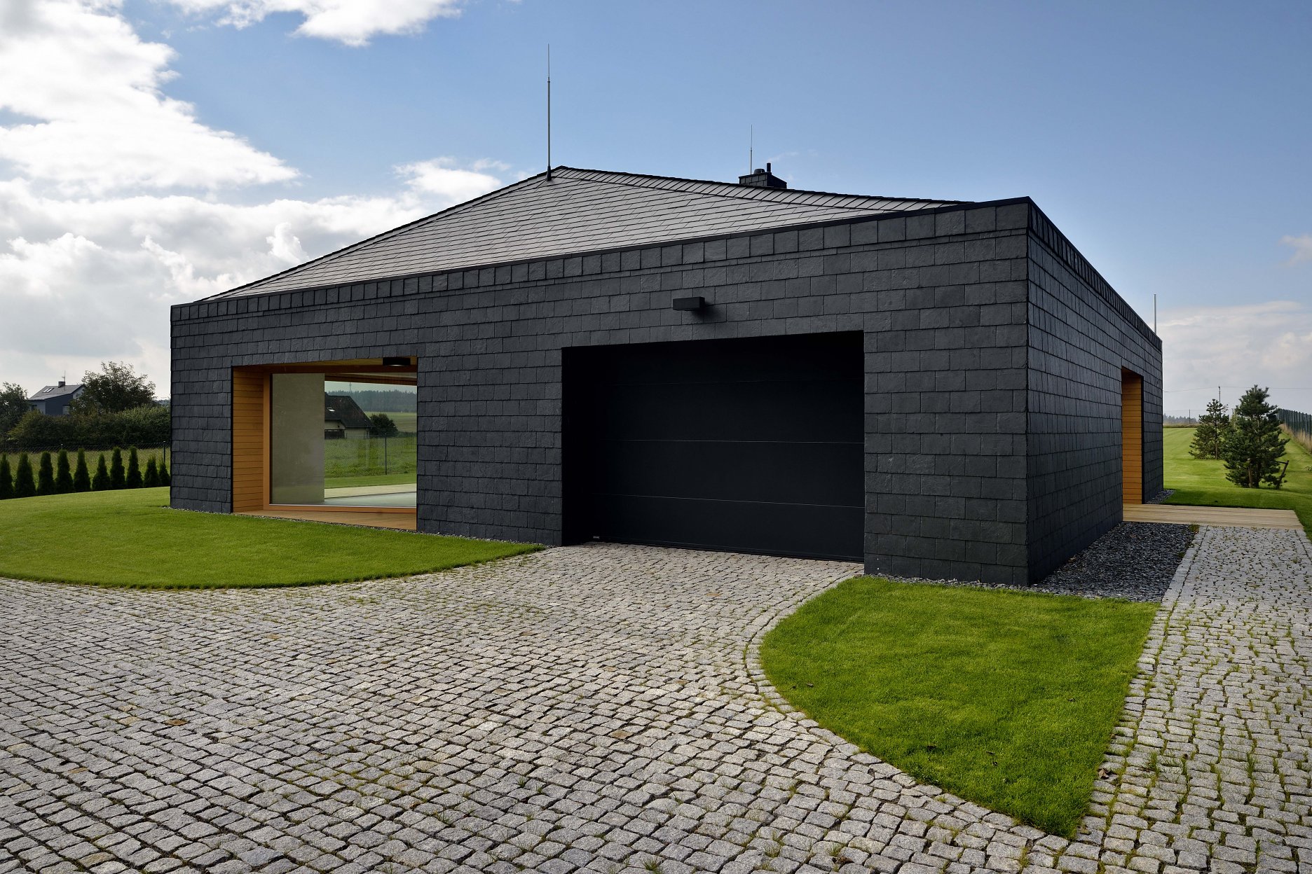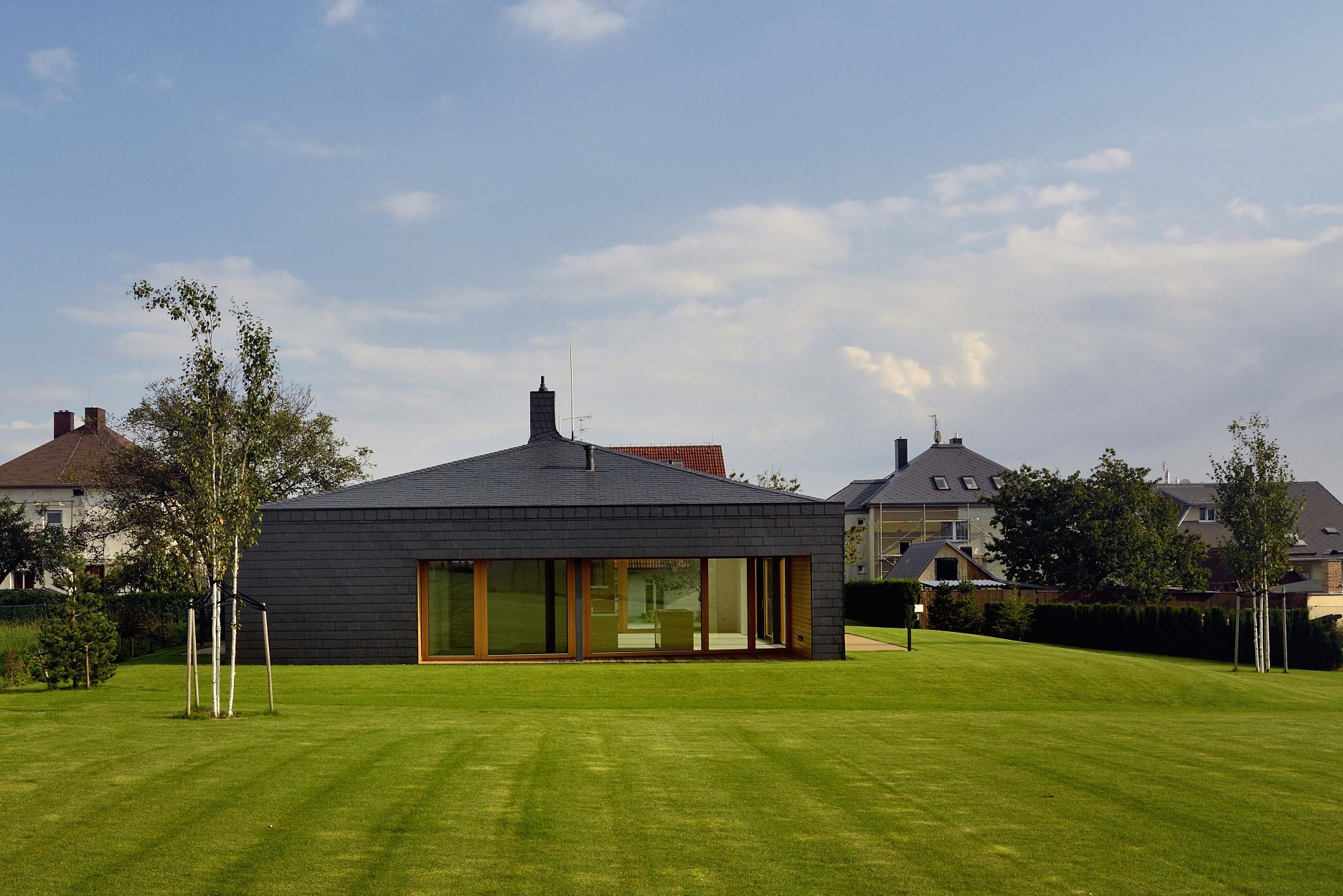 Striedanie bielej a čiernej pokračuje v záhrade so skupinami vysadených briez, ktorú navrhol záhradný architekt Lubomír Rychtar.