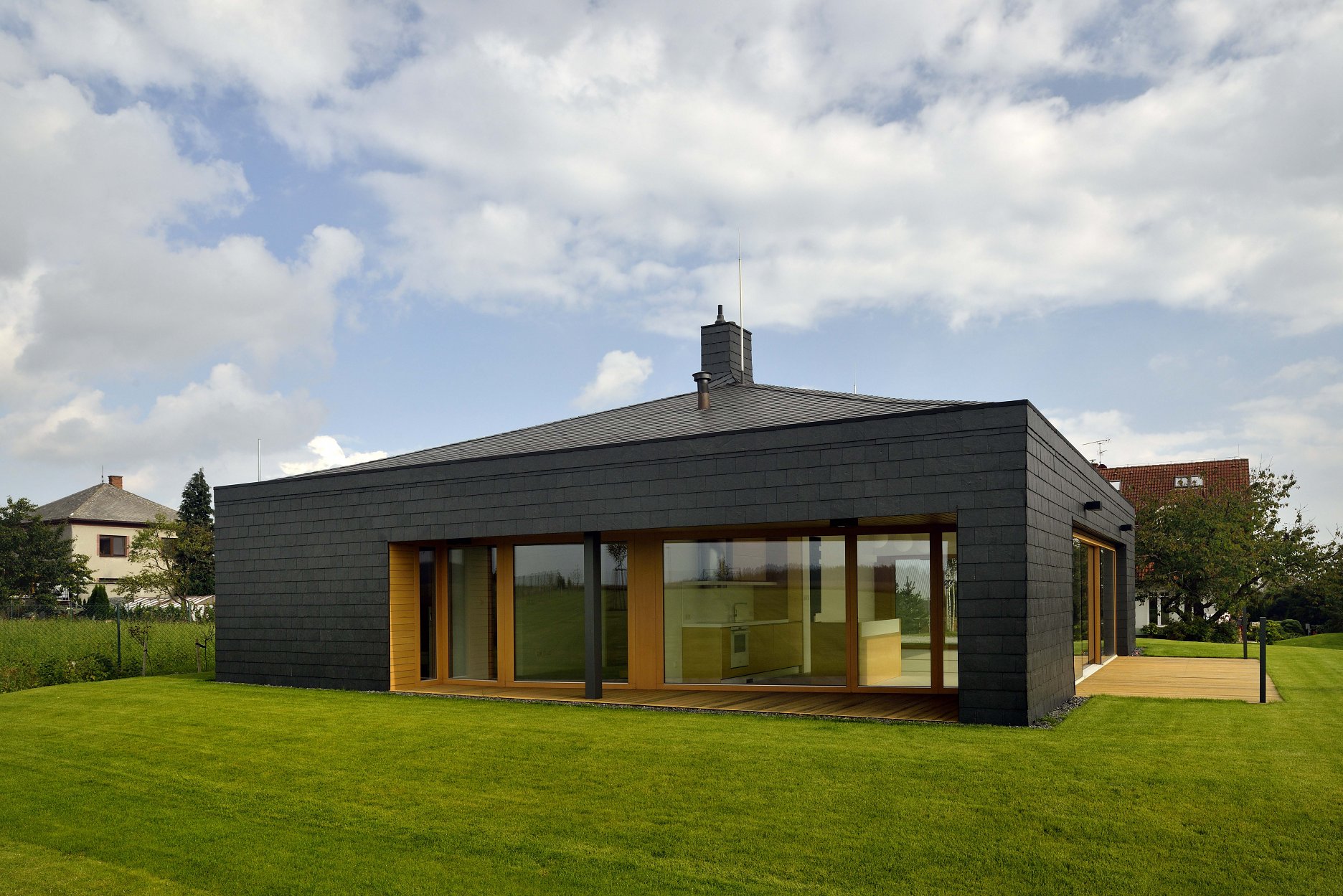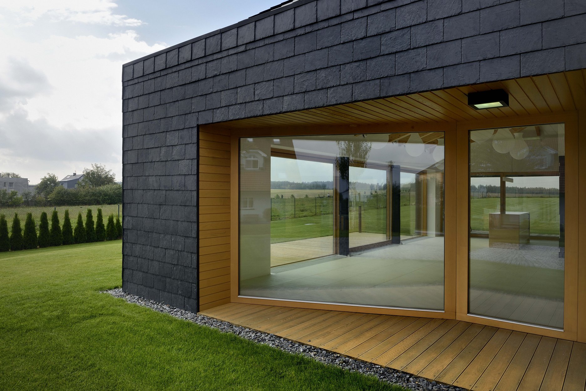 S antracitovým exteriérom výrazne kontrastuje svetlý interiér. Spojivom interiéru a exteriéru sa stalo drevo. Terasy a niky sú obložené palubovými doskami zo svetlého duba. Vstup je orientovaný na severozápad a vedie cez kryté závetrie do chodby, ktorá spája všetky miestnosti. Výraznú časť domu zaberá garáž, slúžiaca nielen na parkovanie, ale aj ako rozmerný úložný priestor.