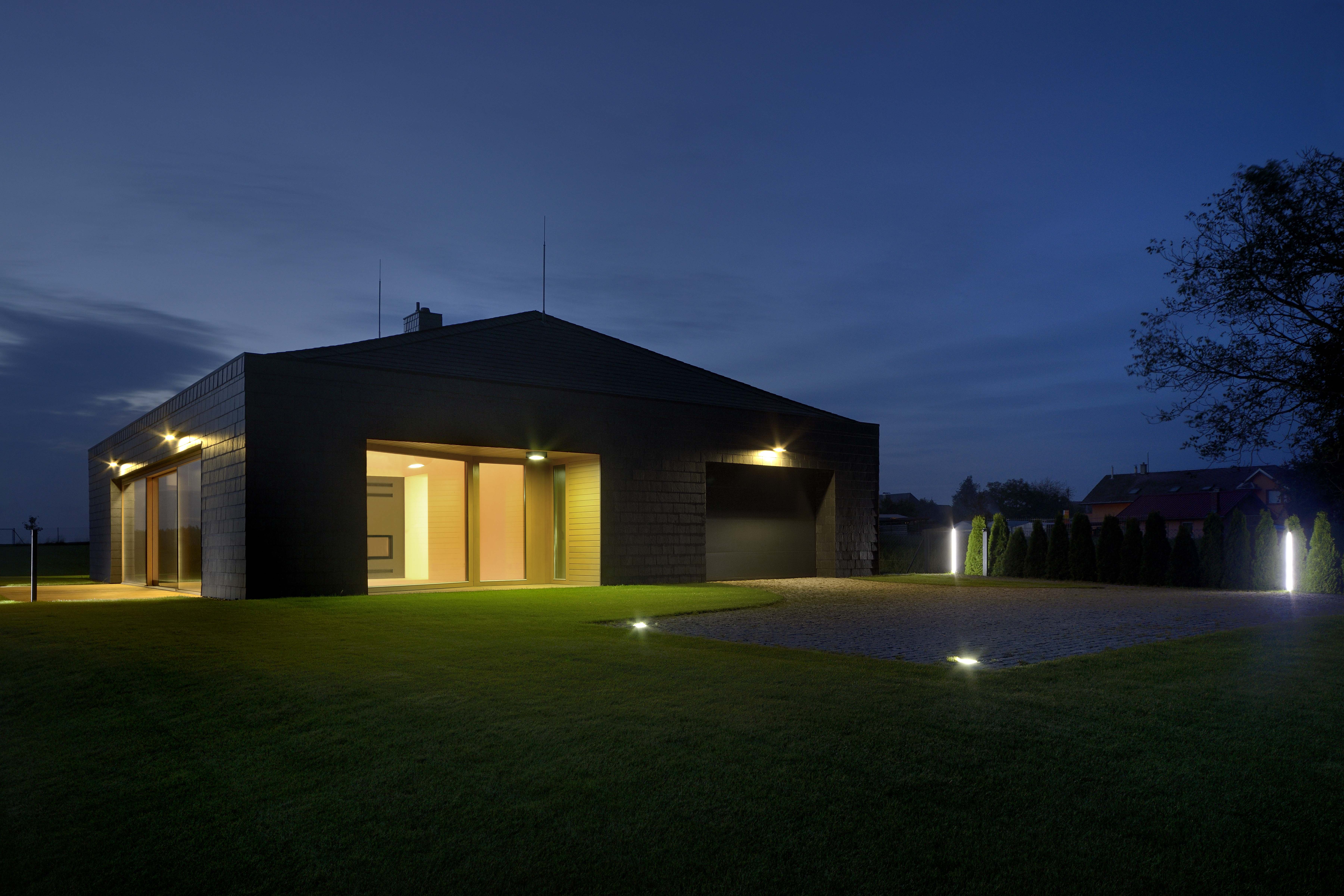 Rodinný dom pre manželský pár stojí na pomerne veľkej parcele. Mierne svahovitý pozemok sa nachádza v západnej časti obce, v profánnom území bez jednotného charakteru zástavby. Dom je solitérnou hmotou umiestnenou na trávniku. Iba dom a nič. Lapidárne, jednoduché, účinné. Oproti bežným, často zložitým a komplikovaným rodinným domom zaujme jeho elementárna geometrická forma a kompaktný tvar.